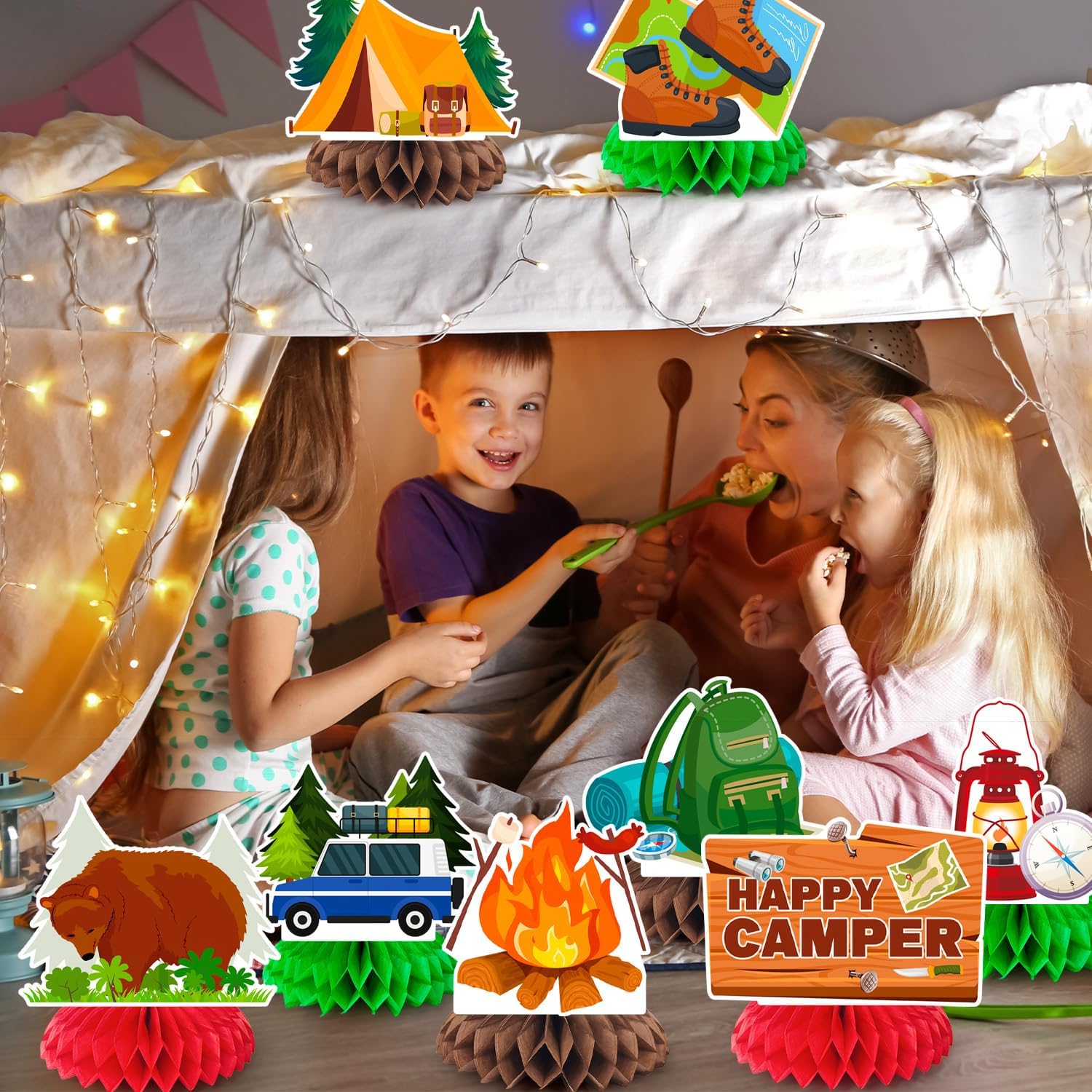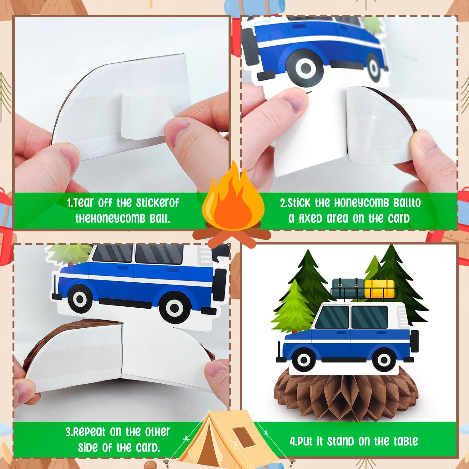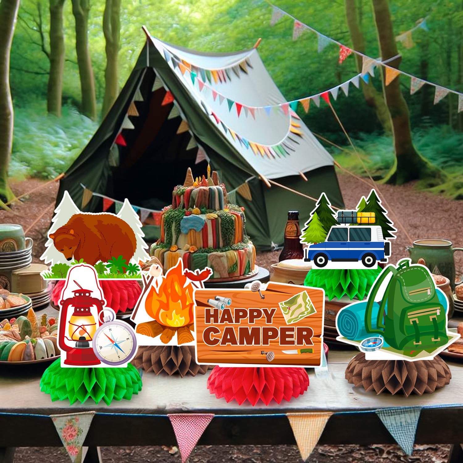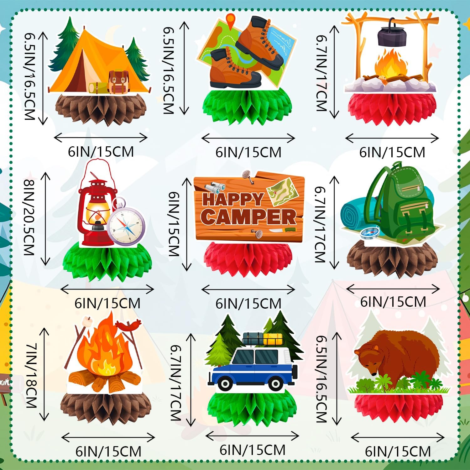 Set di decorazioni da campeggio: riceverai 9 pezzi di centrotavola a nido d'ape a tema campeggio e i diversi design di decorazioni per tavolo a tema campeggio possono facilmente soddisfare le diverse esigenze di decorazione durante la festa in campeggio. Design interessante: il centrotavola a nido d'ape da campeggio nelle forniture per feste da campeggio adotta elementi da campeggio ricchi e classici, come falò, bussola, tenda e altri modelli, che sono interessanti e accattivanti e possono facilmente creare una buona atmosfera per la tua festa a tema in campeggio. Facile da montare: basta piegare la base delle decorazioni da campeggio secondo la piega, quindi rimuovere l'adesivo del centrotavola a nido d'ape e potrai ottenere rapidamente bellissimi e squisiti centrotavola da campeggio. Qualità affidabile: questi centrotavola a nido d'ape Happy Camper sono realizzati con materiali di alta qualità e i colori delle decorazioni del tavolo da campeggio sono ancora vivaci anche dopo un uso esterno a lungo termine. Ampia applicazione: il centrotavola da campeggio a nido d'ape è adatto per feste a tema da campeggio, feste in giardino, picnic, barbecue, ecc., che possono aiutarti a creare sorprese e decorare bene le feste in campeggio.
