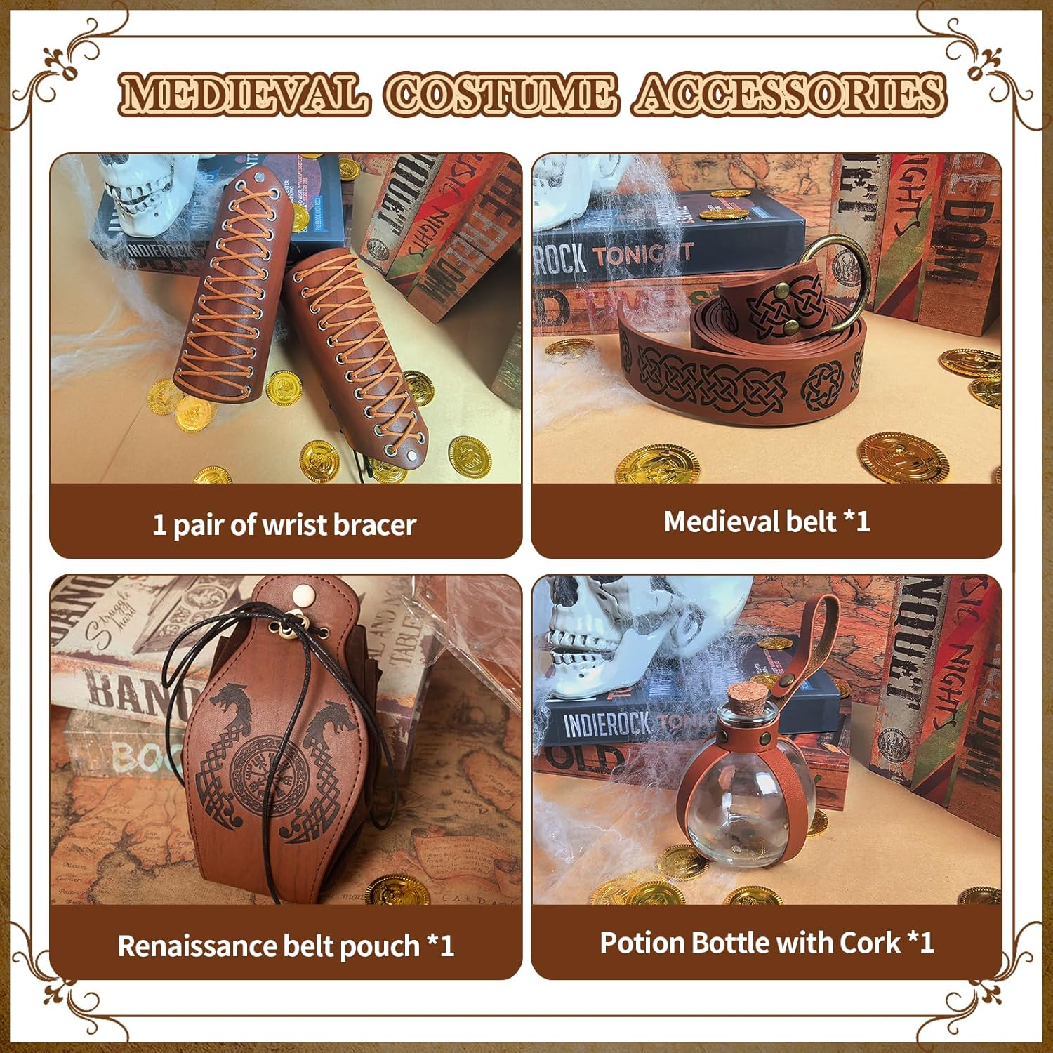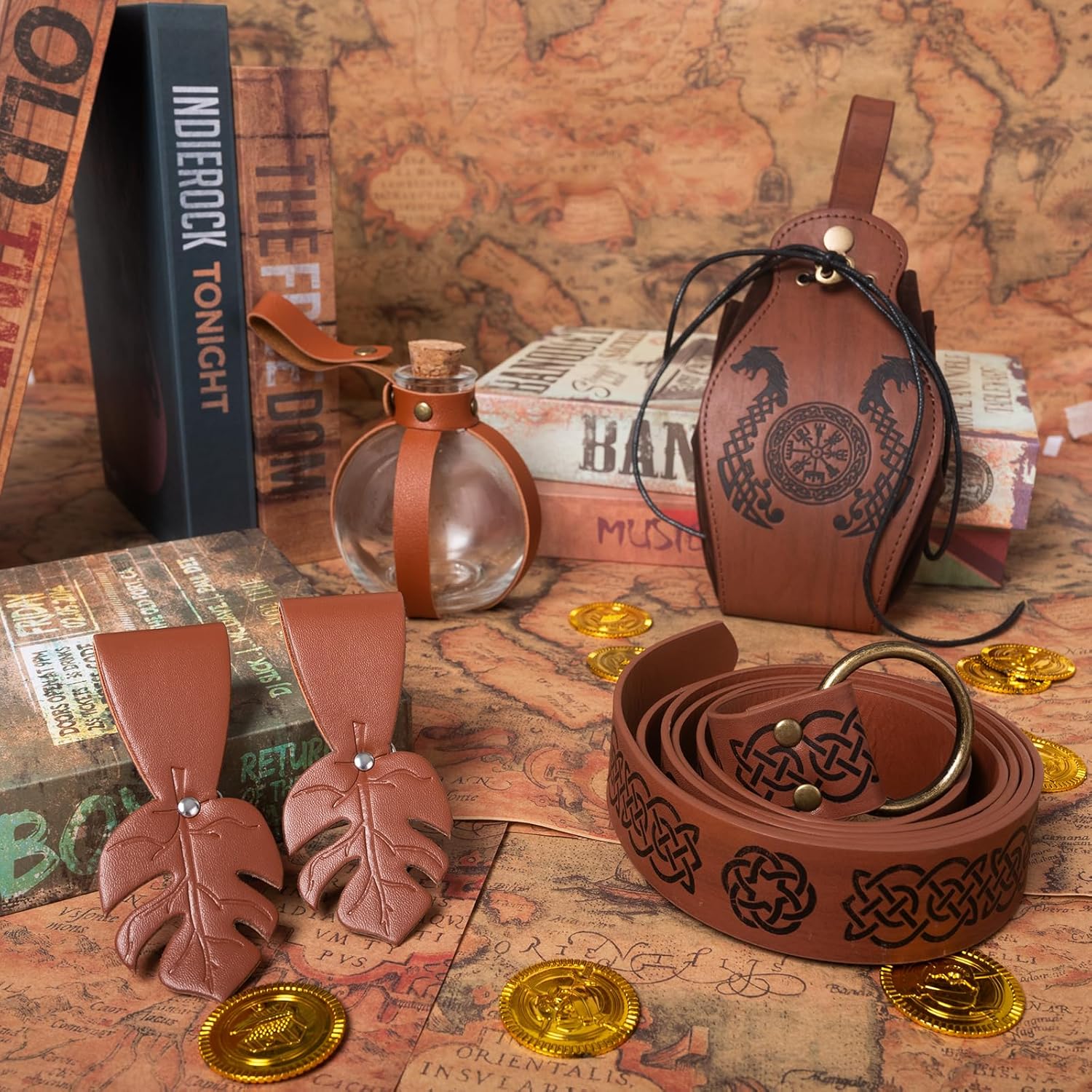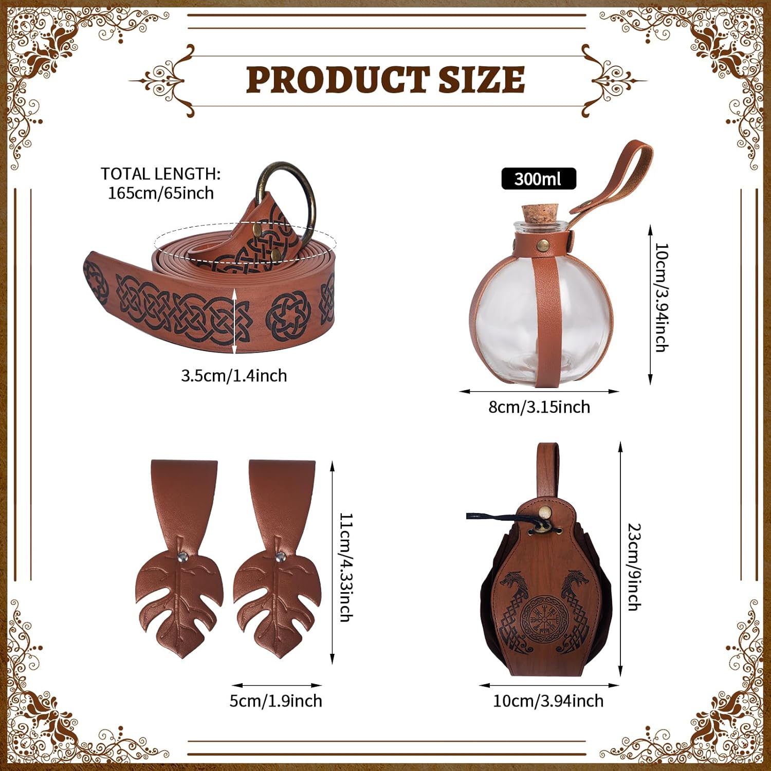 【Set costume medievale】: riceverete 1 cintura medievale, 1 fiaschetta per pozione magica, 2 passanti per cintura, 1 marsupio vintage, accessori sufficienti per soddisfare le vostre esigenze di set di costumi coordinati e decorativi. 【Materiale di qualità】: la cintura medievale e la borsa medievale sono realizzate in pelle PU di alta qualità, non facile da rompere e durevole. Più affidabili e non sbiadiscono o si rompono facilmente. 【Tappo rimovibile】: le bottiglie medievali sono realizzate in vetro trasparente e sferico. Ogni bottiglia ha un tappo di sughero rimovibile, puoi riempire la bottiglia con la tua miscela magica preferita di liquidi. 【Design regolabile】: è possibile combinare il marsupio in PU con il costume medievale da cavaliere per distinguersi alla festa. Le cinture sono regolabili per adattarsi a diverse altezze. può essere tagliato in base alla propria taglia della vita o provare metodi di nodo medievale, il design regolabile ti offre comfort. 【Adatto per molte occasioni】: questi accessori in stile rinascimentale sono perfetti per circo rinascimentale, carnevale, spettacoli teatrali, spettacoli di palcoscenici, eventi fantasy, feste di cavalieri, feste in costume, spettacoli teatrali, feste di compleanno, feste di ruolo, ecc. e garantiscono più divertimento.