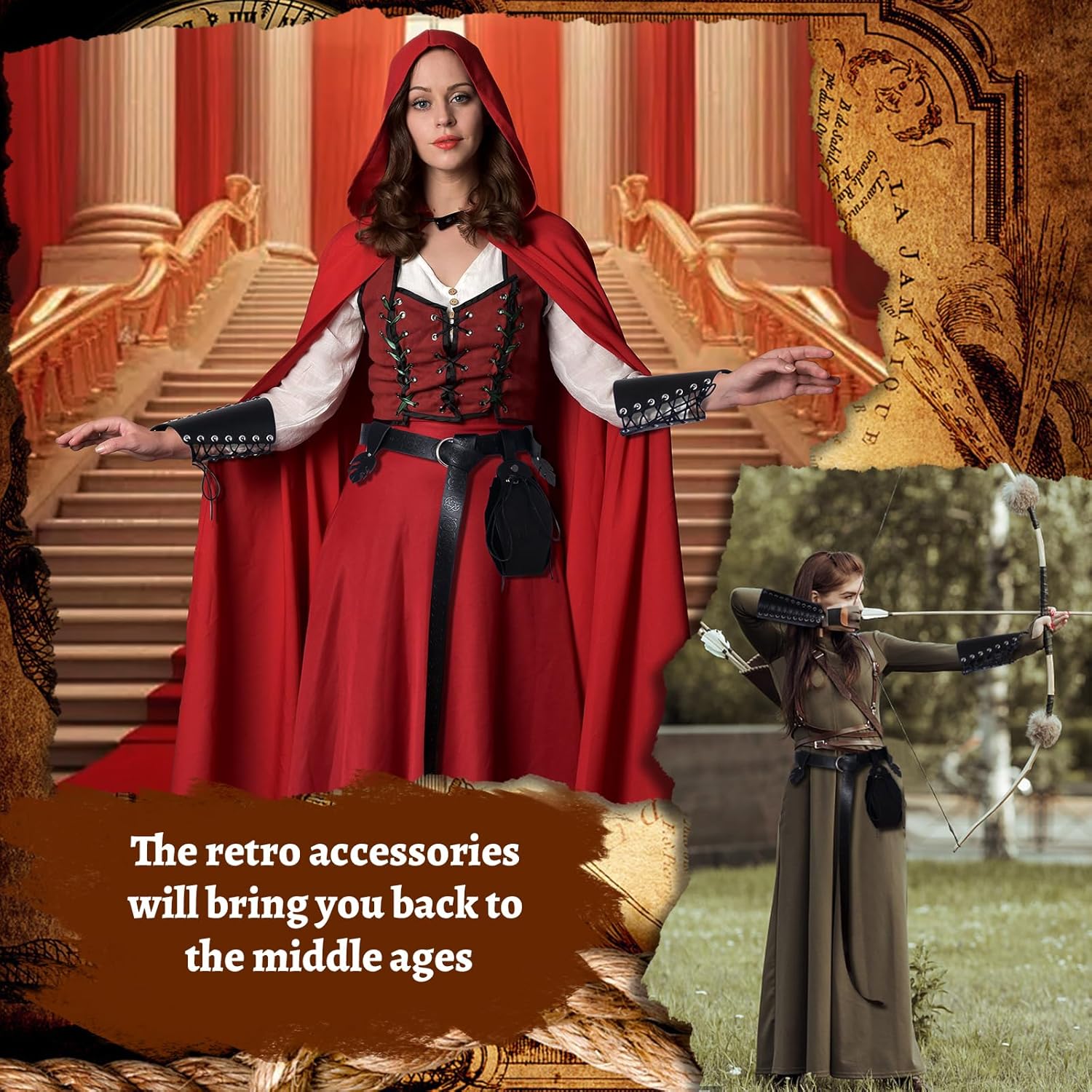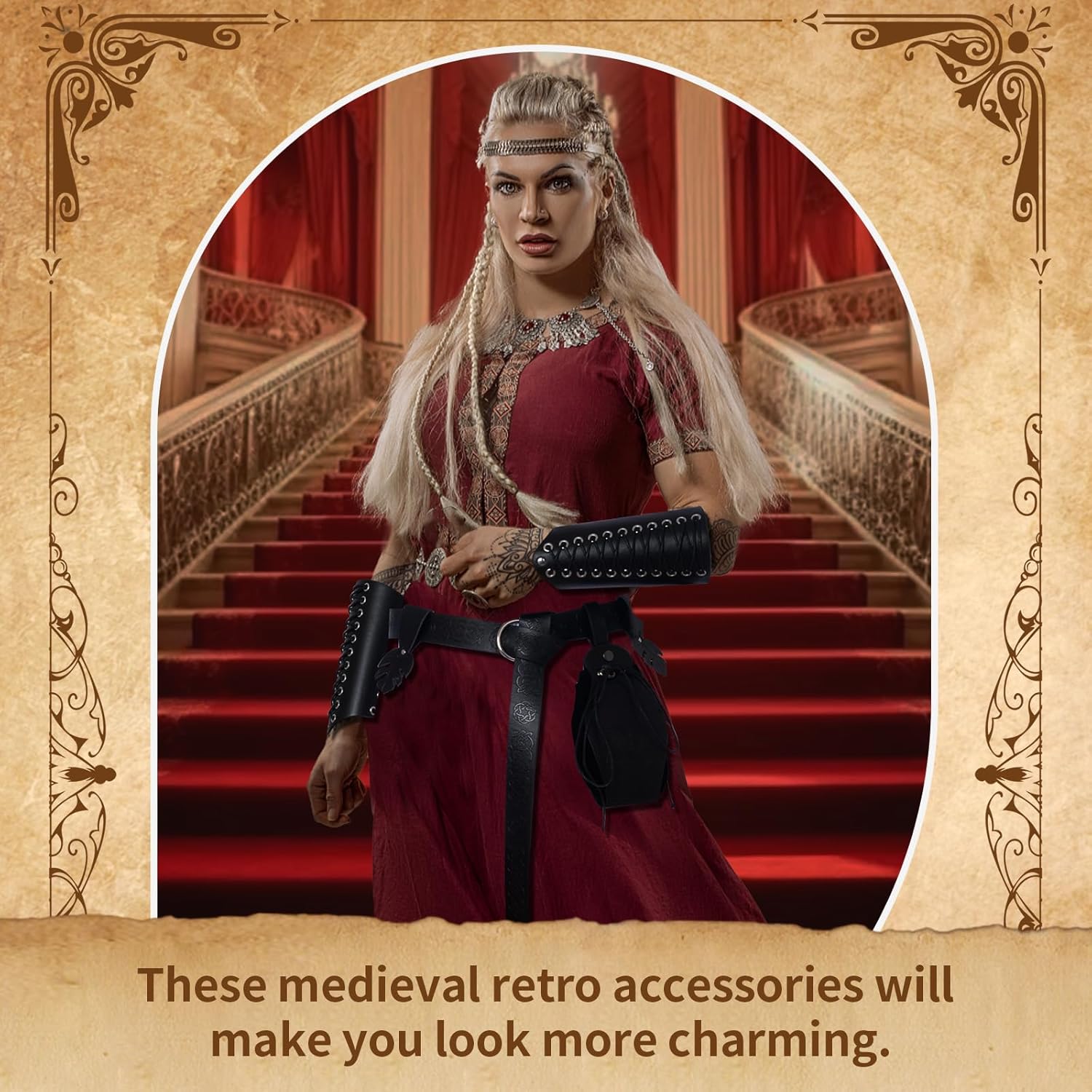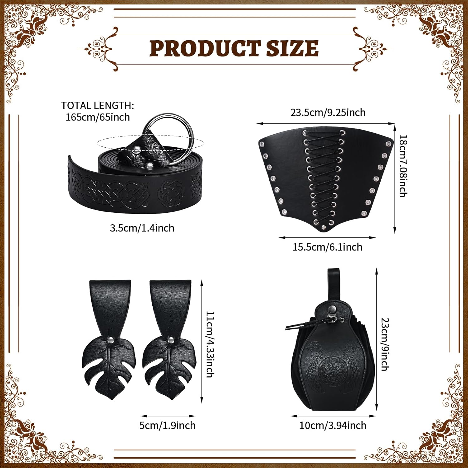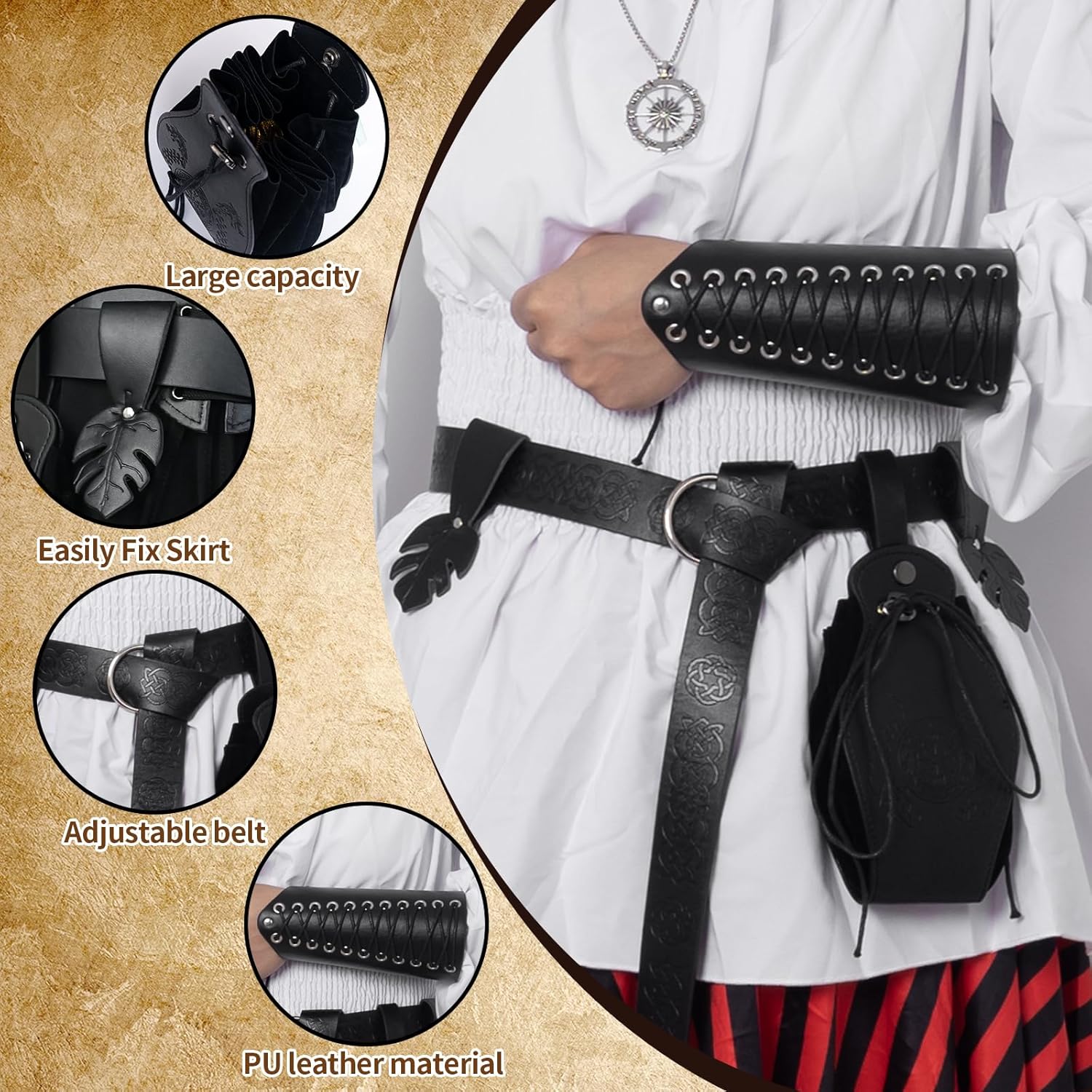 【Set costume medievale】: riceverete 1 cintura medievale, 2 fasce per bracciale, 2 passanti per cintura, 1 marsupio vintage, accessori sufficienti per soddisfare le vostre esigenze di set di costumi coordinati e decorativi. 【Materiale di qualità】: la cintura medievale e la borsa medievale sono realizzate in pelle PU di alta qualità, non facile da rompere e durevole. Più affidabili e non sbiadiscono o si rompono facilmente. 【Combinazione unica】: in combinazione con vestiti vichinghi, cinture, marsupi e polsiere, puoi creare un look classico retrò. È come un viaggio nel tempo che ti riporta al Medioevo e aggiunge più divertimento e fascino alle varie feste. 【Design regolabile】: è possibile combinare il marsupio in PU con il costume medievale da cavaliere per distinguersi alla festa. Le cinture sono regolabili per adattarsi a diverse altezze. può essere tagliato in base alla propria taglia della vita o provare metodi di nodo medievale, il design regolabile ti offre comfort. 【Adatto per molte occasioni】: questi accessori in stile rinascimentale sono perfetti per circo rinascimentale, carnevale, spettacoli teatrali, spettacoli di palcoscenici, eventi fantasy, feste di cavalieri, feste in costume, spettacoli teatrali, feste di compleanno, feste di ruolo, ecc. e garantiscono più divertimento.