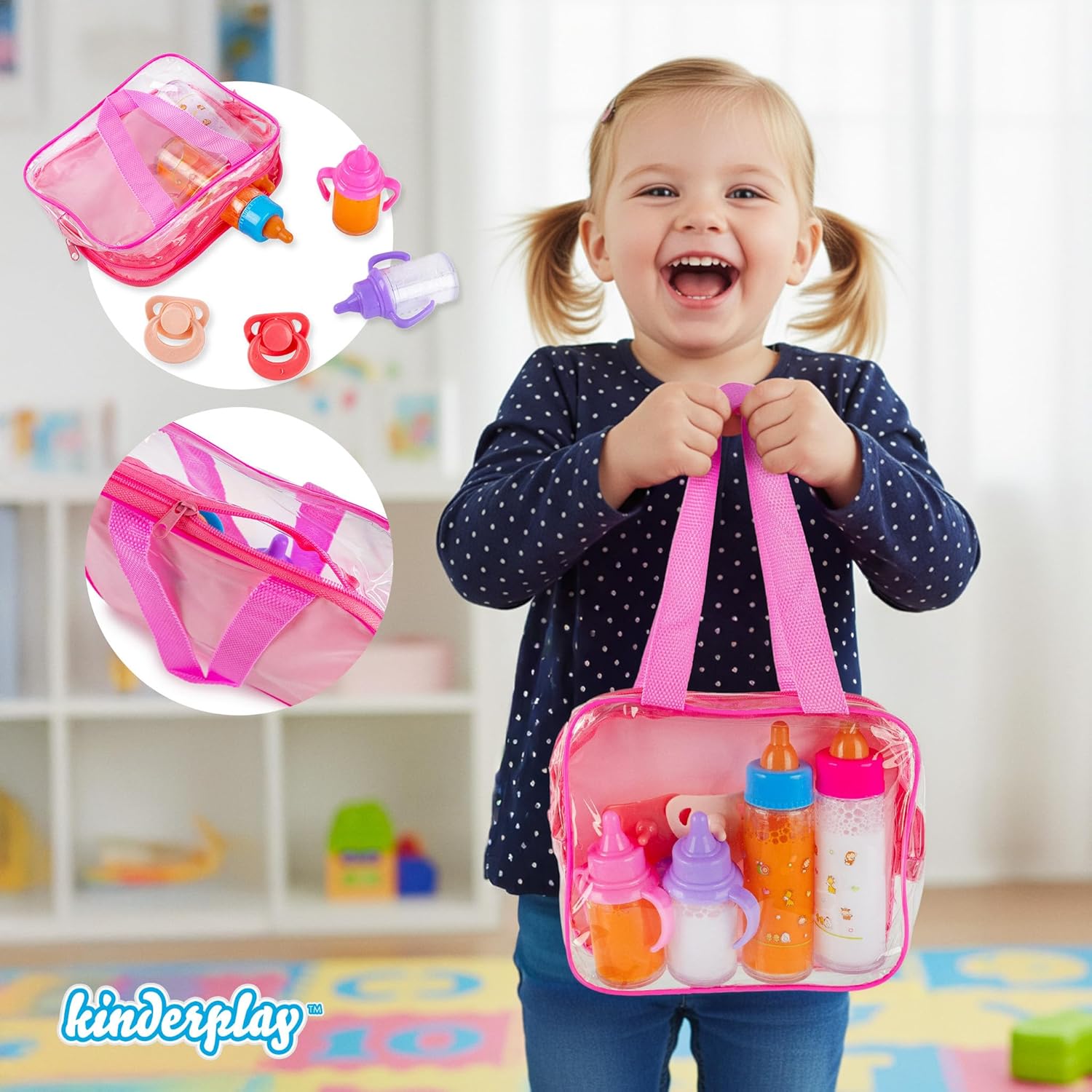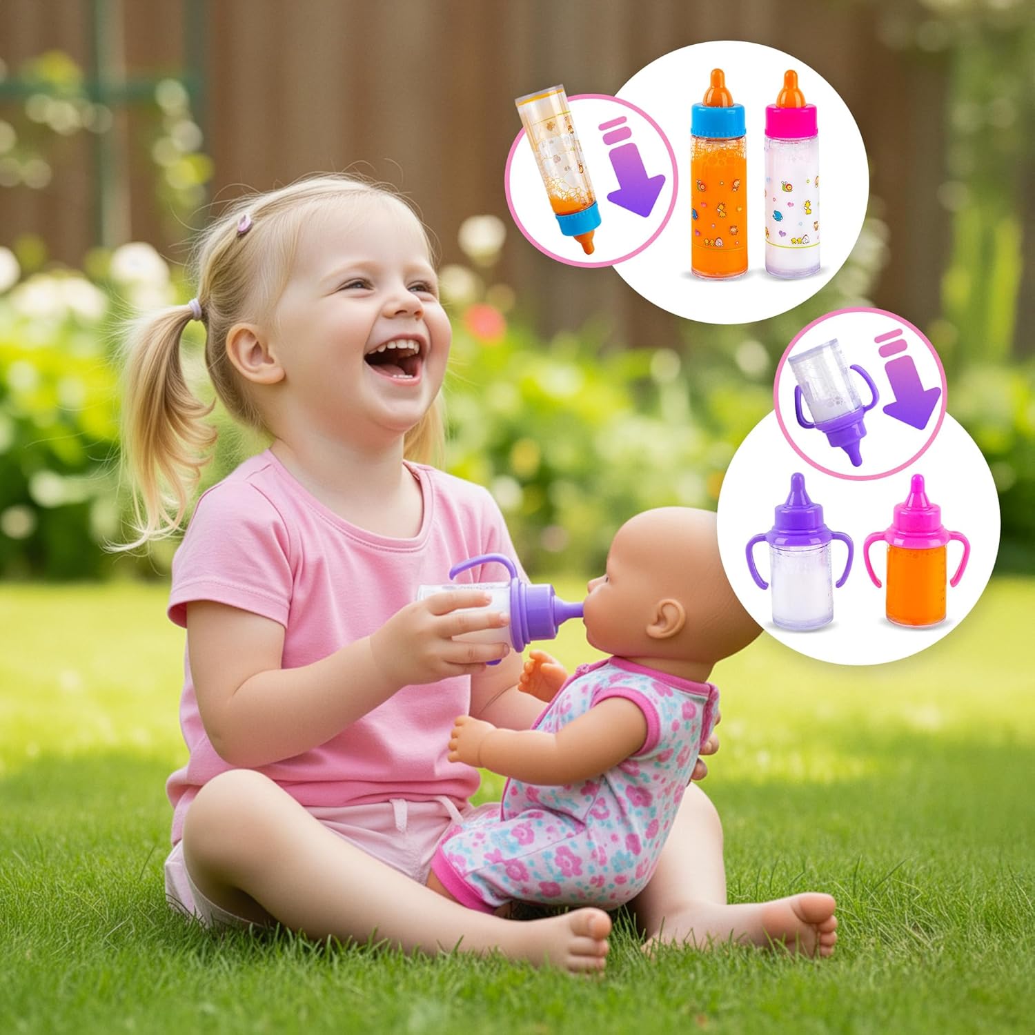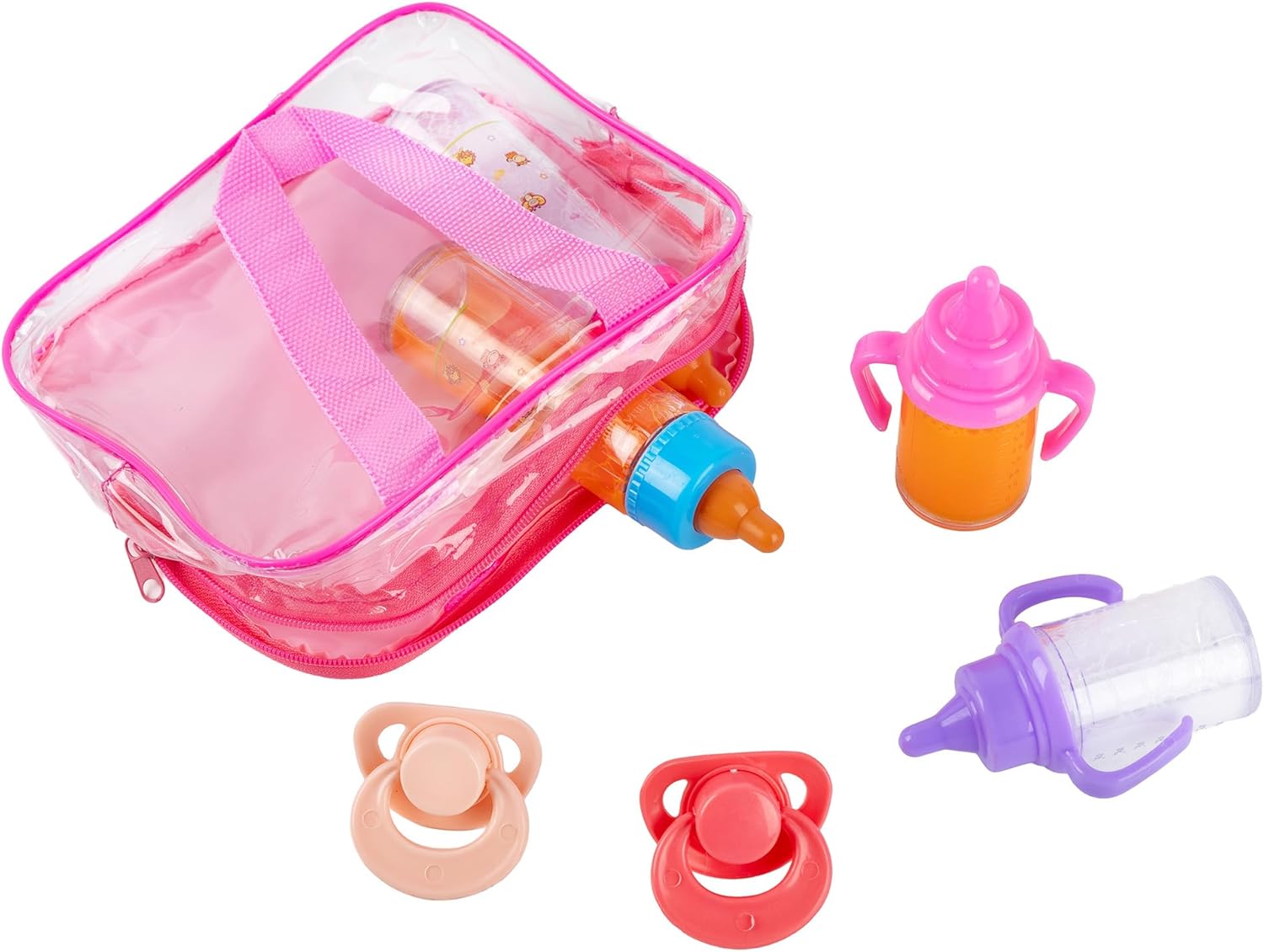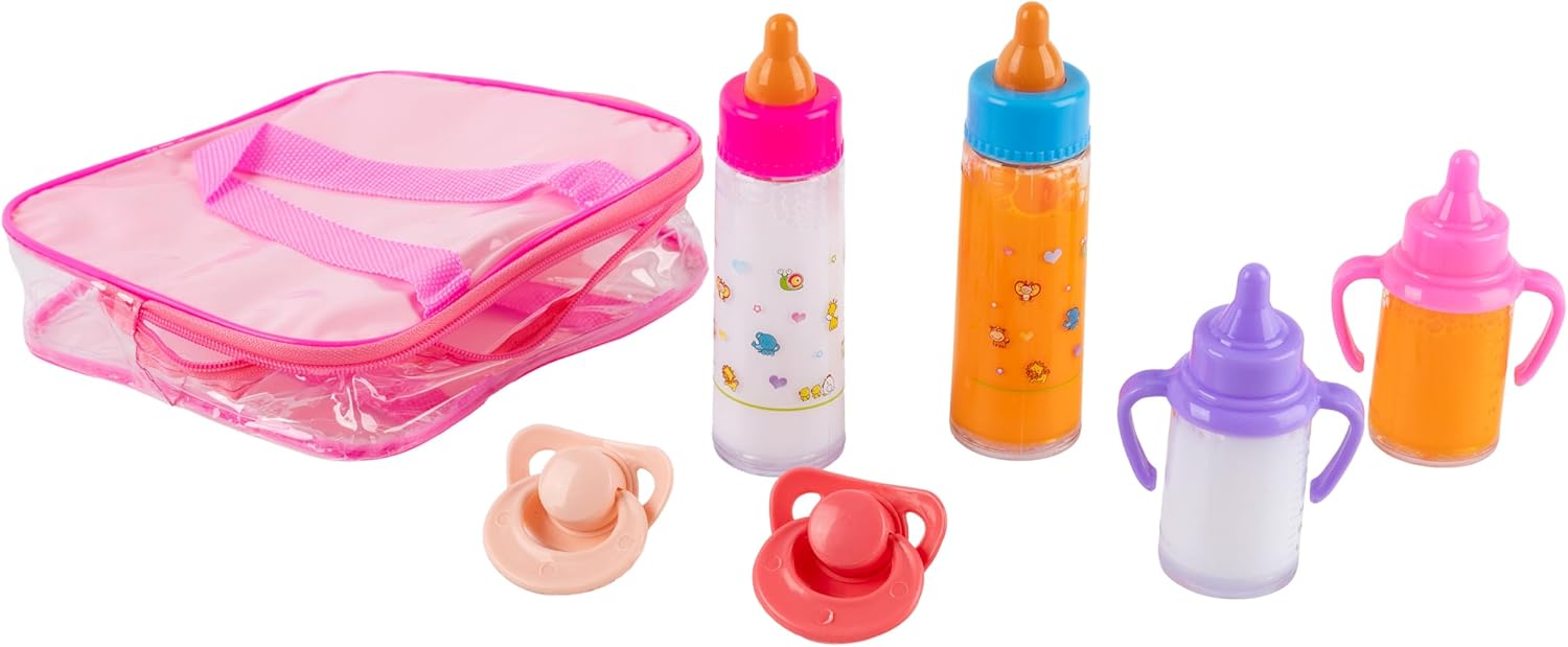 Bottiglie magiche per bambole: set di accessori per bambole con bottiglie effetto latte e succo, entusiasma i bambini. Il liquido scompare e appare nuovo, rendendo i giocattoli di ruolo realistici e le ragazze sviluppano creatività durante il gioco delle marionette. Set completo di accessori per bambole: include bottiglie per bambole, ciuccio e borsa. Questo accessorio per bambole varia i giocattoli dei bambini e promuove accessori per la cura delle bambole. Ideale per bambini dai 3 anni in su che vogliono giocare a mamma delle bambole. Stimola il gioco di ruolo e l'apprendimento: accessori per bambole ispirati ai giocattoli di ruolo, rafforza l'empatia e le abilità sociali. I bambini imparano la responsabilità attraverso gli accessori per la cura delle bambole, sviluppano l'immaginazione e beneficiano di giocattoli educativi educativi. Pratica borsa per il trasporto: set di accessori per bambole con borsa per riporre e trasportare. I bambini possono trasportare accessori per la cura delle bambole ovunque, sia per giocare con gli amici, in viaggio o nella vita quotidiana. I giocattoli per bambini rimangono sempre a portata di Regalo per ragazze e bambini: l'accessorio per bambole è un regalo ideale per bambine dai 3 anni in su. Questo giocattolo per bambini entusiasma come regalo per i bambini per compleanno, Natale o altre occasioni e regalerà gioia al gioco di ruolo della mamma delle bambole.