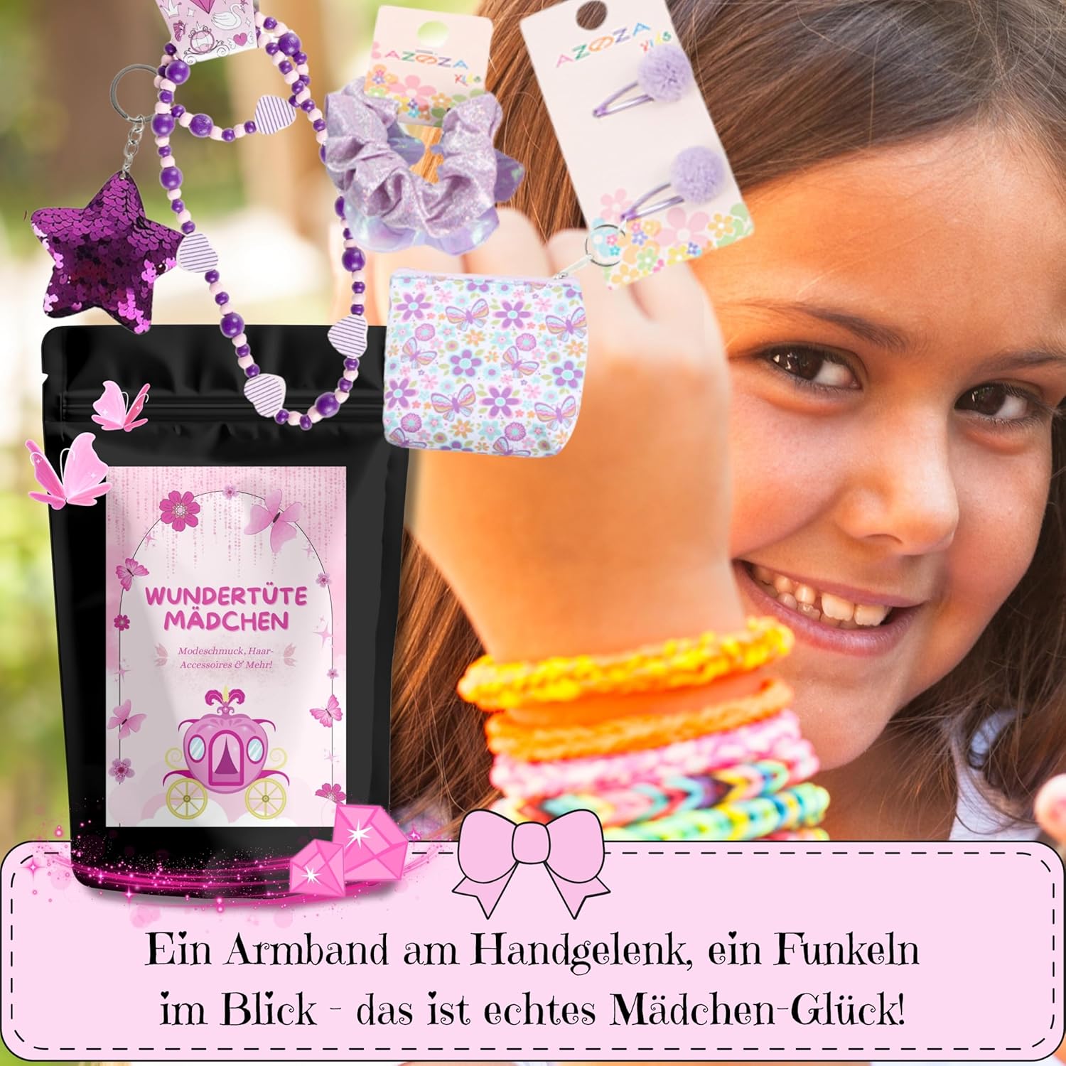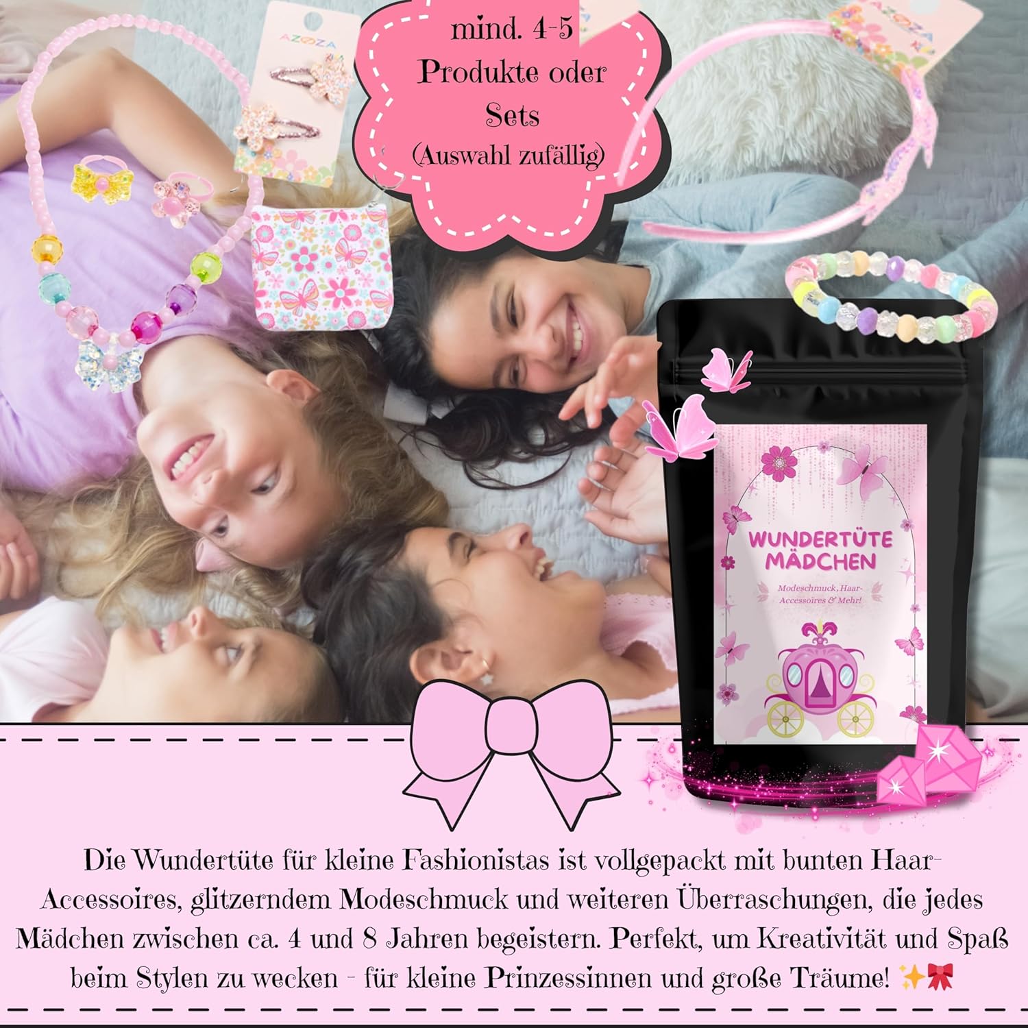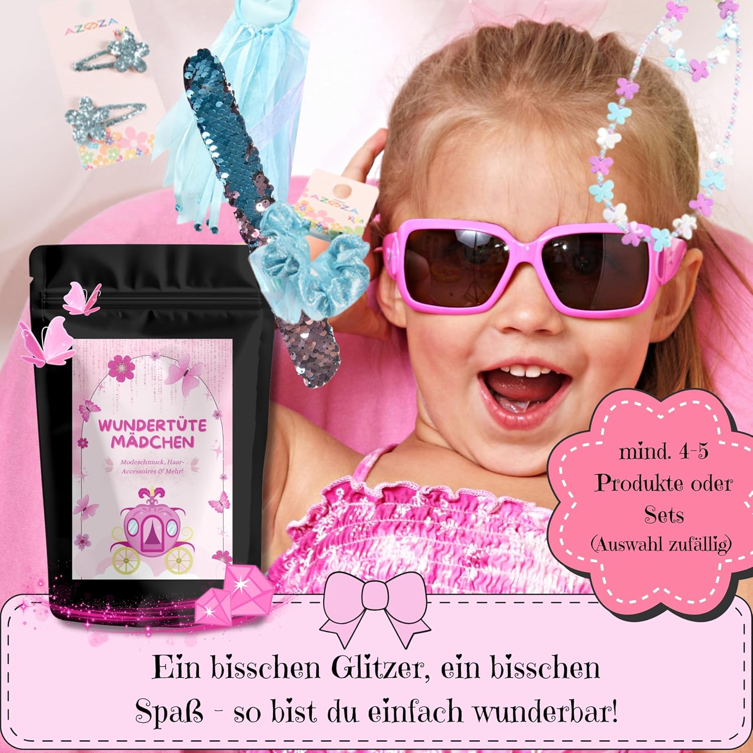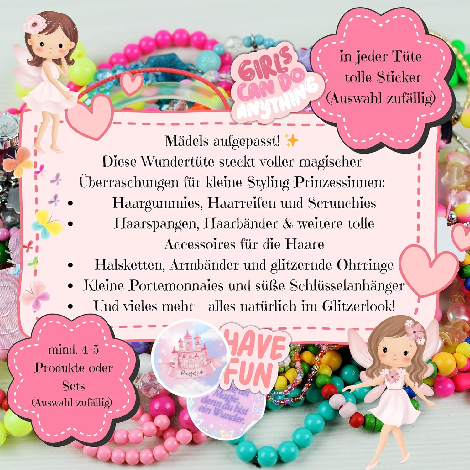 Cosa è incluso? Ogni borsa a sorpresa contiene almeno 4 o 5 prodotti interessanti, disponibili in un'ottima selezione e qualità. Ogni ragazza può aspettarsi prodotti che si adattino perfettamente al suo gusto in termini di moda! La scelta possibile comprende elastici per capelli, fasce per capelli e elastici - ideali per domare i capelli o creare acconciature creative. Questi accessori non sono solo funzionali, ma attirano anche l'attenzione! Oltre alle possibili mollette e fasce per capelli: sia per un look quotidiano che per un evento speciale, le mollette e le fasce per capelli aggiungono accenti lucenti e fanno brillare ogni capello. Soprattutto le versioni scintillanti trasformano ogni ragazza in una piccola principessa. Sono possibili anche collane, braccialetti e orecchini scintillanti: i gioielli alla moda dai colori scintillanti donano ad ogni outfit quel qualcosa in più e fanno brillare gli occhi del piccolo indossatore. I materiali di alta qualità garantiscono una vestibilità comoda. Sono possibili piccoli portafogli e portachiavi: ideali per riporre piccoli tesori o come simpatico accessorio per ravvivare borse e zaini. I piccoli portafogli offrono spazio sufficiente per monete o altri piccoli oggetti importanti. 5 fantastici adesivi - Per tutte le ragazze creative che amano personalizzare i propri tesori e oggetti, sono inclusi cinque adesivi colorati e scintillanti. Questi adesivi sono perfetti per decorare quaderni, diari, materiale scolastico o anche piccole scatole regalo e aggiungere un tocco personale.