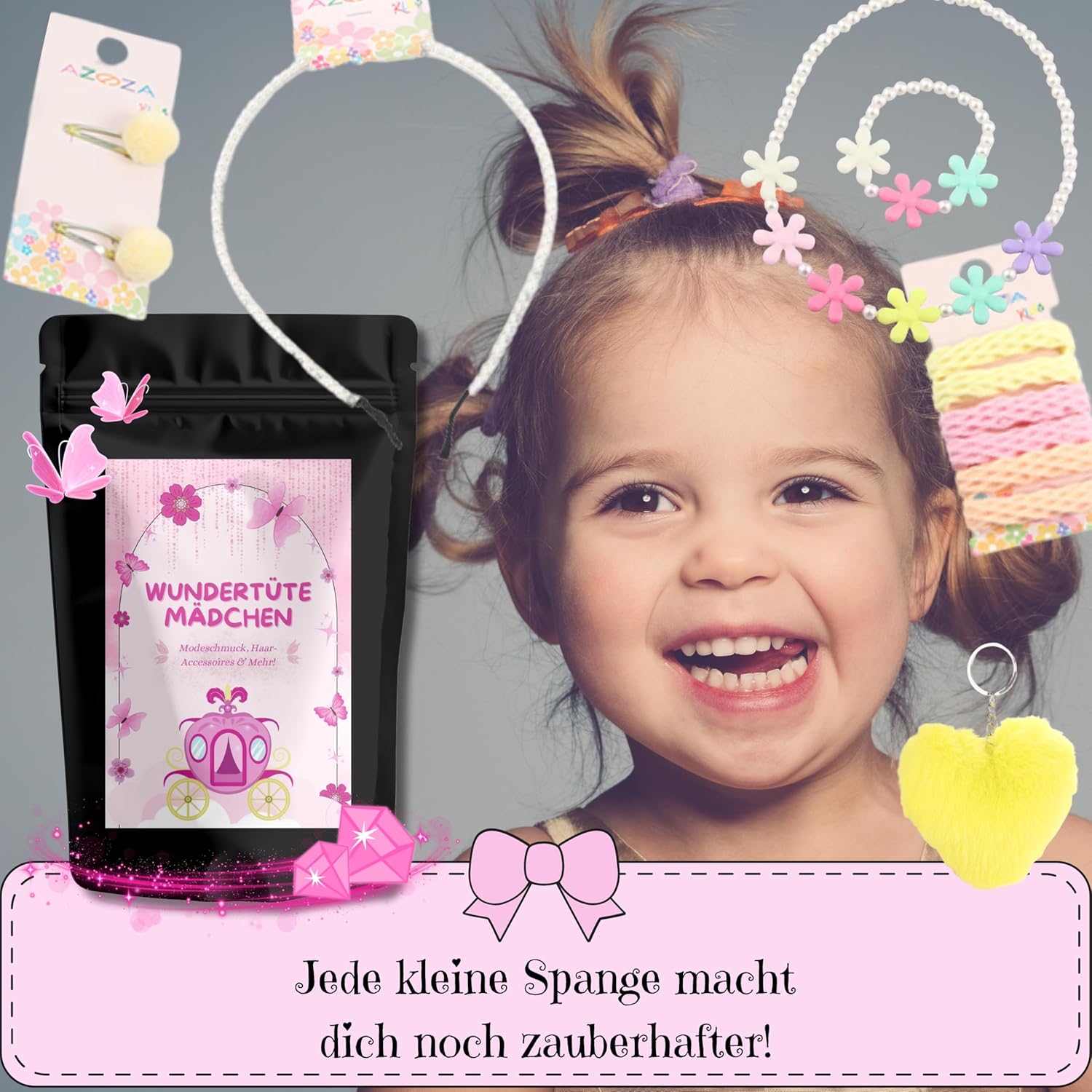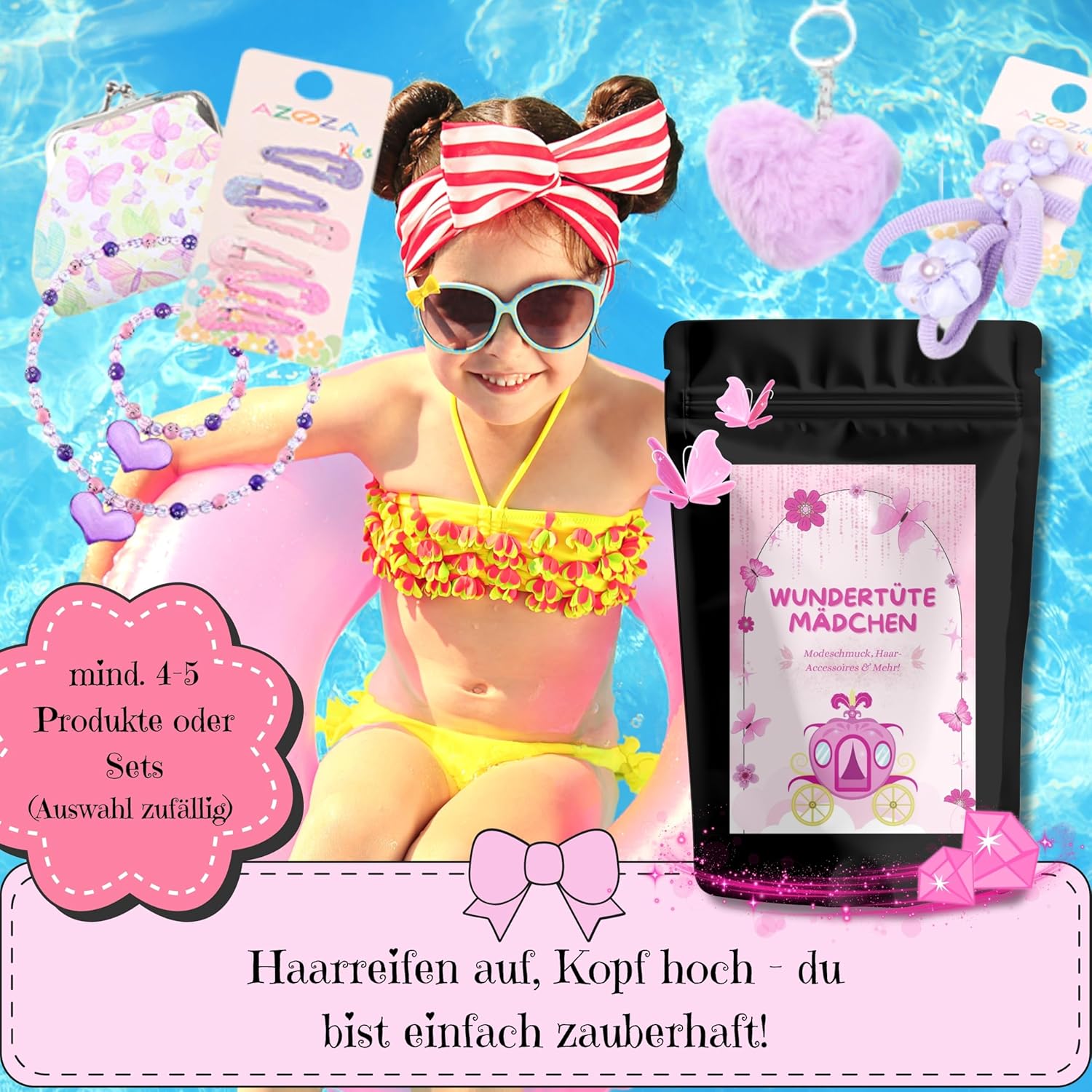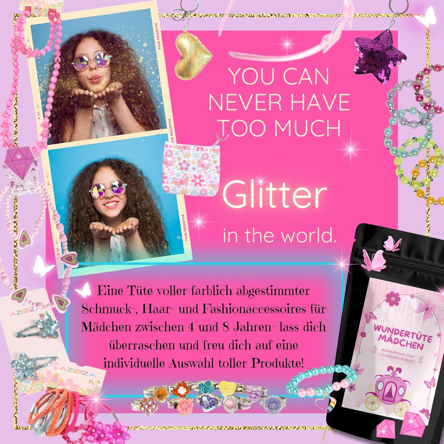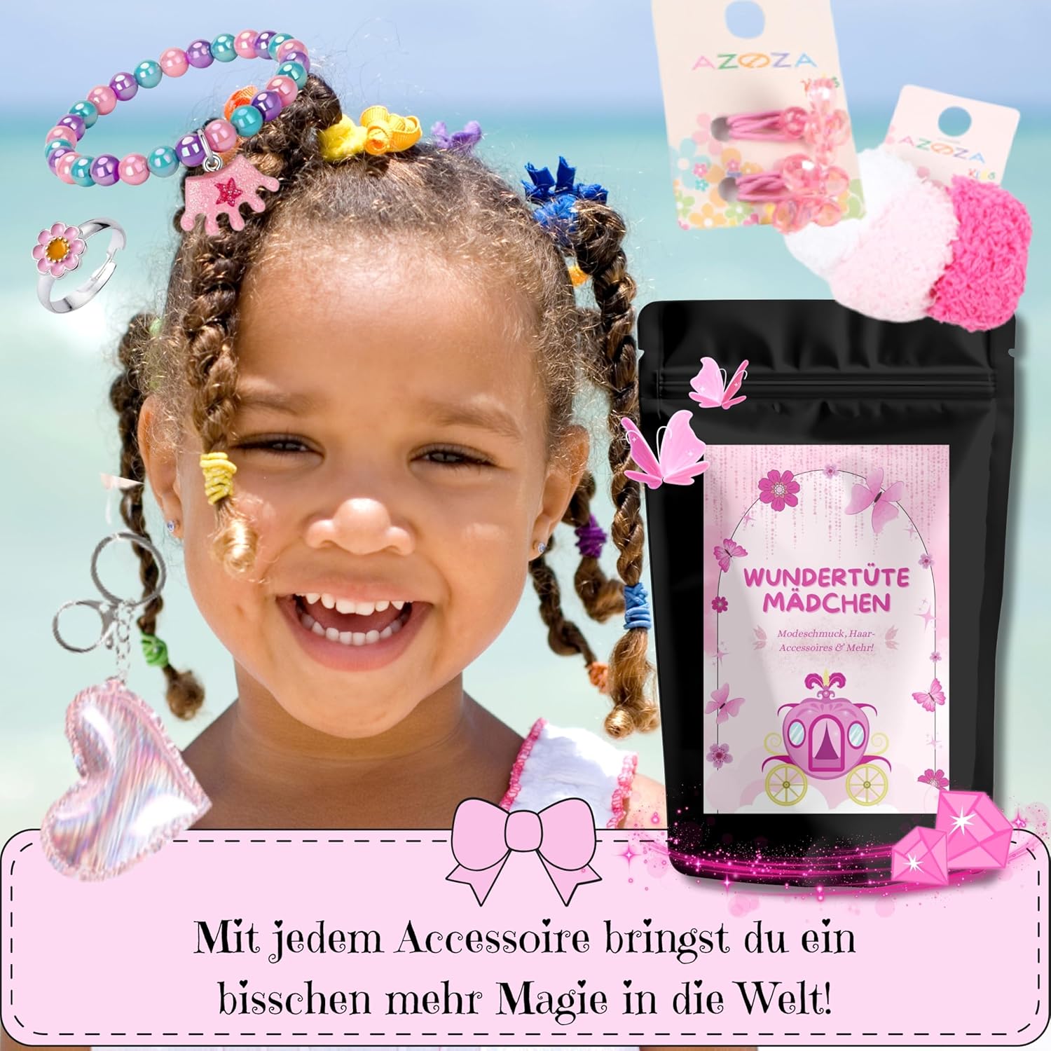 Cosa è incluso? Ogni borsa a sorpresa contiene almeno 4 o 5 prodotti interessanti, disponibili in un'ottima selezione e qualità. Ogni ragazza può aspettarsi prodotti che si adattino perfettamente al suo gusto in termini di moda! La scelta possibile comprende elastici per capelli, fasce per capelli e elastici - ideali per domare i capelli o creare acconciature creative. Questi accessori non sono solo funzionali, ma attirano anche l'attenzione! Oltre alle possibili mollette e fasce per capelli: sia per un look quotidiano che per un evento speciale, le mollette e le fasce per capelli aggiungono accenti lucenti e fanno brillare ogni capello. Soprattutto le versioni scintillanti trasformano ogni ragazza in una piccola principessa. Sono possibili anche collane, braccialetti e orecchini scintillanti: i gioielli alla moda dai colori scintillanti donano ad ogni outfit quel qualcosa in più e fanno brillare gli occhi del piccolo indossatore. I materiali di alta qualità garantiscono una vestibilità comoda. Sono possibili piccoli portafogli e portachiavi: ideali per riporre piccoli tesori o come simpatico accessorio per ravvivare borse e zaini. I piccoli portafogli offrono spazio sufficiente per monete o altri piccoli oggetti importanti. 5 fantastici adesivi - Per tutte le ragazze creative che amano personalizzare i propri tesori e oggetti, sono inclusi cinque adesivi colorati e scintillanti. Questi adesivi sono perfetti per decorare quaderni, diari, materiale scolastico o anche piccole scatole regalo e aggiungere un tocco personale.
