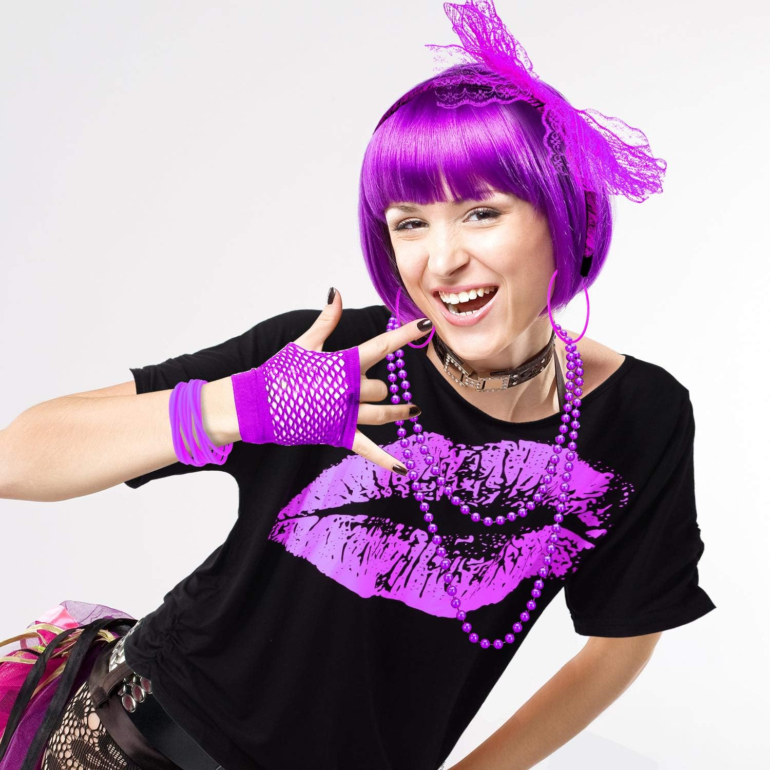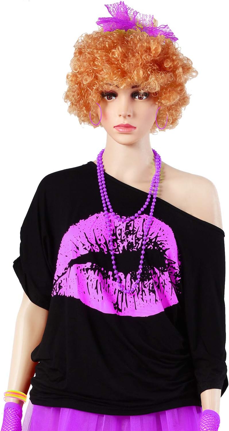 Set di accessori per costumi da donna anni '80, maglietta con stampa labbra, fascia in pizzo, orecchini, collana, braccialetto per feste a tema anni '80 (Viola, XXXL)