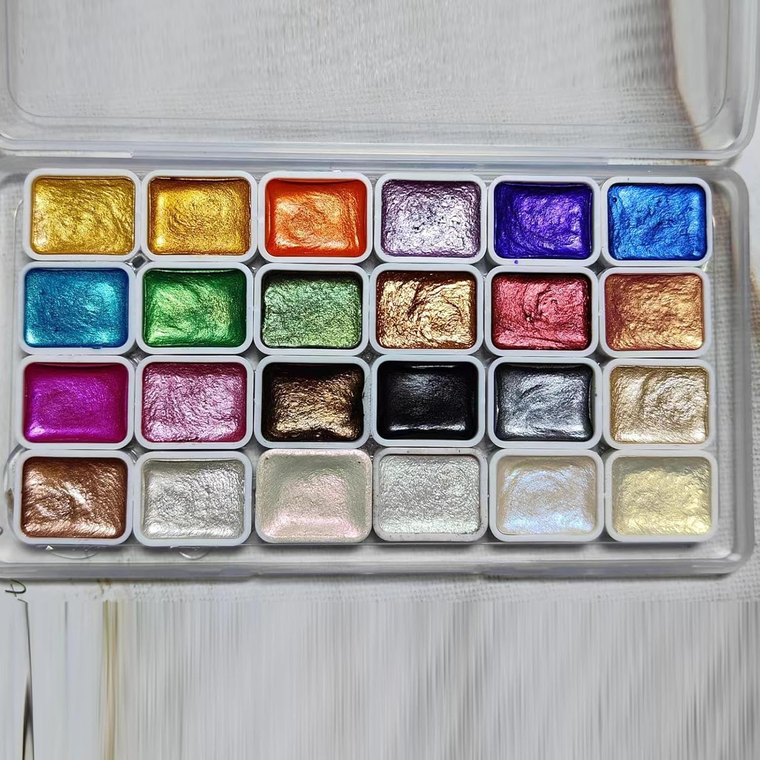 Effetti luccicanti: il nostro set di acquerelli presenta pigmenti in mica minerale che brillano grazie allo speciale processo di stampa e alla messa a terra fine, dando alla tua arte un aspetto sorprendente e mozzafiato. Alta trasparenza: i nostri acquerelli ad alta trasparenza ispireranno la tua creatività, permettendoti di esprimerti in nuovi modi. I 24 colori accattivanti hanno ciascuno la sua personalità unica, quindi la tua arte non avrà eguali. Abbraccia il tuo lato artistico e crea capolavori che mostrino il tuo vero talento. Design portatile: con il nostro kit di pittura ad acquerello, sii pronto a creare la tua arte in qualsiasi ambiente. È progettato per essere leggero, compatto e facile da trasportare, rendendolo molto utile per gli amanti dell'arte che amano tirare fuori casa. Tecniche ad acquerello difficili: ottenete facilmente straordinari dipinti ad acquerello con l'aiuto del nostro acquerello. Strofinare i colori sul blocco, immergere la penna e ottenere buoni effetti cromatici. Non sono necessari disordini o tecniche complicate; Perfetto per pittori principianti ed esperti. Applicazioni multiple: artisti professionisti, studenti e appassionati di pittura beneficeranno tutti di avere un set di pittura ad acquerello diversificato. Perfetto come regalo per compleanni, Ringraziamento o altri eventi