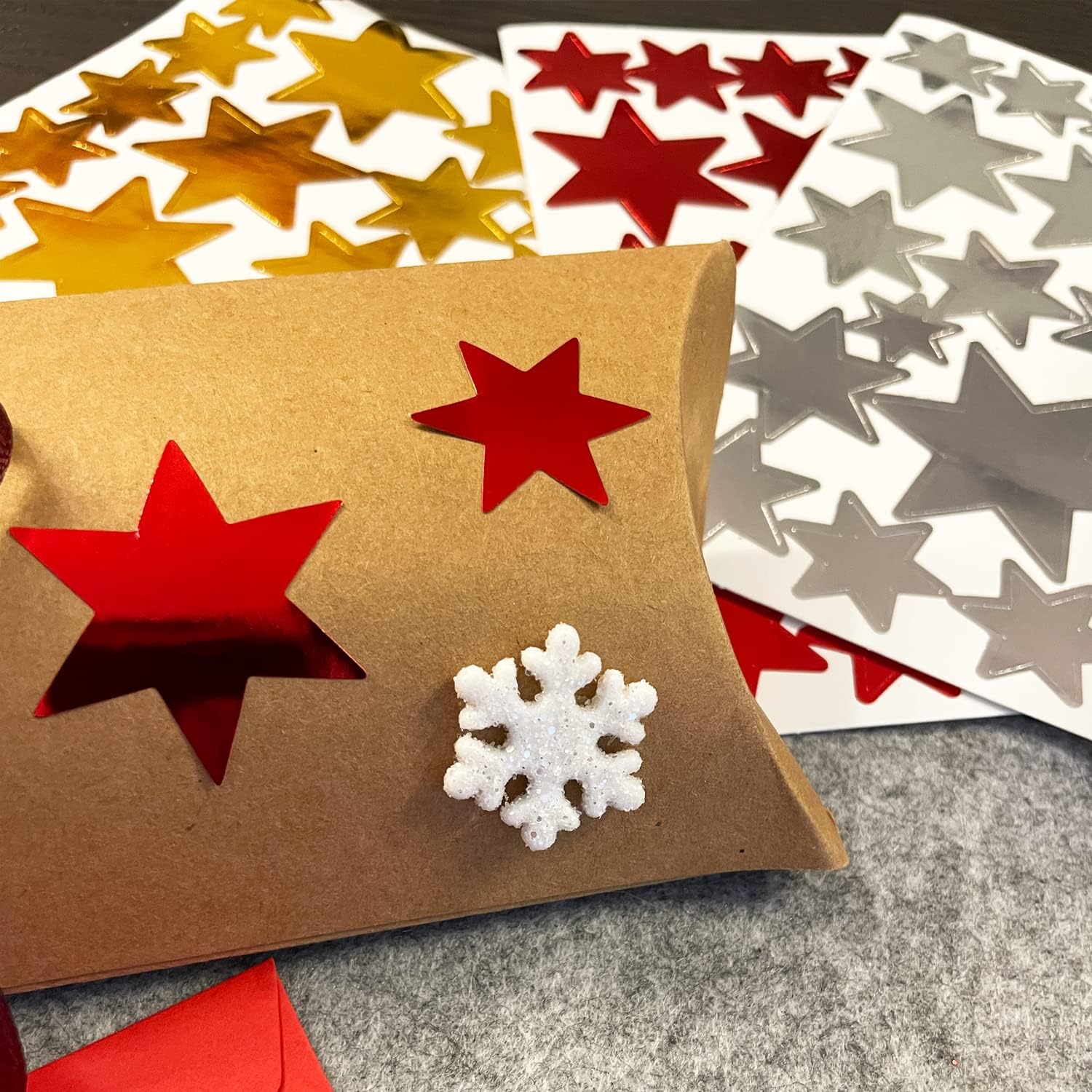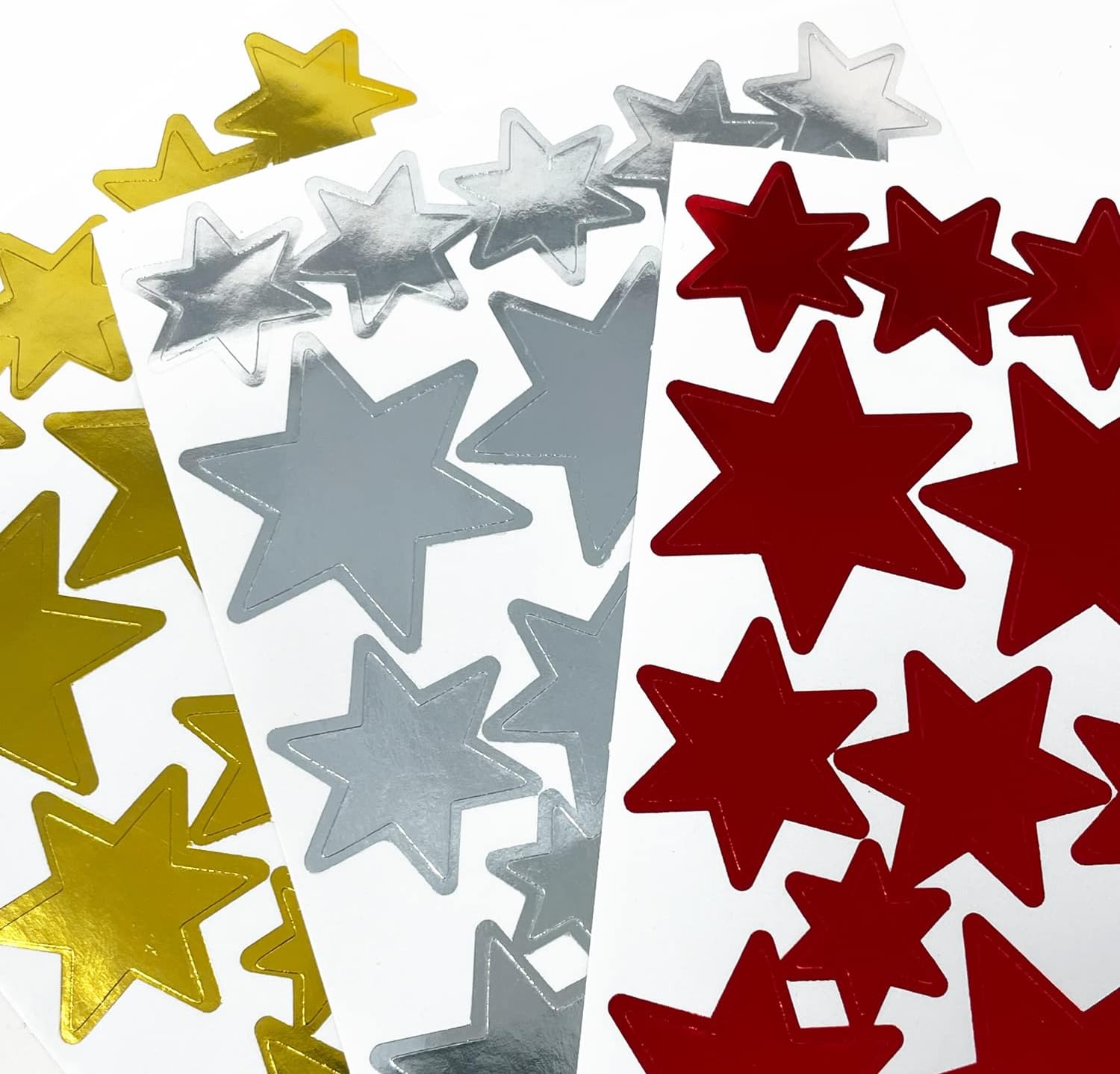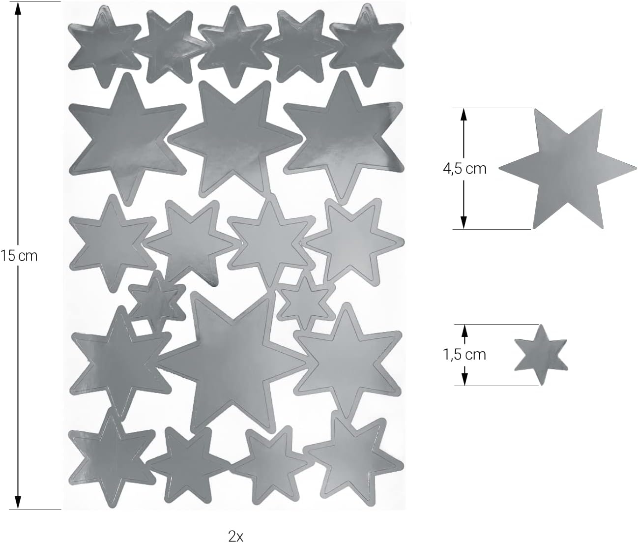 Quantità: 2 fogli con un totale di 42 adesivi a stella di diverse dimensioni, autoadesivi Colore: oro, argento, rosso (a scelta); Materiale: plastica Le stelle hanno una dimensione da 1,5 cm a 4,5 cm Perfetto per Natale, per giocare, per i compleanni dei bambini, come regalo, come regalo per le feste, per divertirsi, per il fai da te, per lo scrapbooking, come decorazione regalo e molto altro ancora.