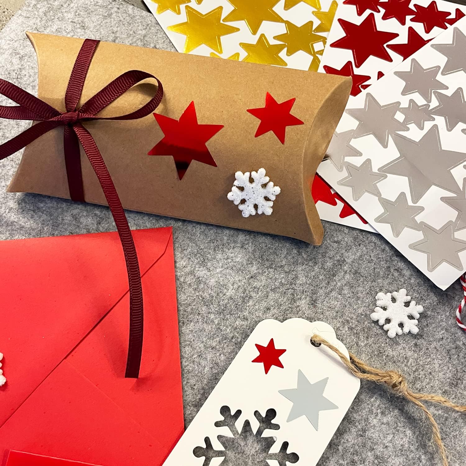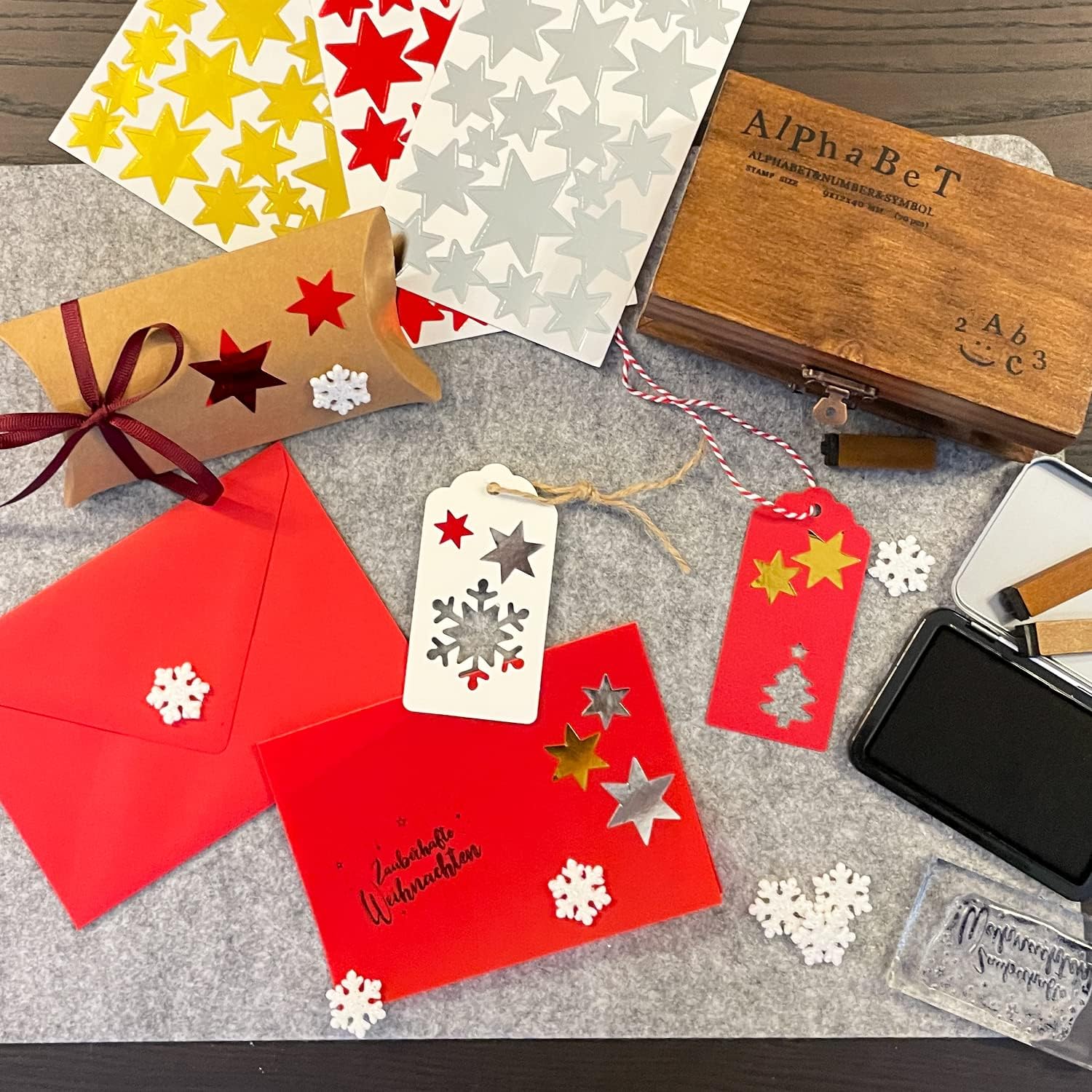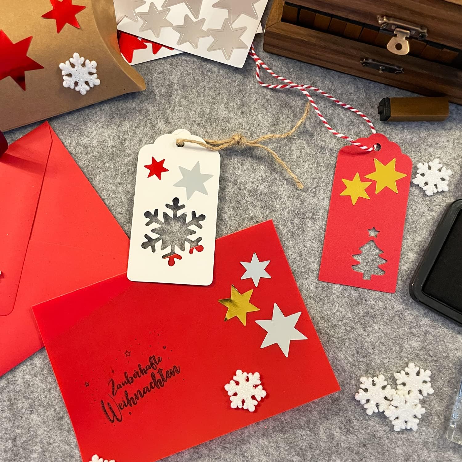 Quantità: 2 fogli con un totale di 42 adesivi a stella di diverse dimensioni, autoadesivi Colore: oro, argento, rosso (a scelta); Materiale: plastica Le stelle hanno una dimensione da 1,5 cm a 4,5 cm Perfetto per Natale, per giocare, per i compleanni dei bambini, come regalo, come regalo per le feste, per divertirsi, per il fai da te, per lo scrapbooking, come decorazione regalo e molto altro ancora.