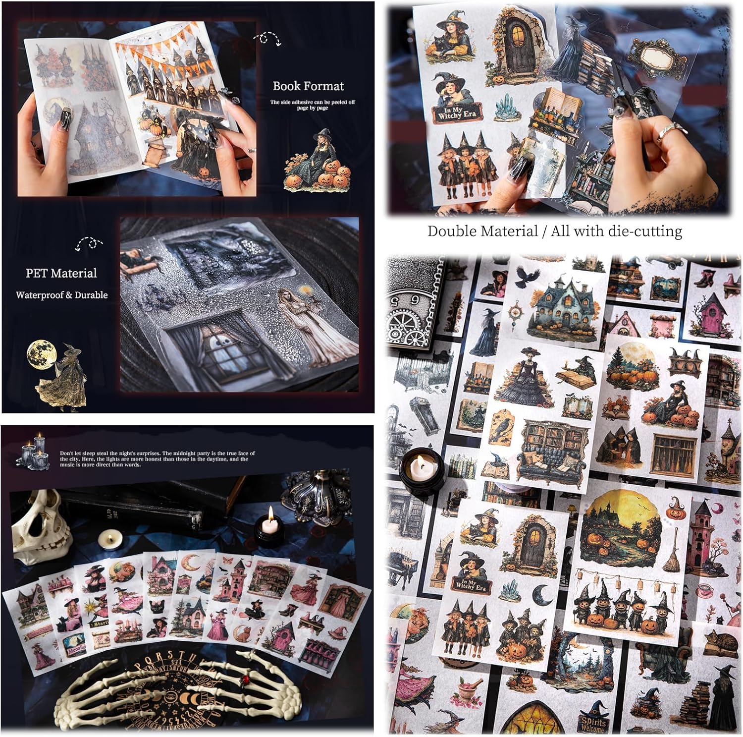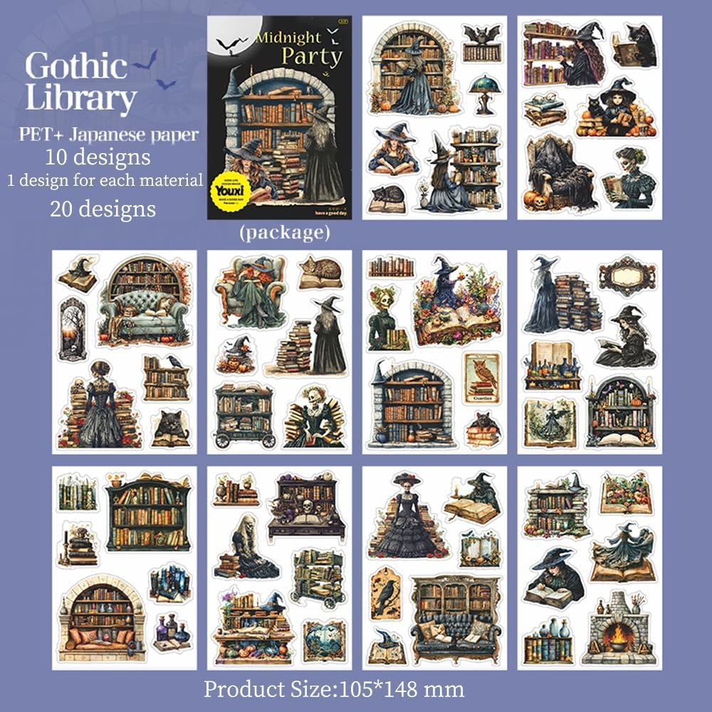 Adesivi con lettura gotica: riceverai 20 fogli di adesivi sul tema della letteratura gotica, due tipi di adesivi, dieci fogli di ciascun materiale. Motivi ricchi: i motivi degli adesivi sono diversi e includono elementi come scaffali, libri, gatti, streghe, corvi, bottiglie, ecc., con cui puoi decorare il tuo album in modo molto bello. Doppio materiale: il prodotto è realizzato in materiale PET e materiale washi, sicuro e non tossico, riutilizzabile. Design pretagliato: sia gli adesivi in PET che gli adesivi washi sono realizzati mediante taglio a pressione. processo, i prodotti possono essere facilmente strappati. Multifunzionale: questi adesivi per album sono ricchi di design, perfetti per scrapbooking, bullet journal, junk journal, art journaling, creative journaling, artigianato con la carta e altro ancora. Può essere utilizzato su album fotografici, buste, computer portatili, telefoni cellulari, tastiere, chitarre