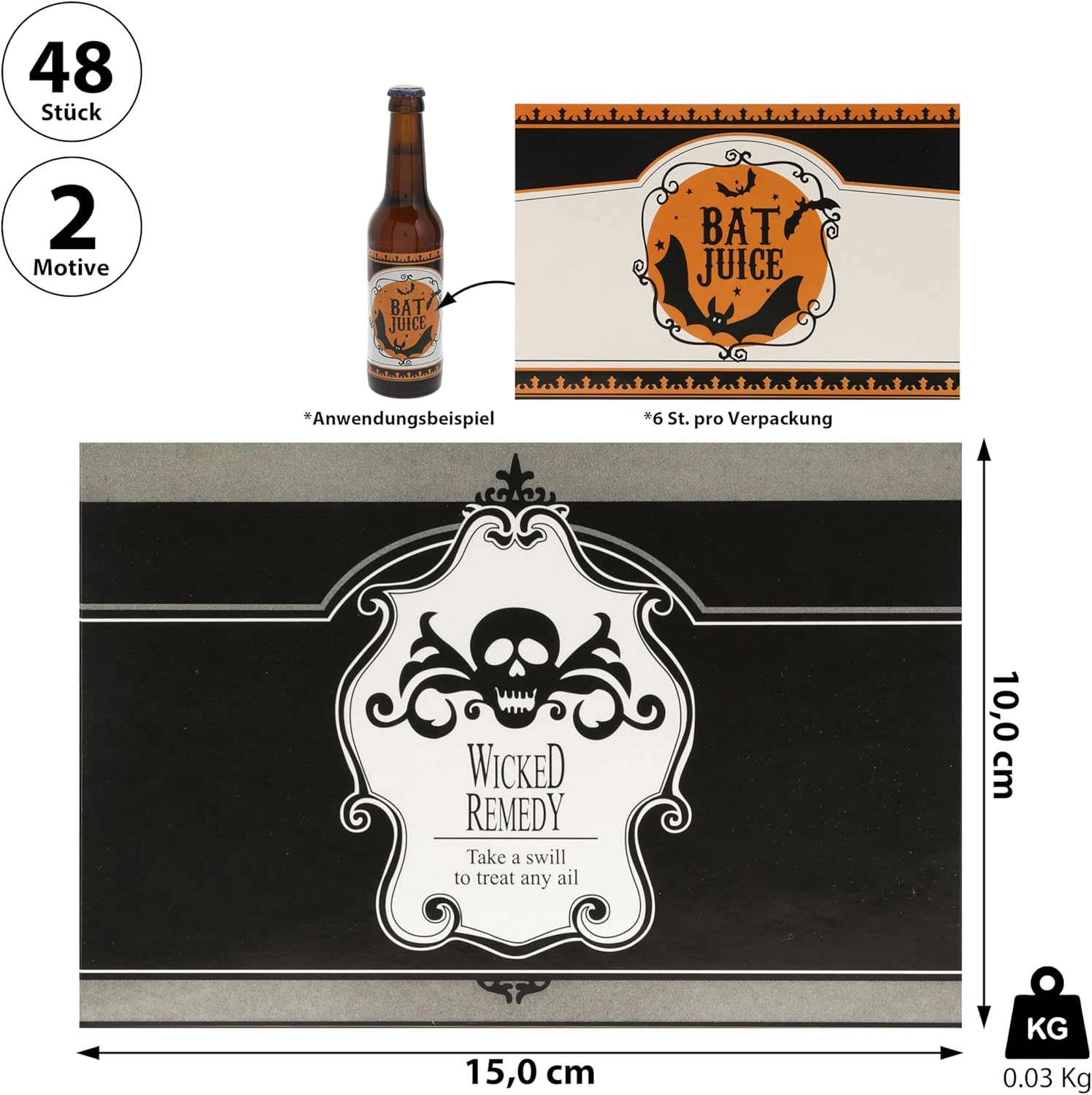 Trasforma le normali bottiglie in spettrali accessori per feste con gli adesivi per bottiglie di carta di Halloween con i motivi spettrali "Bat Juice" e "Wicked Remedy". Gli adesivi sono ideali per buffet di Halloween, feste a tema, come divertente sorpresa per gli ospiti e le bevande poi sembrano provenire direttamente dalla cucina della strega. Le etichette possono essere facilmente attaccate su diverse bottiglie o barattoli, basta rimuovere l'etichetta originale e sostituirla con le etichette per bottiglie di Halloween. Dimensioni: L 12 cm x H 21 cm; Materiale: carta Fornitura: 1 set di 6 adesivi per bottiglie di Halloween senza decorazione