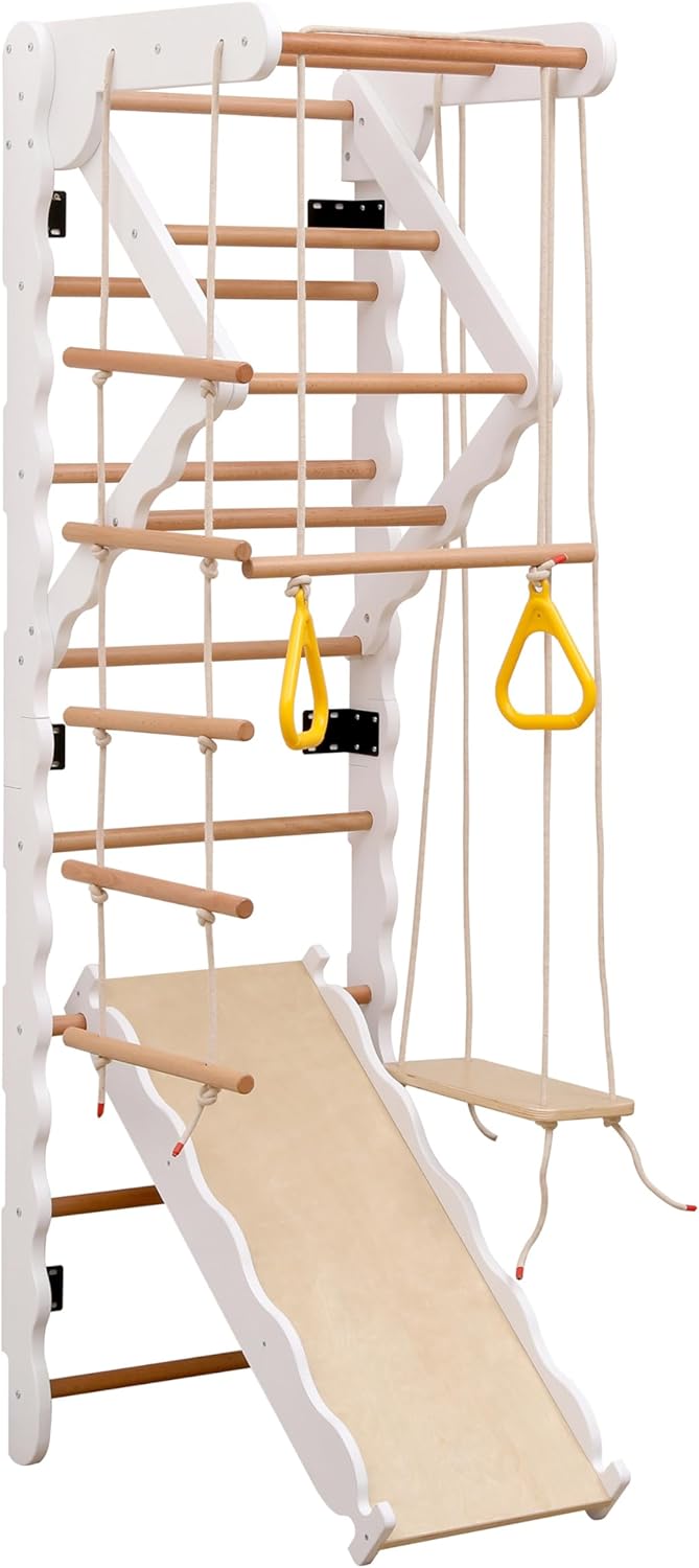 【Design multifunzionale】 - La struttura da arrampicata 6 in 1 combina altalena, anelli, scala a pioli, scivolo, parete da arrampicata e area di trazione in un design compatto. Offre un divertimento vario in una piccola area e aiuta i bambini a sviluppare importanti capacità motorie e attività sportive nella vita di tutti i giorni, perfetto per gli interni. 【Allenamento e divertimento per le capacità motorie】 - Giocare su questa parete da gioco promuove l'equilibrio, il controllo del corpo e la coordinazione. Che si tratti di dondolarsi, arrampicarsi o scivolare, il design variegato risveglia la gioia della scoperta e la voglia di muoversi nei bambini dai 3 anni in su, supportando il loro sviluppo olistico in un ambiente sicuro. 【Materiali di alta qualità】 - Realizzata in resistente legno massello, legno di faggio e compensato resistente, la struttura da arrampicata offre una base stabile per un utilizzo duraturo. La finitura liscia con bordi arrotondati riduce il rischio di lesioni e garantisce un'esperienza di gioco sicura per i bambini, per una costruzione durevole e ben studiata. 【Sicurezza certificata】 - Questo dispositivo di gioco per interni è certificato secondo la norma EN71 e soddisfa quindi i rigorosi standard di sicurezza europei. Le vernici a base d'acqua sono inodori e adatte ai bambini. La struttura sofisticata, senza viti sporgenti, riduce al minimo i rischi: un dispositivo di gioco sicuro e di qualità testata. 【Comodo da usare in interni】 - Il design salvaspazio ne consente il montaggio nelle camerette dei bambini o nelle aree gioco. Non richiede un ingombro elevato e può essere integrato perfettamente in ambienti già esistenti, per un divertimento in casa indipendentemente dalle condizioni meteorologiche, tutto l'anno.