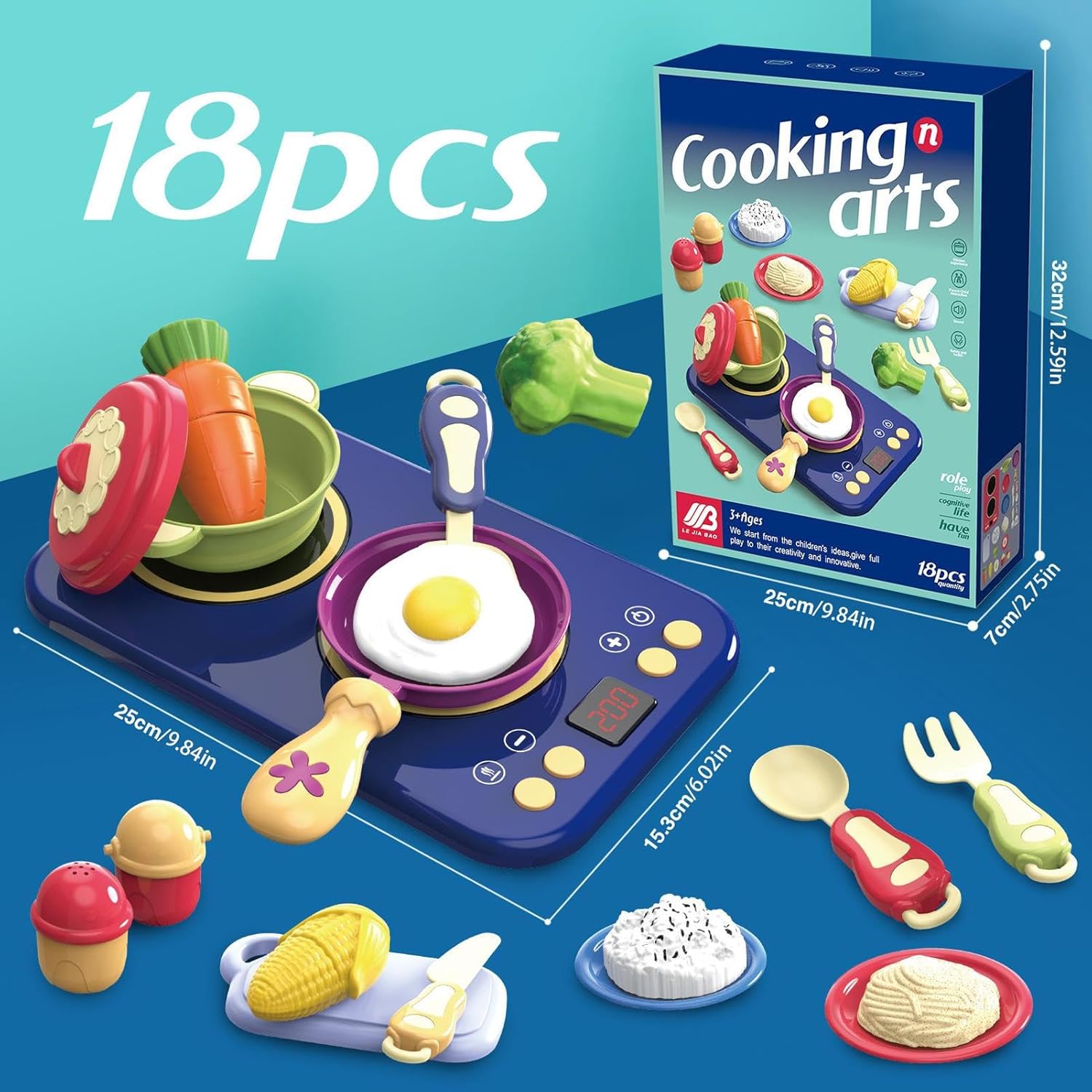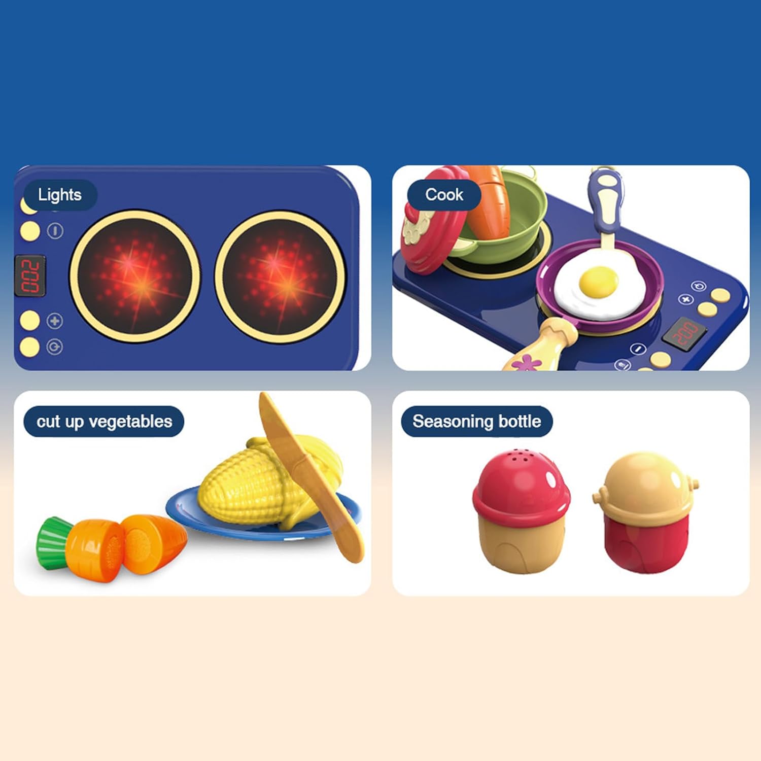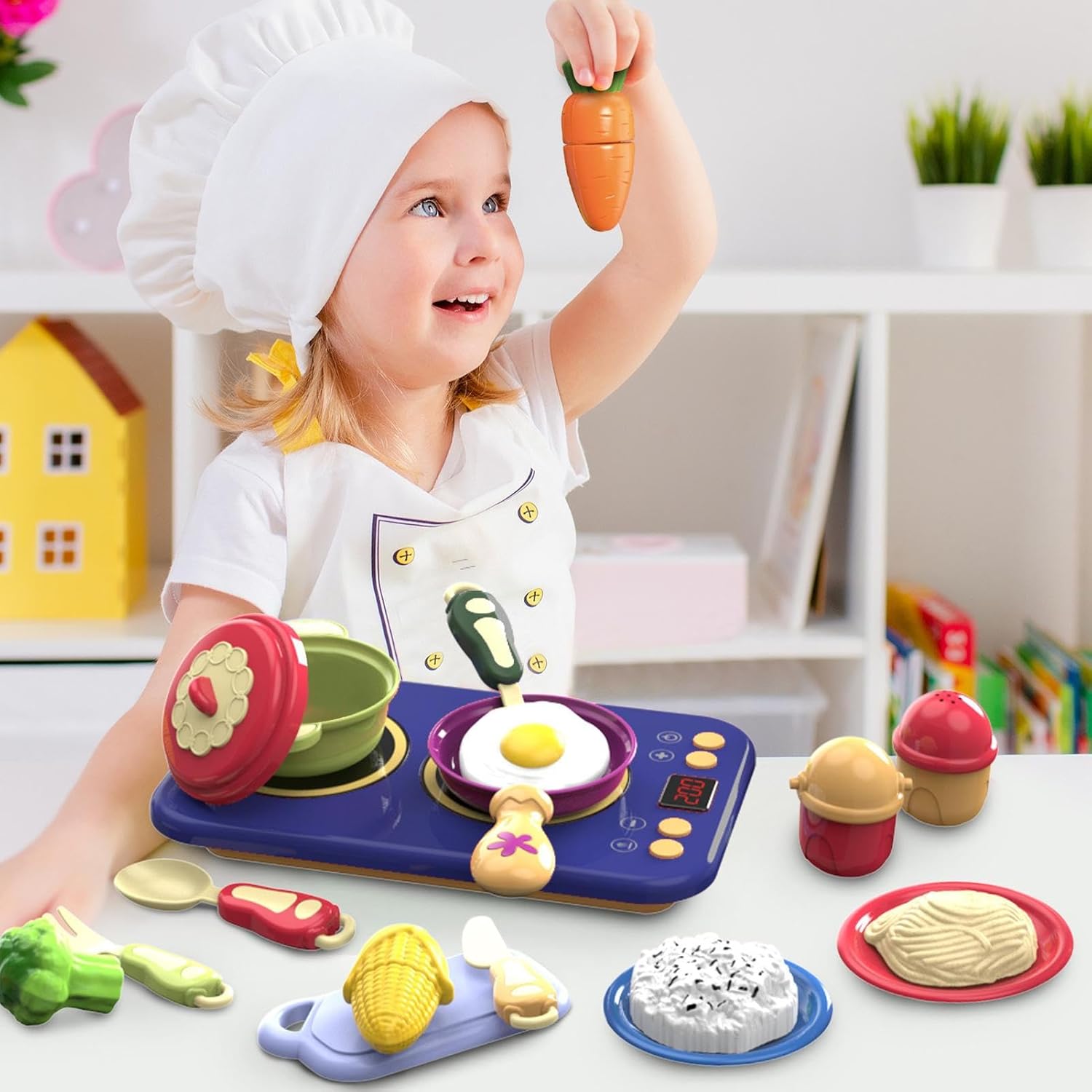 Design ecologico: cibo da gioco con bordi arrotondati in ABS ecologico per uso alimentare, offre un'esperienza di gioco sicura e coinvolgente appositamente per bambini di 2-6 anni Simulazione di cucina realistica: giocattolo da cucina ricco di dettagli con effetti sonori e luminosi interattivi invita a giocare fantasioso e simula scenari di cucina realistici Varietà di giochi interattivi: gli utensili da cucina versatili consentono combinazioni di gioco libere con le padelle e stimolano la creatività e il pensiero logico attraverso il gioco interattivo Attività di gioco comune: ispira il gioco di ruolo attraverso l'assunzione di ordini e lo scambio interattivo, promuove l'intelligenza emotiva e le abilità linguistiche e sociali nei giochi di cucina cooperativa per più bambini Ampia gamma di applicazioni: combina giochi di famiglia con la promozione precoce dell'asilo grazie ai sorprendenti disegni rosso-blu. Promuove l'interesse in varie configurazioni come eventi all'aperto e crea dinamiche possibilità di gioco intorno alle avventure della cucina per bambini