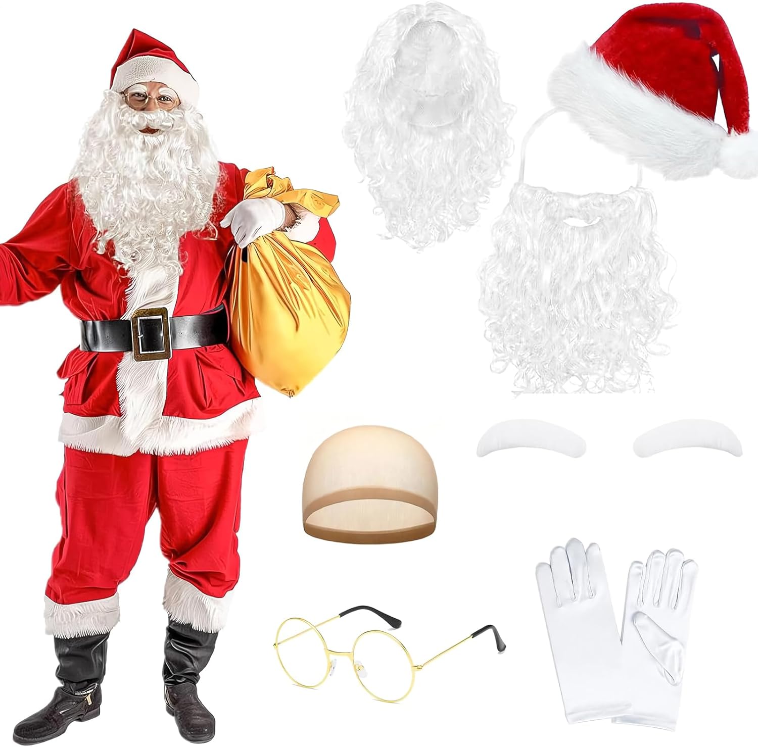 Set di barba e parrucca di Babbo Natale, accessori per costume cosplay di Natale, accessori per feste, accessori per cosplay di Natale, tra cui barba, parrucca, sopracciglia, cappello, occhiali