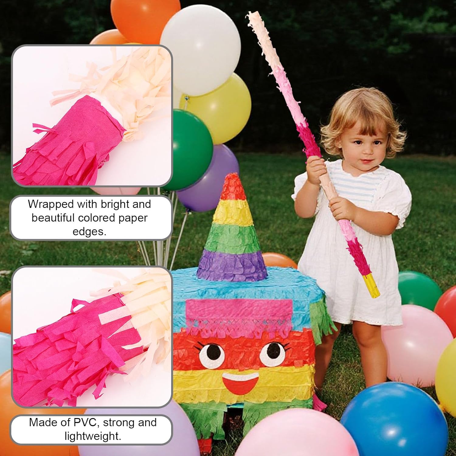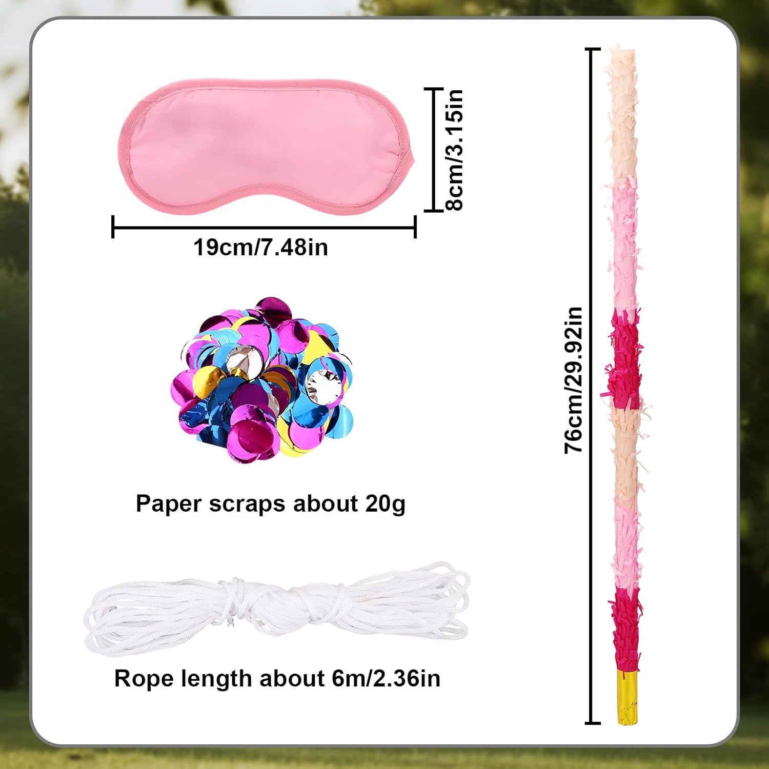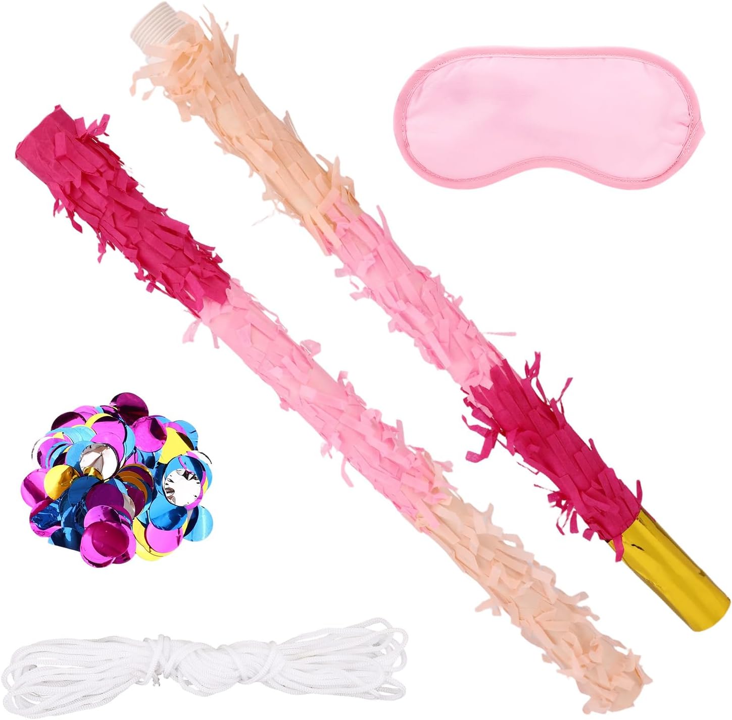 La confezione include: La confezione contiene 1 bastoncino di pinata, 1 benda, 1 sacchetto di coriandoli e 1 corda, tutto il necessario per organizzare una fantastica festa di pinata. Materiale eccellente: i bastoncini di pinata sono realizzati in plastica di buona qualità, affidabili, resistenti e possono resistere a centinaia di impatti senza rompersi, rendendoli perfetti per giochi da tavolo intensi. Ampia applicazione: i bastoncini durevoli di pinata sono adatti a varie feste festive, come feste di compleanno, feste Cinco de Mayo, festival messicani, eventi di Halloween e celebrazioni festive. DIMENSIONE IDEALE: La dimensione del bastoncino della pinata è di circa 76 cm e la dimensione della fascia per la testa è di circa 19x8 cm, una dimensione adatta sia per bambini che per adulti. Facile da usare: con un design avvitato filettato, il nostro stick per pinata può essere installato in modo rapido e sicuro senza fastidiosi passaggi, permettendoti di concentrarti sul divertimento del gioco.