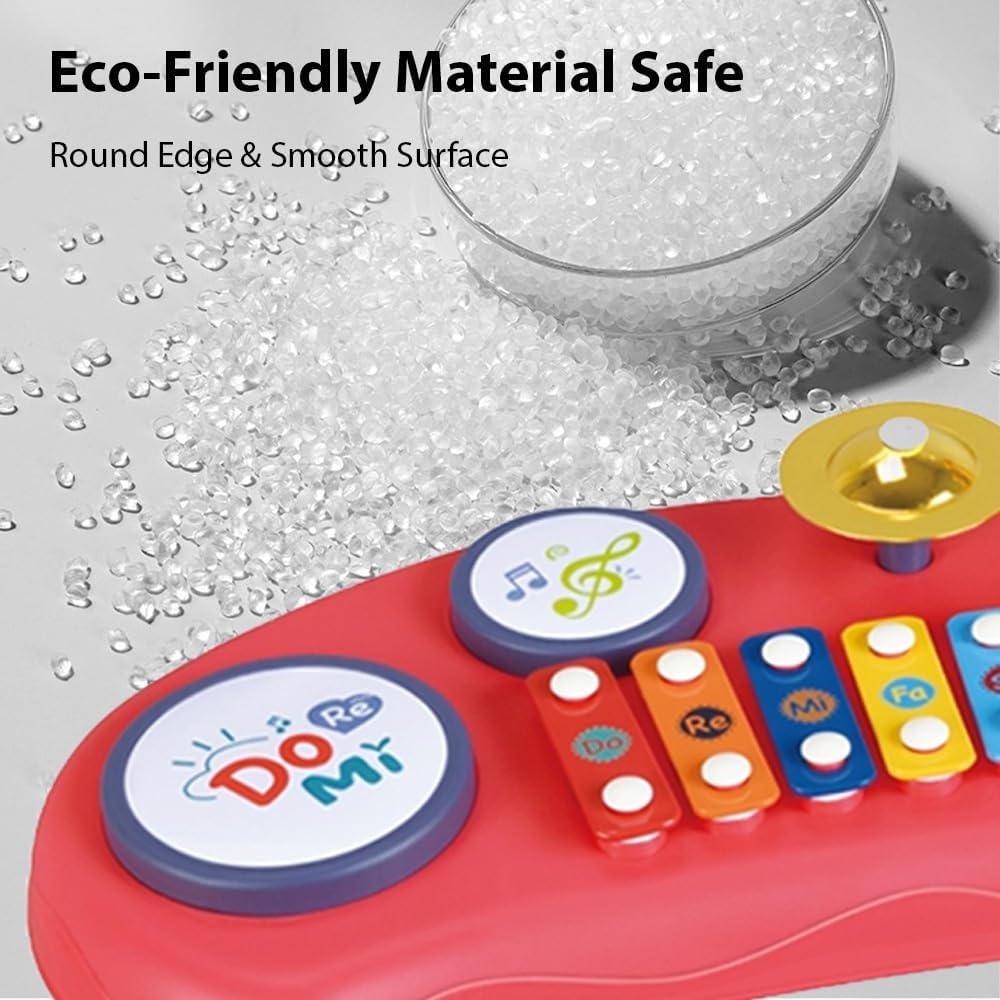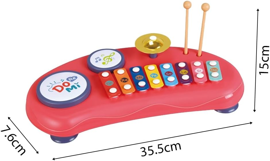 Set di batteria 2 in 1: include 2 tamburi, 1 piatto e 8 tasti, fornendo una ricca tavolozza di suoni e ritmi. Riproduci facilmente una melodia o traccia un ritmo, esplora diverse combinazioni musicali e ispira la creatività. Materiale: il set di batteria xilofono Rainbow è realizzato in legno, superficie arrotondata per suonare in sicurezza e tranquillità. Presenta colori vivaci e un bellissimo design. È completamente manuale e non richiede batterie o elettricità. Suono chiaro: lo xilofono produce un suono chiaro e nitido per una piacevole esperienza di ascolto. Ogni tonalità corrisponde ad un'altezza diversa, aiutando a comprendere il concetto di scale musicali. Educativo: questo strumento è un'introduzione divertente ed educativa. Il design giocoso suscita interesse per la musica e promuove lo sviluppo sensoriale. È pronto per giocare in qualsiasi momento, il che lo rende comodo e senza preoccupazioni. Configurazione semplice: il set di percussioni per xilofono è uno strumento a percussione completamente funzionale che si collega semplicemente a un tavolo per il montaggio e una facile installazione e rimozione. Il design portatile ti consente di immergerti nella creazione musicale sempre e ovunque.