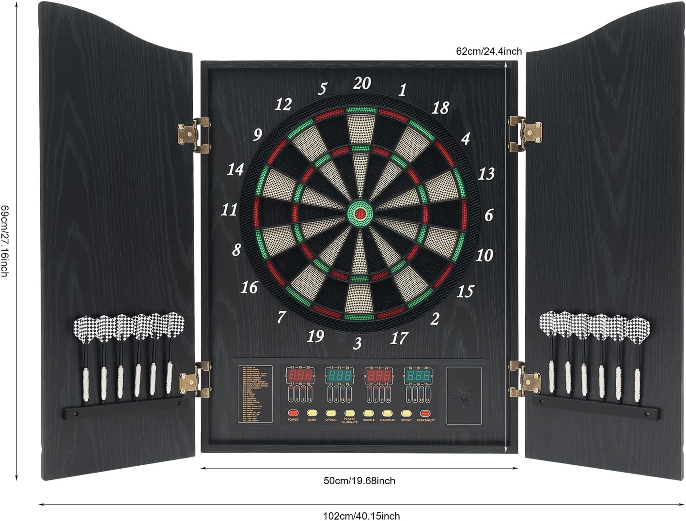 Divertimento freccette: ci sono 27 categorie e 243 sottocategorie di giochi di freccette per un massimo di 16 giocatori. Sia i principianti che i professionisti possono godere del bersaglio. Materiali selezionati: questo prodotto è realizzato in MDF, PP e ABS di alta qualità, con elevata resistenza all'usura, resistenza all'ossidazione e resistenza alla corrosione, in grado di sopportare forti pressioni e urti, garantendo la stabilità e la durata del prodotto. Design intelligente: questo prodotto viene fornito con un adattatore a tensione larga per una facile alimentazione. Inoltre, la funzione di annuncio vocale ti consente di capire meglio lo stato del gioco. Stile di vita sano: il lancio lungo delle freccette rafforza la vista e la forza del braccio, migliora la concentrazione e ti consente di avere uno stile di vita sano mentre ti diverti! Dispositivo di protezione: utilizzando una morbida testa in plastica con pregevole fattura e linee morbide, non è facile ferire accidentalmente le persone e le due eleganti porte in MDF possono anche attirare sottilmente l'attenzione delle persone e proteggere le pareti e gli oggetti domestici da danni.