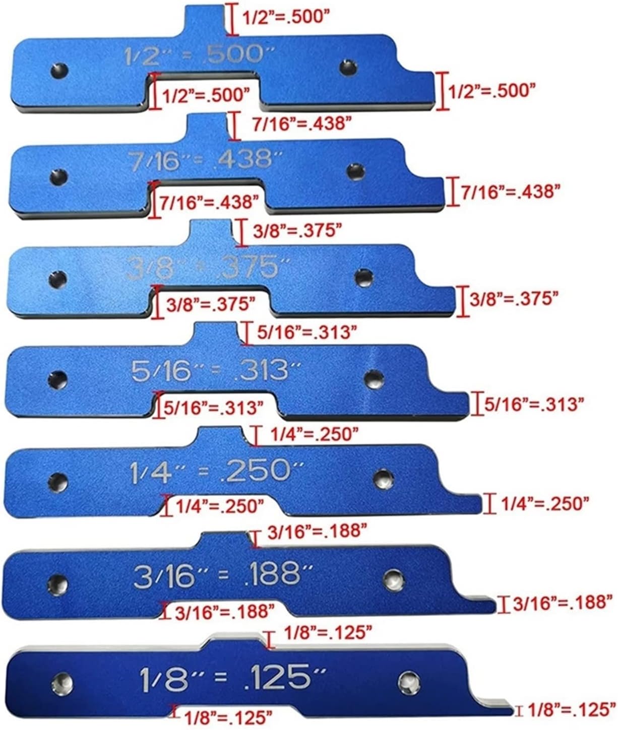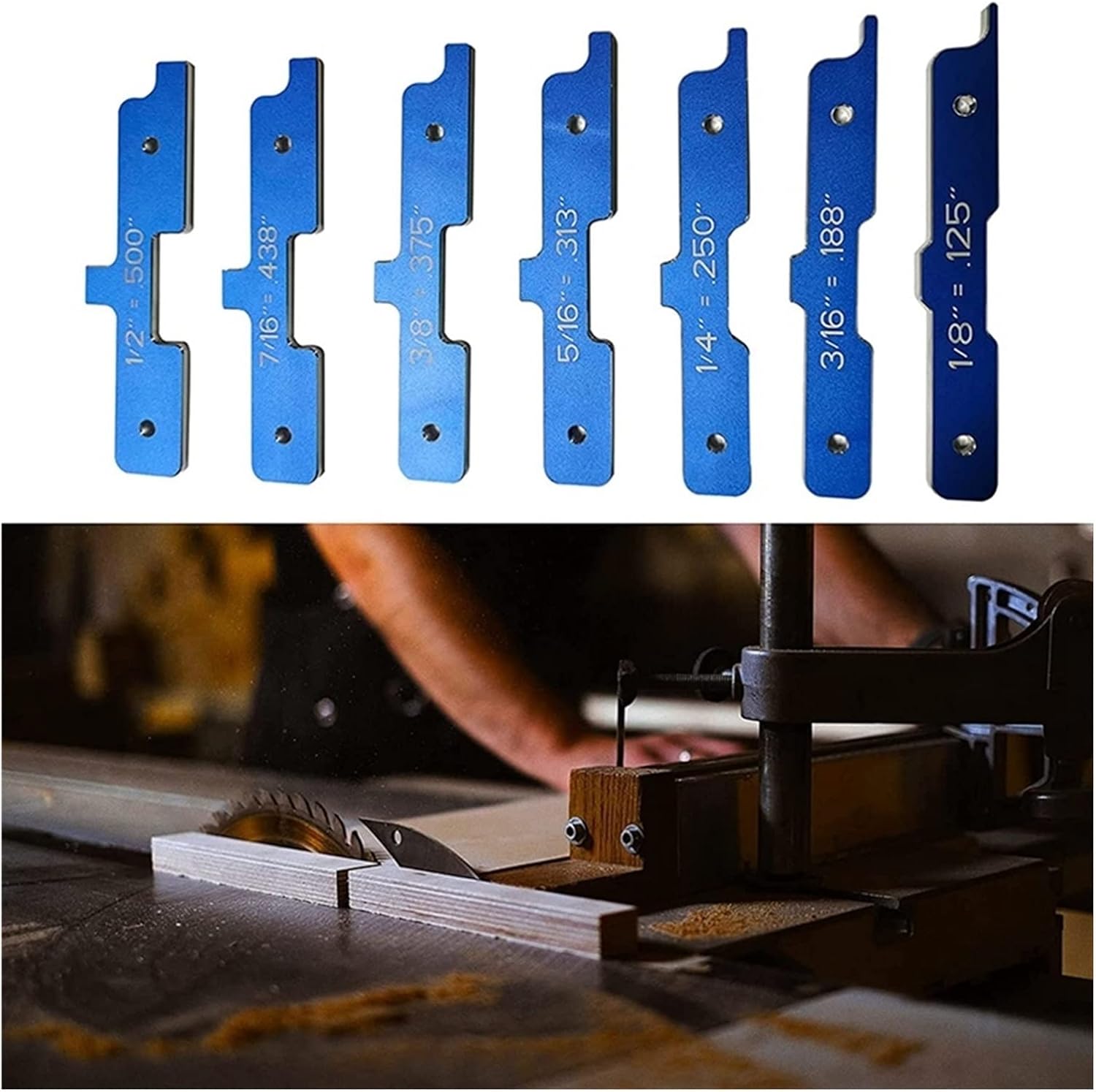Il passaggio alla fine di ciascuna barra di configurazione può essere utilizzato per impostare il distanee Il gradino sul bordo superiore può testare la profondità dei tagli completati Il gradino concavo sul fondo consente una regolazione precisa dell'altezza Le barre sono realizzate in lega di alluminio di prima qualità e sono progettate per prevenire danni alla lama della sega e alla punta del router durante il processo di installazione. APPLICAZIONI: Perfetto per tavoli router, seghe da tavolo e persino shaper.