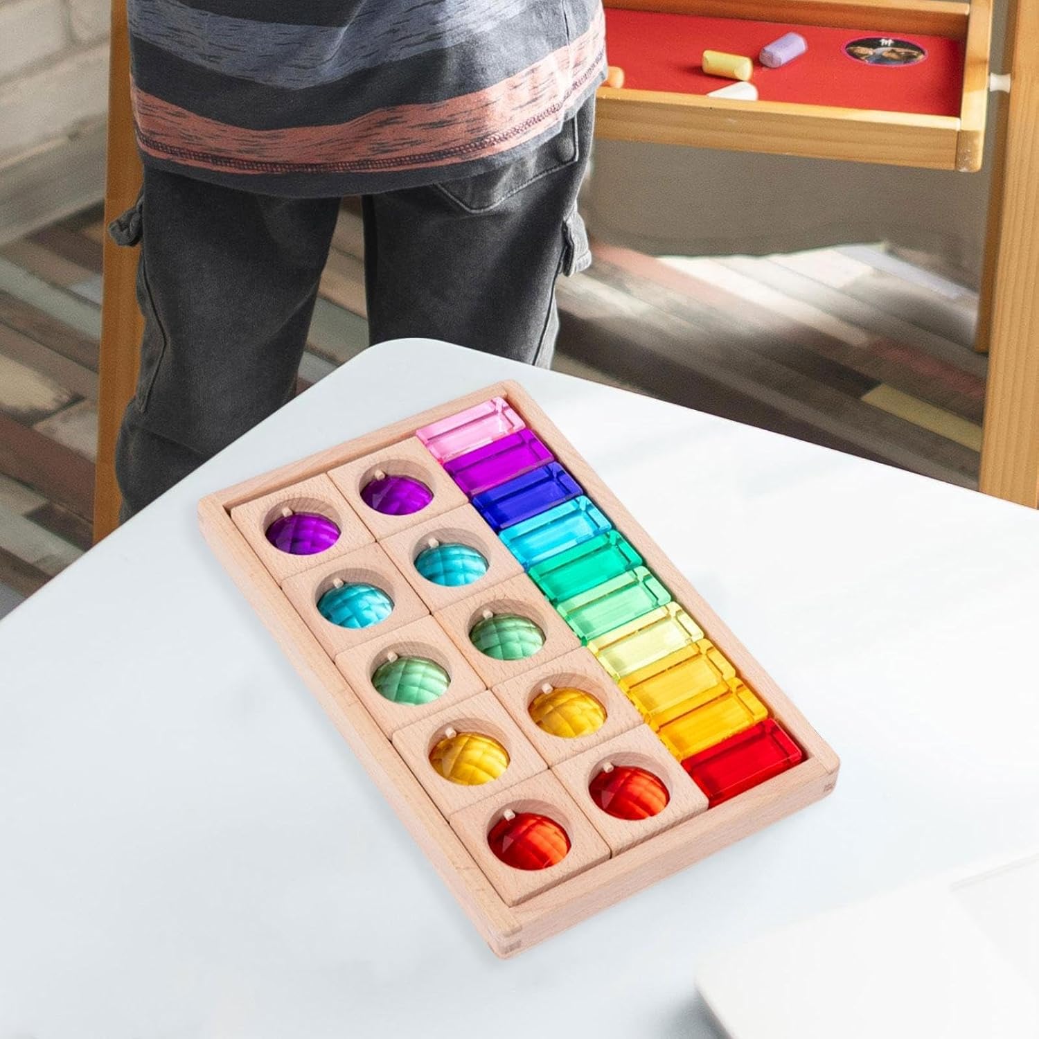 【Gioco di abbinamento impilabile】: il giocattolo impilabile a cubi trasmette la luce e rifrange la luce colorata. I bambini possono abbinare i blocchi ad altri giocattoli in legno, . 【Regalo ideale】: Il giocattolo per l'allenamento sensoriale è adatto come regalo di compleanno o di Natale per bambini dai 2 ai 6 anni, inclusi bambini, bambini in età prescolare, maschi e femmine. È molto adatto per l'uso in sale giochi o aule scolastiche. I bambini saranno affascinati da questo colorato giocattolo di mattoncini. 【Materiale e dimensioni】: il set di mattoncini arcobaleno è realizzato in acrilico e legno, per consentire ai bambini di giocare in tutta sicurezza. Le dimensioni della scatola sono 26,2 cm x 22,2 cm / 10,31 pollici x 8,74 pollici e le dimensioni dei singoli mattoncini sono 17,7 cm x 27,8 cm x 2,3 cm / 6,97 pollici x 10,94 pollici x 0,91 pollici. 【Giocattolo educativo】: il giocattolo dei cubi è un modo divertente per i bambini di imparare e giocare, facile da afferrare e può migliorare la percezione del colore dei bambini, le capacità di abbinamento e classificazione e la coordinazione occhio-mano 【Blocchi impilabili arcobaleno】: il set di blocchi da costruzione per bambini include blocchi multipli di diversi colori, che consentono ai bambini di utilizzarli in sicurezza. Questi colorati giocattoli educativi e didattici possono attirare l'attenzione dei bambini e incoraggiarli a concentrarsi sul gioco.
