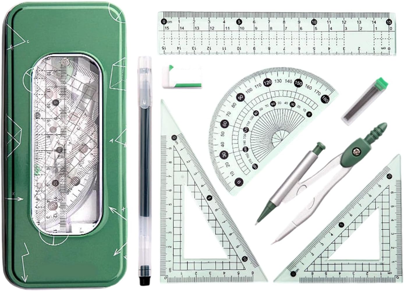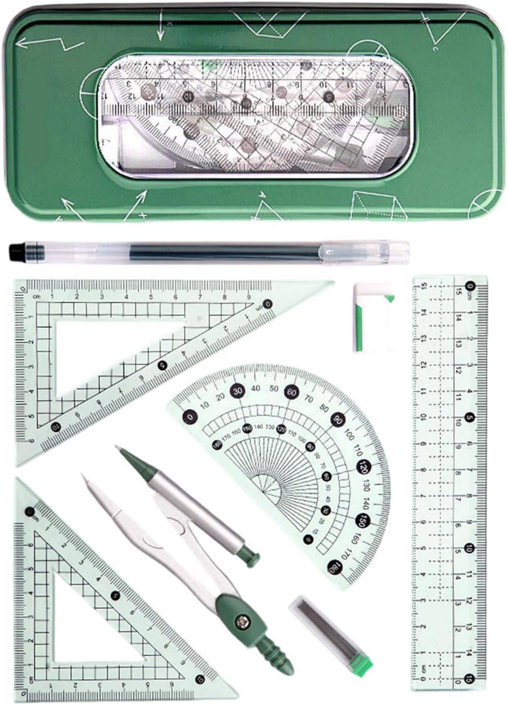 Combinazione multifunzionale: include più righelli e strumenti di disegno, un set che soddisfa diverse esigenze. Problema risolto che un singolo strumento non può svolgere compiti complessi adatti per l'uso in diverse occasioni come scuole, uffici e compiti Il corpo principale plastica abs. Con una dimensione portatile di 18 x 7,5 cm, può essere facilmente collocato in una custodia per matite, facilitando facilmente lo studente senza trasportare alcun carico. non facilmente danneggiato Comoda esperienza di impugnatura: l'ergonomia per prevenire la fatica anche dopo un uso prolungato. Fornire un'esperienza utente più conveniente e migliorare l'efficienza del lavoro agli utenti che hanno bisogno di trascorrere un tempo a disegnare il lavoro Strumento di disegno preciso: le bussole in lega assicurano che ogni cerchio disegnato risolva in modo preciso e senza errori il problema della deformazione delle normali bussole in plastica, adatto per studenti e professionisti che necessitano di un disegno fine Il set di scatole di archiviazione portatile dispone di una scatola di archiviazione dedicata, in modo da poter organizzare facilmente l'intero strumento ed evitare la perdita. Particolarmente adatto per gli uomini d'affari che viaggiano frequentemente o hanno bisogno di indossare articoli di cancelleria per garantire che l'efficienza del lavoro non sia influenzata