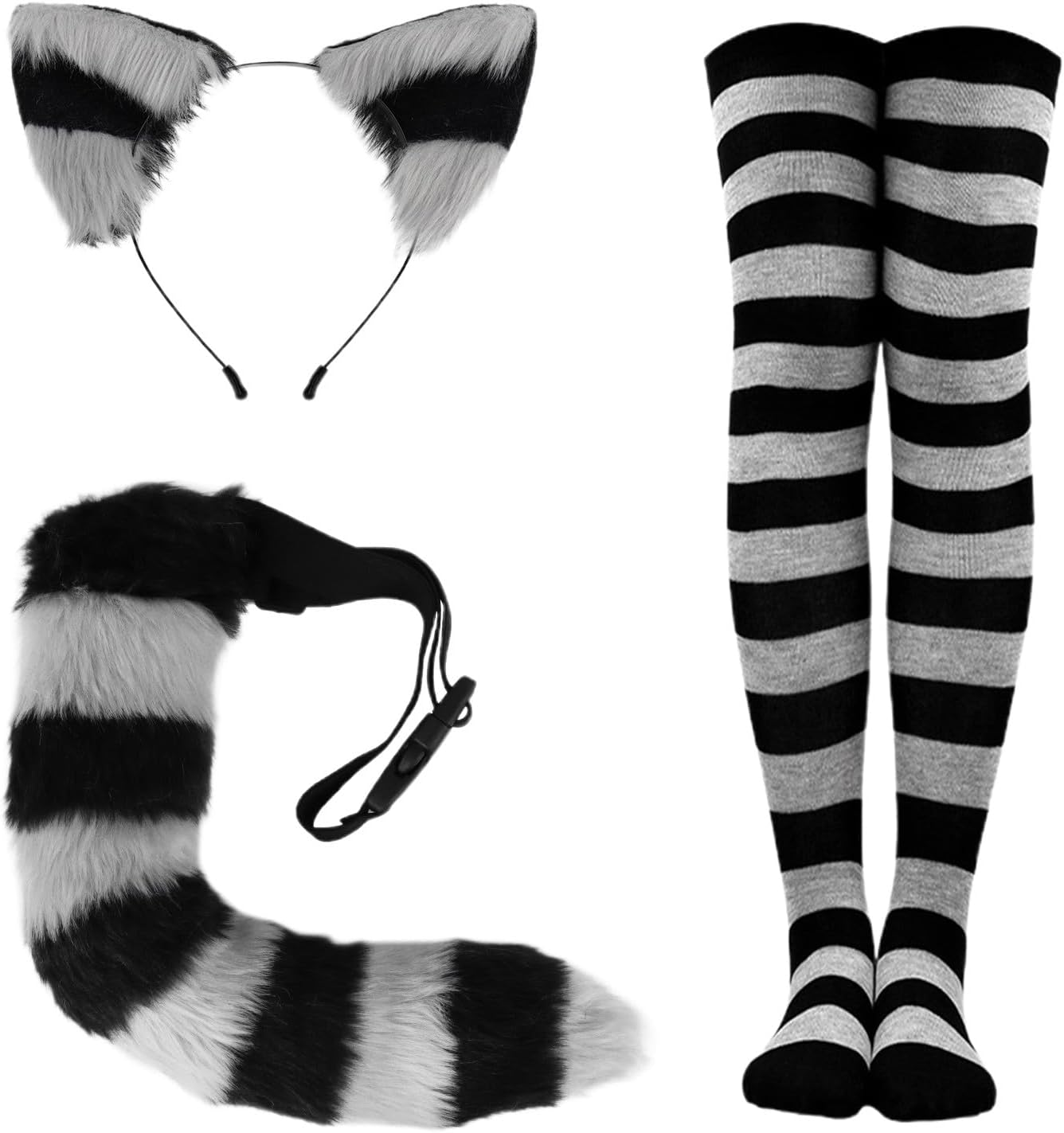 Si tratta di un set COSPLAY a righe con orecchie da gatto, coda di gatto e calze al ginocchio, adatto per feste di Halloween e comic conventions.
