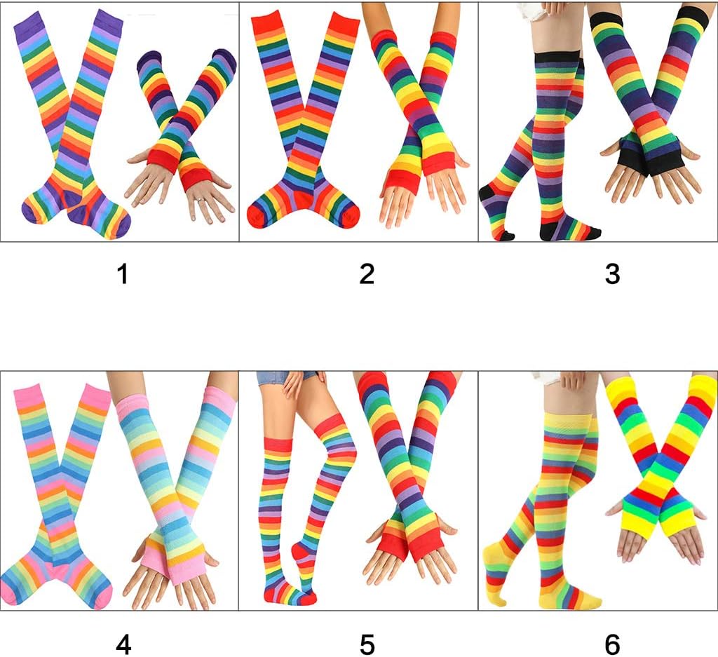 Colore opzionale: rosso 1, nero, rosso 2, giallo Dimensioni: lunghezza guanti: 34 cm (13,38 pollici) Lunghezza calzino: 53 cm (20,86 pollici) Calze: possono essere allungate sopra le ginocchia. Si adattano meravigliosamente senza spremere, hanno un elastico nella parte superiore per evitare che cadano. Guanti: extra elastici e raggiungono fino al gomito, design senza dita e foro per il pollice, molto comodi e pratici. Il design unico arcobaleno con colori è facile per i tuoi diversi abiti, gonne e vestiti e così via. per feste a tema, Halloween, costumi, feste di Natale, Cosplay; il set di accessori arcobaleno può essere messo in risalto durante le feste. La confezione include: 1 paio (2 pezzi) di guanti senza dita, 1 paio (2 pezzi) di calze alte (senza confezione al dettaglio)