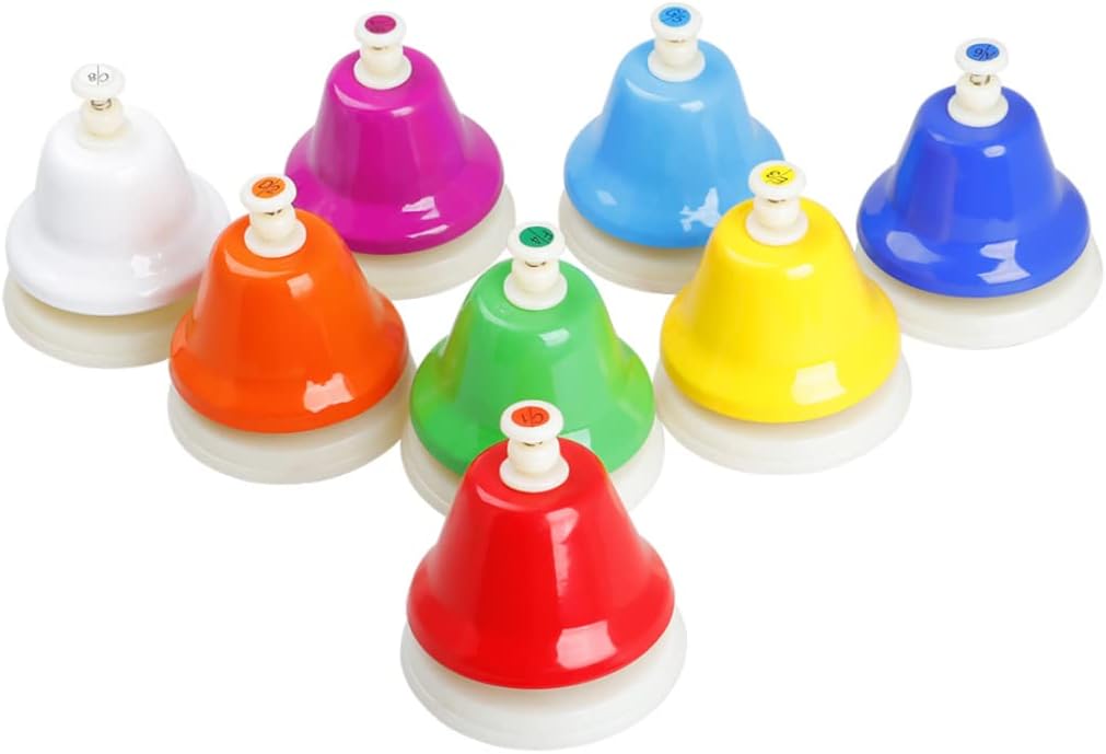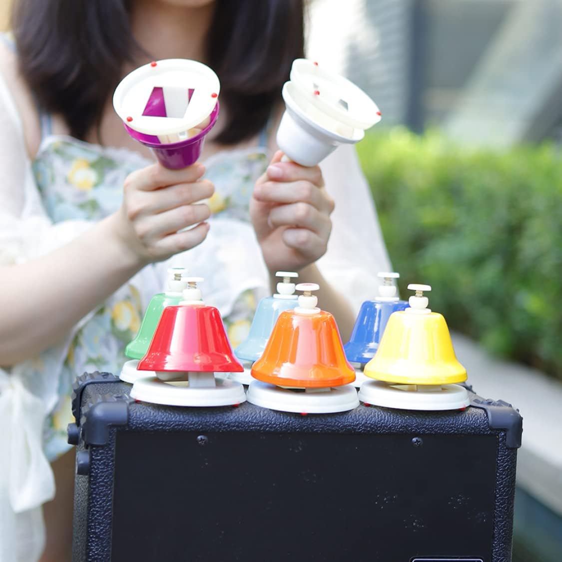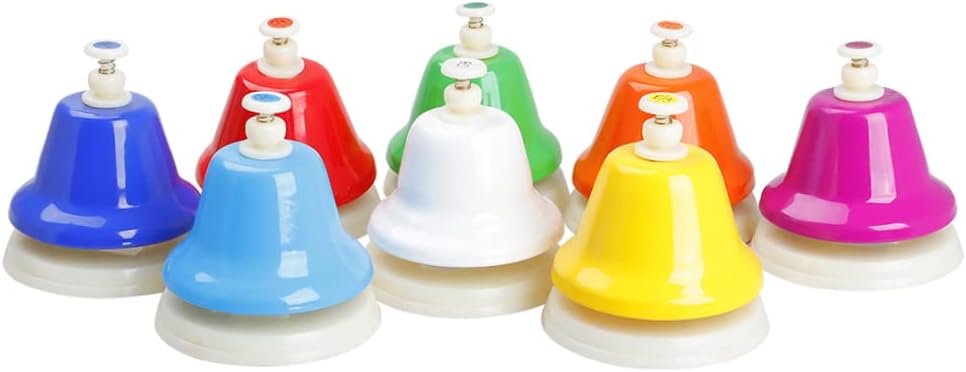 I campanelli da scrivania sono realizzati in metallo e plastica di alta qualità, pregevole fattura, adatti ai bambini per giocare e imparare la musica..La graziosa forma a campana e la varietà di colori design, esercitano la percezione del colore del bambino. Il kit campanello a mano in metallo cromatico con 8 brani spazia da C, D, E, F, , A, B, suono di gioia con tono di C alto..Come giocattolo offrirà un divertimento senza fine e come strumento musicale permetterà ai bambini di giocare immediatamente con le lettere o i colori. 8 campanellini in metallo colorato sintonizzato sono contrassegnati con la nota e il numero pertinenti per aiutare i bambini a imparare la scala musicale e contrassegnati su entrambe le maniglie e sulla parte superiore della campana, facili da riconoscere per principianti o bambini La molla del campanello è forte e ha una buona flessibilità ed è facile suonare il campanello..Basta toccare la parte superiore del campanello della scrivania per emettere un suono meraviglioso! Ci sono tre cuscinetti antiscivolo nella parte inferiore della campana, che rendono difficile lo scivolamento mentre suona..Oscilla a sinistra e a destra per far sì che le parti interne colpiscano la campana ed emettano un suono.