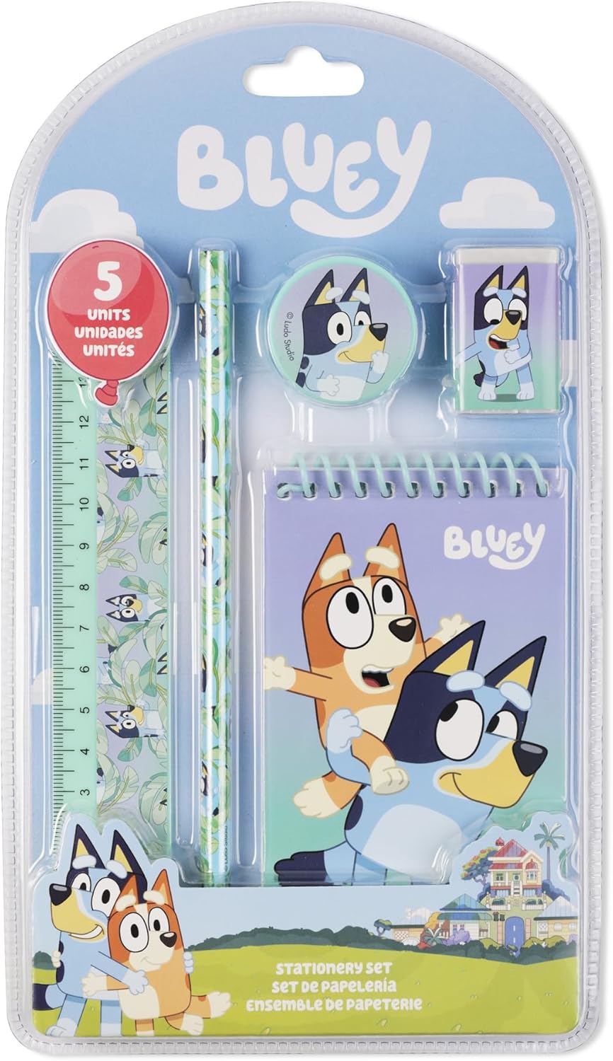 Questo set di cancelleria Bluey da 5 pezzi è l'essenziale per il rientro a scuola per tutti i fan di Bluey. Contiene tutto ciò di cui hanno bisogno per rimanere organizzati e creativi, questo set include un blocco note stampato Bluey, una matita, un righello, una gomma e un temperamatite. Perfetto per il lavoro scolastico e il gioco, ogni articolo è realizzato con design vivaci e accattivanti che portano un tocco di divertimento in ogni attività. Che si tratti di prendere appunti, disegnare o fare i compiti, questo set è un must per aggiungere un po' di carattere alla loro giornata