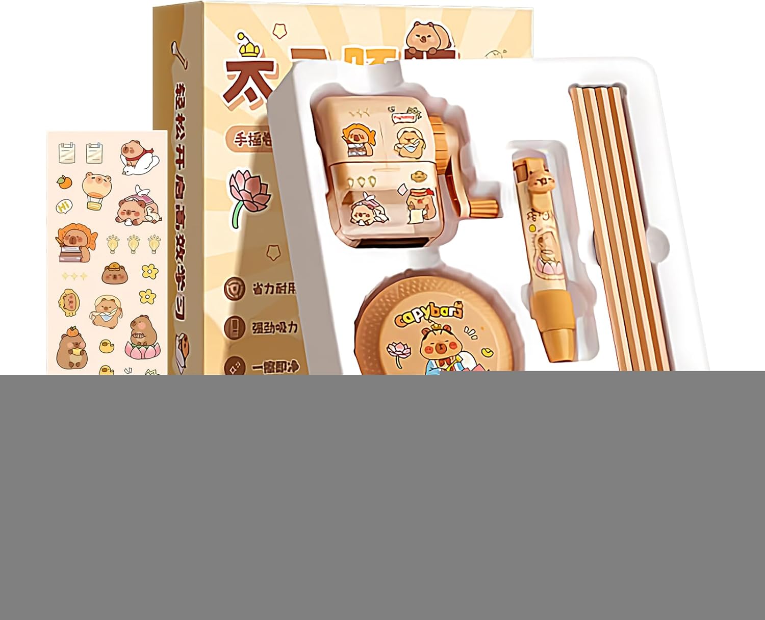 Organizzatore Scrivania Funzionale: Dotato di aspirabriciole elettrico per mantenere l'ordine, temperamatite manuale a manovella per matite affilate e gomme dalla presa comoda per svolgere attività di scrittura in modo efficiente Pulizia Efficiente: La combinazione aspiratore e temperamatite rimuove efficacemente i residui di gomma, creando un ambiente di apprendimento ordinato e confortevole per aumentare la produttività con compatibilità per molteplici varietà di matite Tranquillità Totale: L'eccellente PP garantisce prestazioni stabili con maneggevolezza regolare, offrendo soddisfazione continuativa e rassicurazione durante utilizzi prolungati Divertimento Assicurato: Porta sorrisi a bambini e ragazzi con questo set cancelleria , creato per esprimere cura in occasioni come compleanni, festività stagionali o celebrazioni di Capodanno Strumento Apprendimento Coinvolgente: Con adesivi come capibara e panda astronauta,aumenta l'interesse dei bambini rendendo il materiale didattico visivamente accattivante e stimolante durante lo studio