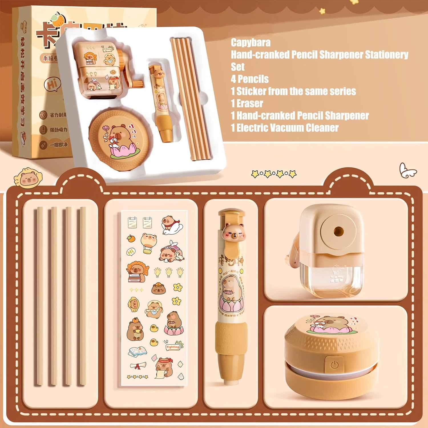 Soluzione Pulizia Multiuso: Combina un efficiente aspirabriciole elettrico per la scrivania, un affidabile temperamatite a manovella e gomme resistenti con impugnatura morbida per un utilizzo quotidiano senza sforzo Pulizia Efficiente: La combinazione aspiratore e temperamatite rimuove efficacemente i residui di gomma, creando un ambiente di apprendimento ordinato e confortevole per aumentare la produttività con compatibilità per molteplici varietà di matite Resistenza Provata: I materiali PP resilienti prevengono da attività giornaliere, offrendo funzionalità duratura ed esperienze senza preoccupazioni con utilizzo costantemente sicuro Divertimento Assicurato: Porta sorrisi a bambini e ragazzi con questo set cancelleria , creato per esprimere cura in occasioni come compleanni, festività stagionali o celebrazioni di Capodanno Materiale Scolastico Accattivante: Questo set con adesivi di capibara e panda astronauta stimola la curiosità dei bambini studio aggiungendo un tocco visivamente dinamico alle attività quotidiane