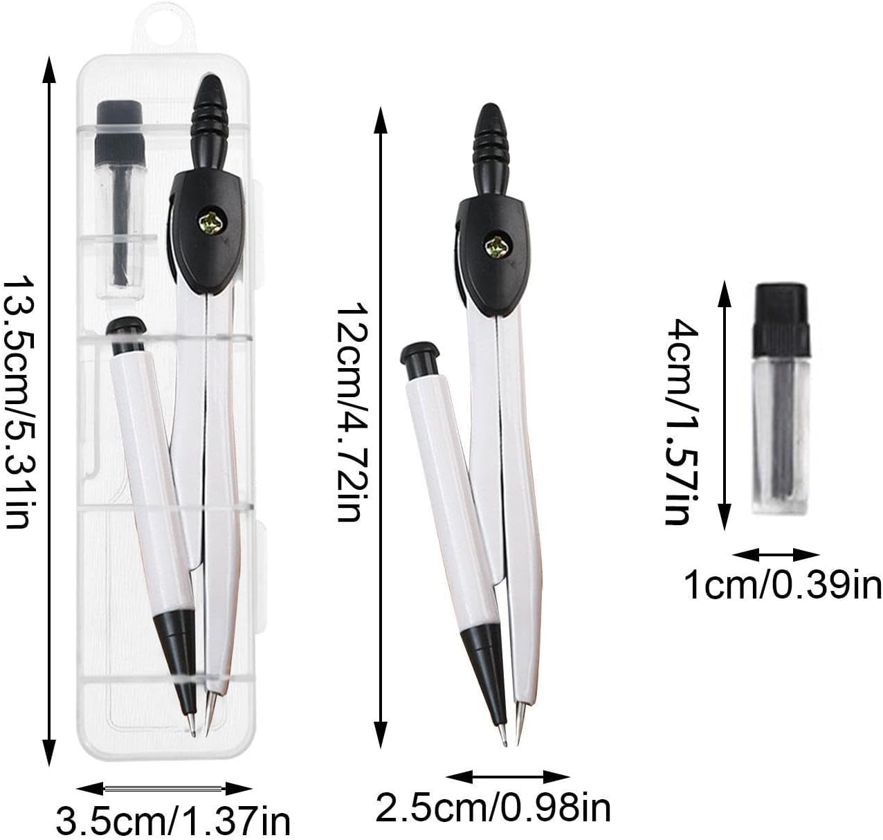 Uso antiscivolo: ottieni misurazioni precise senza sforzo con questo set da disegno. Il suo design antiscivolo e il manico antiscivolo lo rendono facile da usare e più conveniente, garantendo risultati stabili e precisi. Design multiuso: eleva il tuo gioco di disegno con questo versatile set di bussole da disegno. Con molteplici funzioni, è perfetto per lezioni di geometria, progettazione architettonica, redazione, costruzione e altro ancora. Adatto a tutti i livelli, dai principianti ai professionisti. Lunga durata: questo set di bussole da disegno è realizzato in polipropilene di alta qualità che dura a lungo e impermeabilizza efficacemente le bussole. Puoi riutilizzarli per vari progetti senza preoccuparti di ruggine o danni. Comodo da trasportare: con questo set da disegno, puoi portare facilmente i tuoi strumenti ovunque. Alloggiato in una robusta scatola trasparente, fornisce protezione e visibilità pur essendo compatto e leggero. Ideale per creatività e precisione all'aperto. Semplice da usare: migliora la tua esperienza di disegno con facilità utilizzando questo set di compasso. Con la sua funzione semplice da usare, sostituisci la penna come preferisci con un nucleo di piombo da 0,7 mm e un nucleo di ricambio incluso nella confezione.