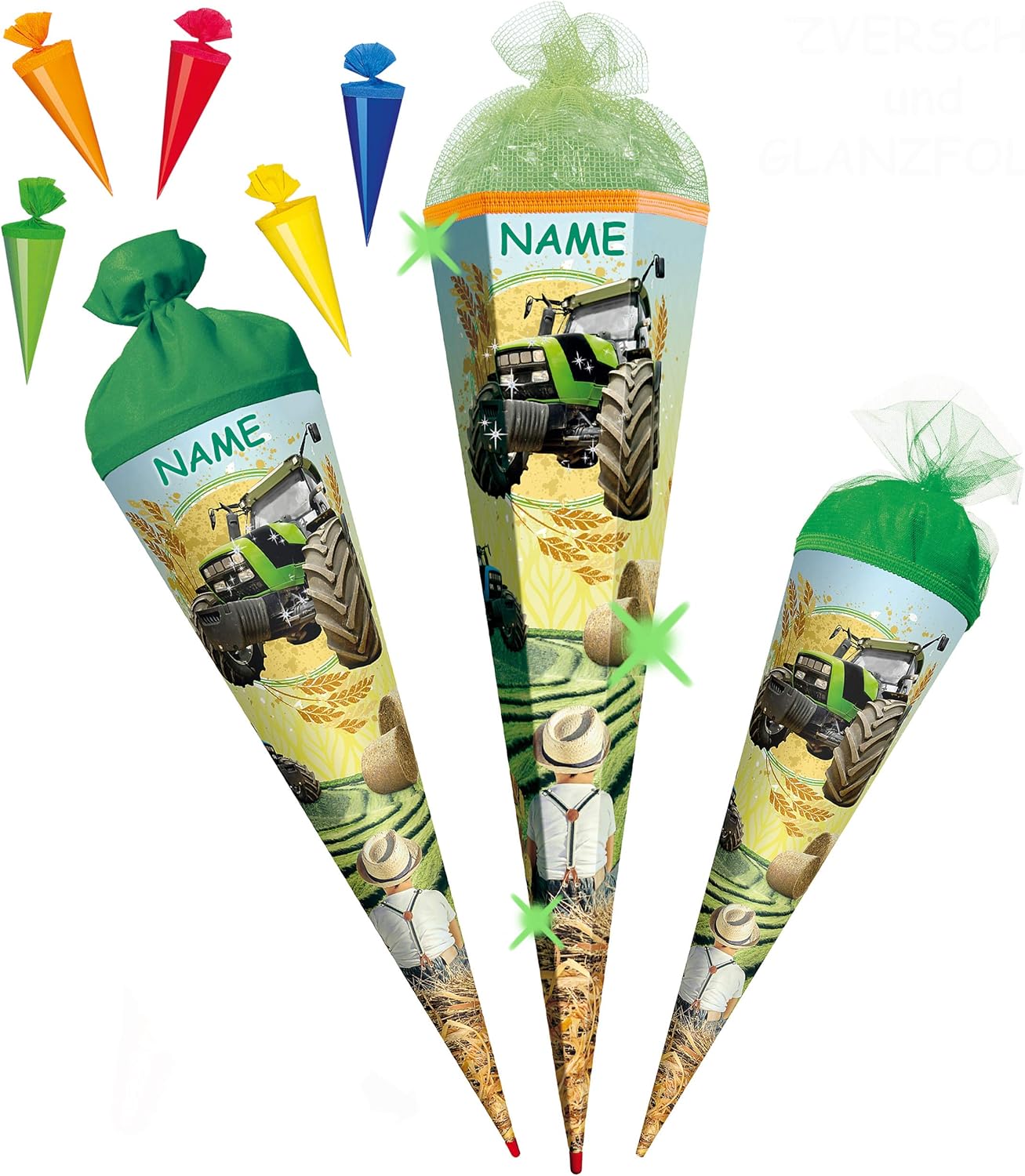fantastico set _____ con bellissimo effetto 3D - stampa GLITTER e mica!! ____ stabile e di alta qualità - cono scolastico ___ 35 cm di lunghezza ___ forma: ROTONDO ____ il bordo superiore ha un elegante bordo intrecciato e una finitura in tulle ____ motivo: "Trattore - Contadino" + 5 pezzi - coni scolastici extra in un colorato mix di colori da appendere o decorare _ Nastro - con il tuo NOME DESIDERATO + nome extra sul cono scolastico! Il nome è attaccato all'arco E al cono della scuola! ___ viene richiesto il nome - AUTOMATICAMENTE entro 4 ore - NON inviare un messaggio in anticipo ___ i modelli di fiocco vengono consegnati misti / cercheremo un bellissimo fiocco effetto 3D abbinato per il tuo cono scolastico (puoi vedere esempi nelle foto) prodotto in Germania! __ Gli anni '70 e '85 hanno una punta in legno stabile e fissata in modo permanente (originale Roth) __ Materiale: cartone rivestito e di alta qualità - SUPER stabile! - idrorepellente! __ fantastici colori di stampa!_____ OPZIONALE è disponibile una punta in plastica abbinata, trasparente e solida da applicare (questo rende la punta del cono scolastico molto stabile e stabile) ---- (questo articolo deve essere ordinato EXTRA al cono scolastico) da abbinare ai coni scolastici/sacchetti regalo ___ ci sono altri piccoli sacchetti da 10 cm come decorazione da appendere, targhette con il nome, decorazioni da tavolo, coni scolastici con steli per composizioni floreali, motivi sparsi, ghirlande e articoli per feste