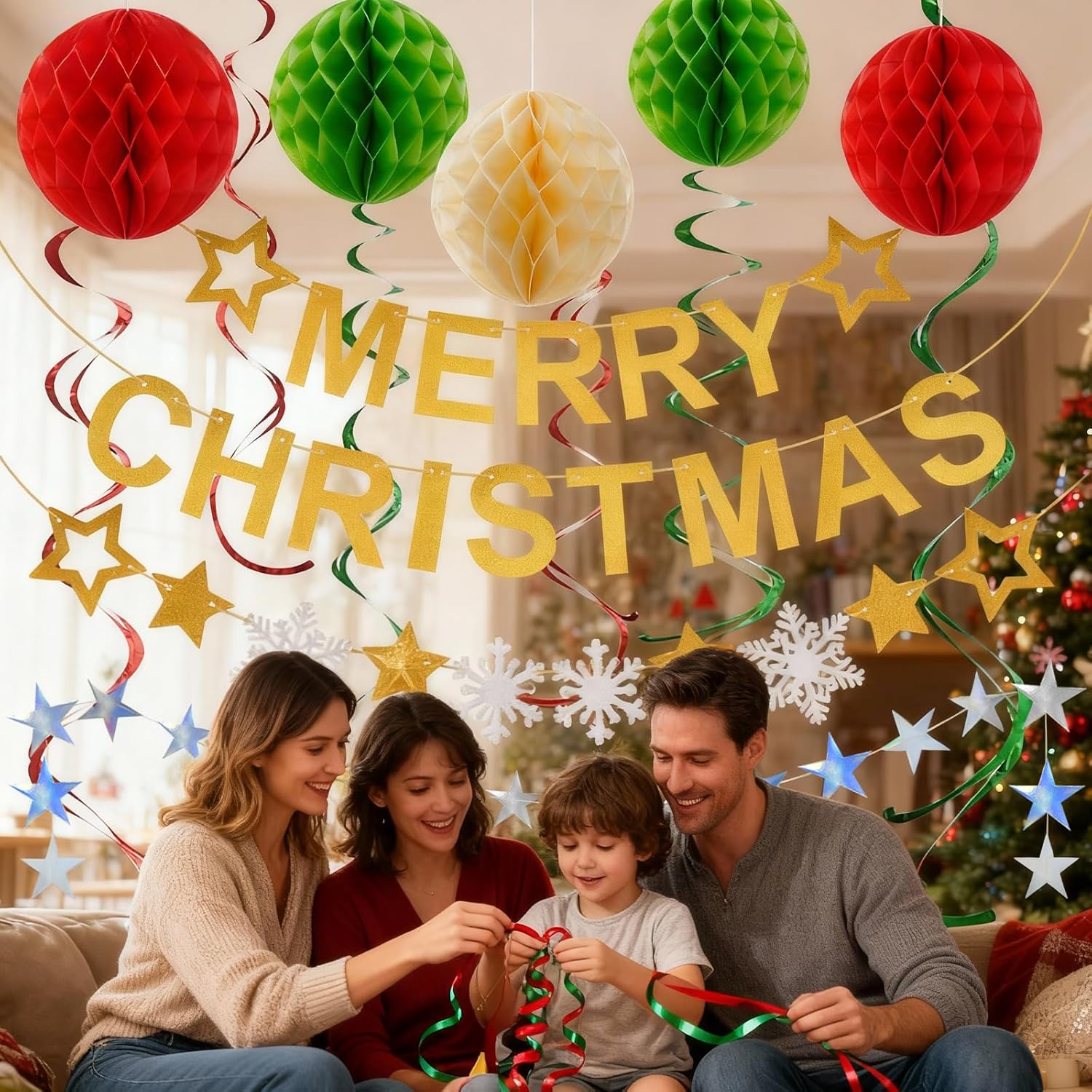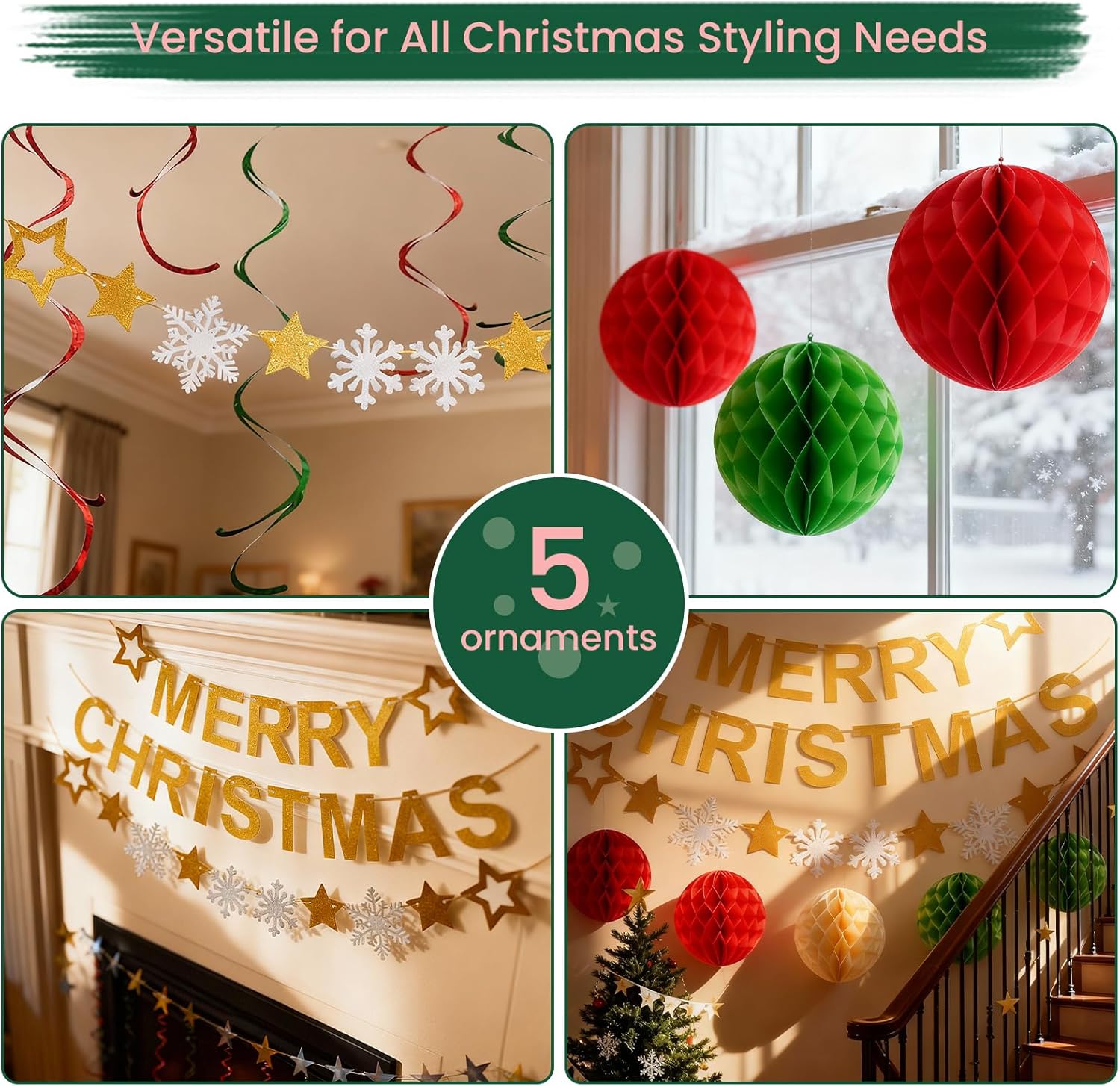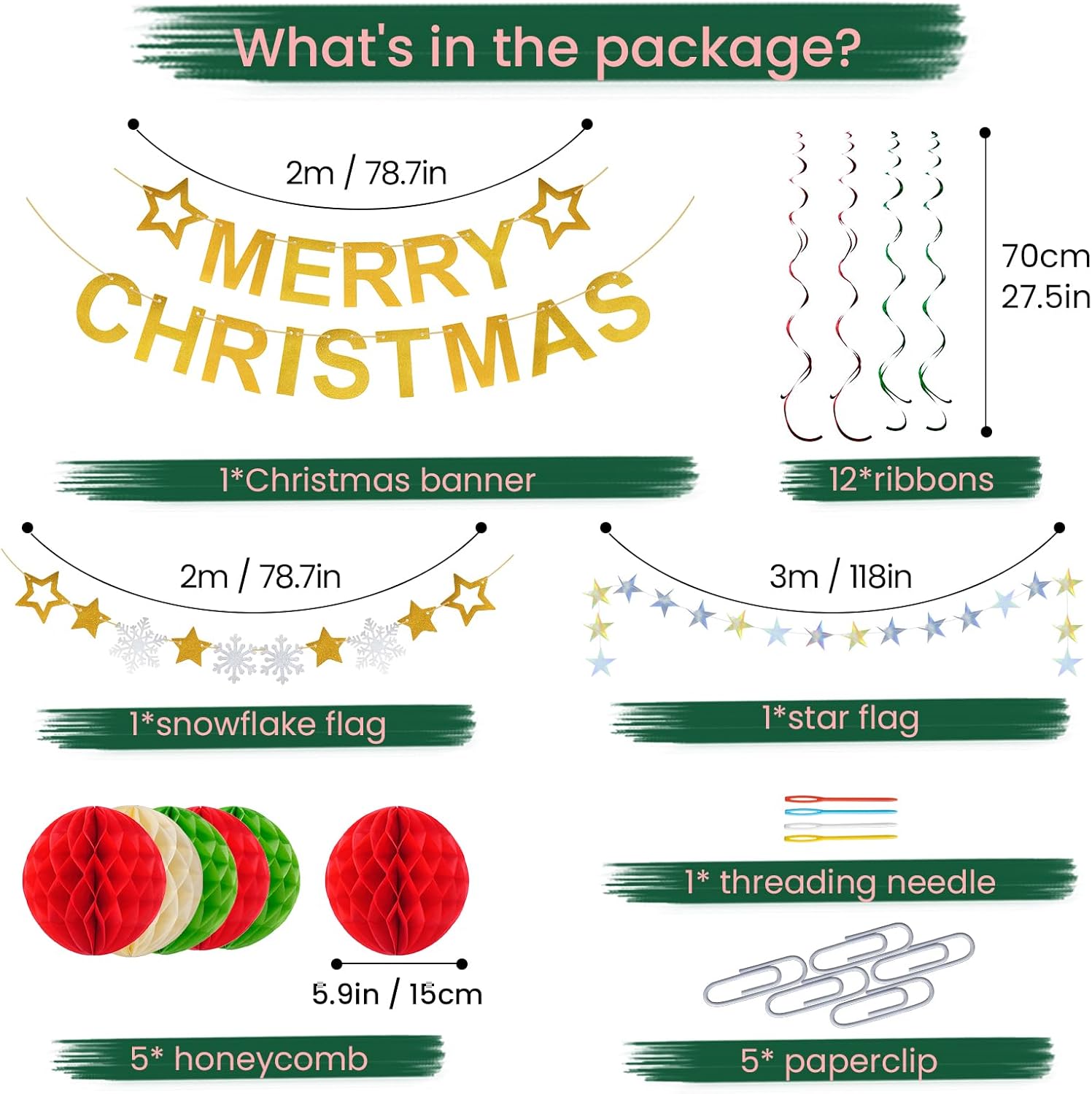 Tema stella di Natale: il pacchetto di decorazioni natalizie Meowoo include 1 striscione di buon Natale, 2 bandiere con fiocchi di neve a stella, 5 palline colorate a nido d'ape, 12 nastri natalizi, 1 ago per filo e 5 graffette. Migliora le tue decorazioni festive con la nostra squisita serie di stelle. I radiosi elementi dorati e laser aggiungono un tocco di lusso al tuo stile festivo. PREMIUM ED ECOLOGICO: Realizzati in cartone riciclato e riutilizzabile di alta qualità, ogni striscione e ogni ornamento con sfera a nido d'ape è progettato per durare. Queste decorazioni natalizie sostenibili sono sicure, non tossiche e progettate per essere riutilizzate per anni, perfette per celebrazioni adatte alla famiglia e rispettose dell'ambiente. Installazione semplice: il kit di installazione completo include nastro autoadesivo, aghi da cucito e morsetti. Basta attaccare le decorazioni con il nastro adesivo, infilare i banner con gli spilli e fissare la composizione con le clip multifunzione. Non sono necessari strumenti o danni: crea l'atmosfera festosa perfetta in pochi minuti. Versatile per tutte le idee di decorazione natalizia: dalle decorazioni natalizie per il soffitto agli stendardi per il camino, questa decorazione per la stanza offre infinite possibilità. Decora finestre, pareti, alberi, tavoli o scale con questi pezzi versatili. A casa, in ufficio o alla festa di Natale, questa decorazione diffonde ovunque un'atmosfera festosa. Conservazione riutilizzabile: le nostre decorazioni natalizie per ufficio sono disponibili in imballaggi riutilizzabili senza plastica per una conservazione ordinata. Unisciti a migliaia di clienti soddisfatti che scelgono questo set eco-consapevole e di ispirazione vintage per un Natale tradizionale ma alla moda.
