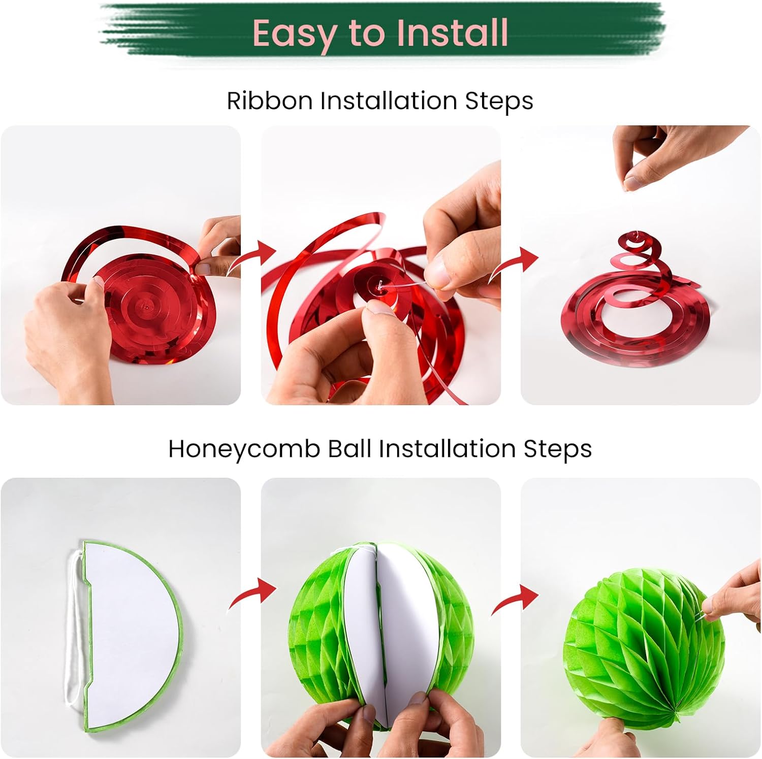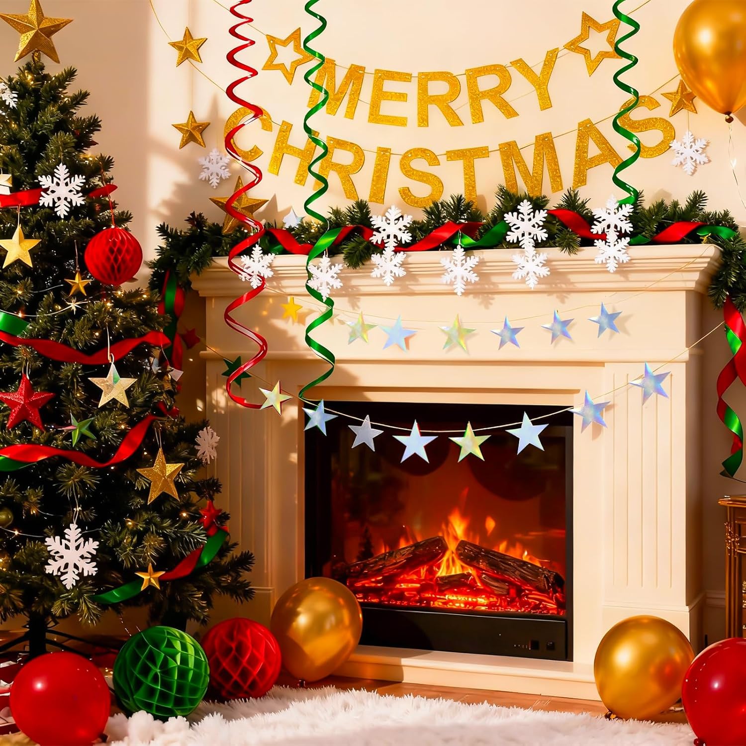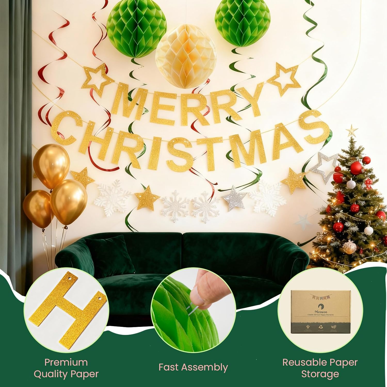 Tema stella di Natale: il pacchetto di decorazioni natalizie Meowoo include 1 striscione di buon Natale, 2 bandiere con fiocchi di neve a stella, 5 palline colorate a nido d'ape, 12 nastri natalizi, 1 ago per filo e 5 graffette. Migliora le tue decorazioni festive con la nostra squisita serie di stelle. I radiosi elementi dorati e laser aggiungono un tocco di lusso al tuo stile festivo. PREMIUM ED ECOLOGICO: Realizzati in cartone riciclato e riutilizzabile di alta qualità, ogni striscione e ogni ornamento con sfera a nido d'ape è progettato per durare. Queste decorazioni natalizie sostenibili sono sicure, non tossiche e progettate per essere riutilizzate per anni, perfette per celebrazioni adatte alla famiglia e rispettose dell'ambiente. Installazione semplice: il kit di installazione completo include nastro autoadesivo, aghi da cucito e morsetti. Basta attaccare le decorazioni con il nastro adesivo, infilare i banner con gli spilli e fissare la composizione con le clip multifunzione. Non sono necessari strumenti o danni: crea l'atmosfera festosa perfetta in pochi minuti. Versatile per tutte le idee di decorazione natalizia: dalle decorazioni natalizie per il soffitto agli stendardi per il camino, questa decorazione per la stanza offre infinite possibilità. Decora finestre, pareti, alberi, tavoli o scale con questi pezzi versatili. A casa, in ufficio o alla festa di Natale, questa decorazione diffonde ovunque un'atmosfera festosa. Conservazione riutilizzabile: le nostre decorazioni natalizie per ufficio sono disponibili in imballaggi riutilizzabili senza plastica per una conservazione ordinata. Unisciti a migliaia di clienti soddisfatti che scelgono questo set eco-consapevole e di ispirazione vintage per un Natale tradizionale ma alla moda.