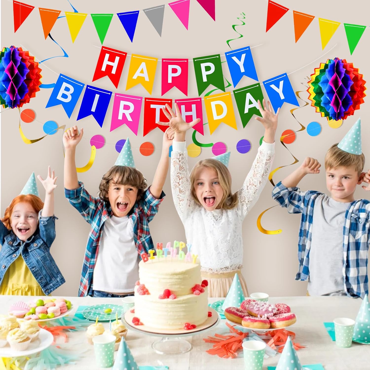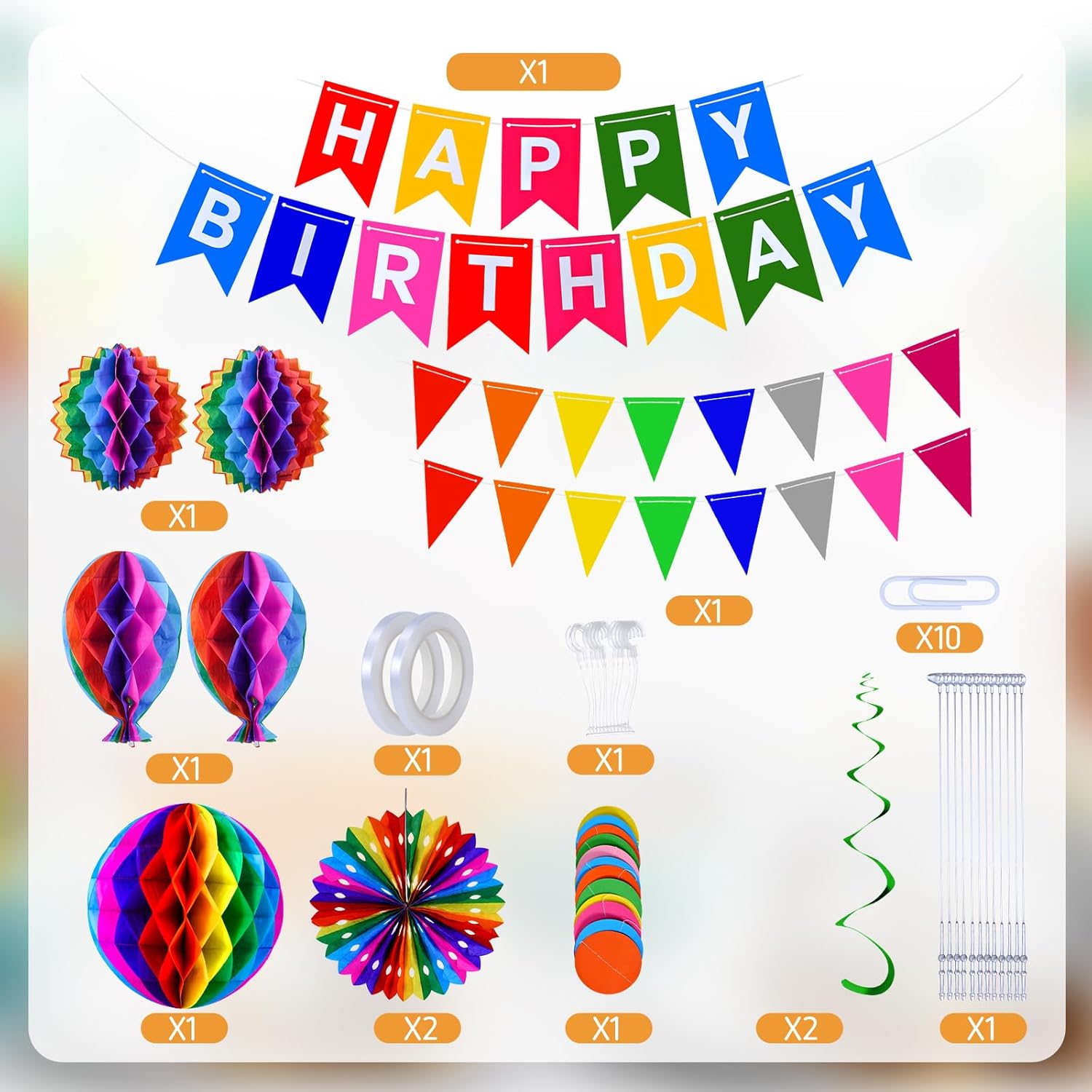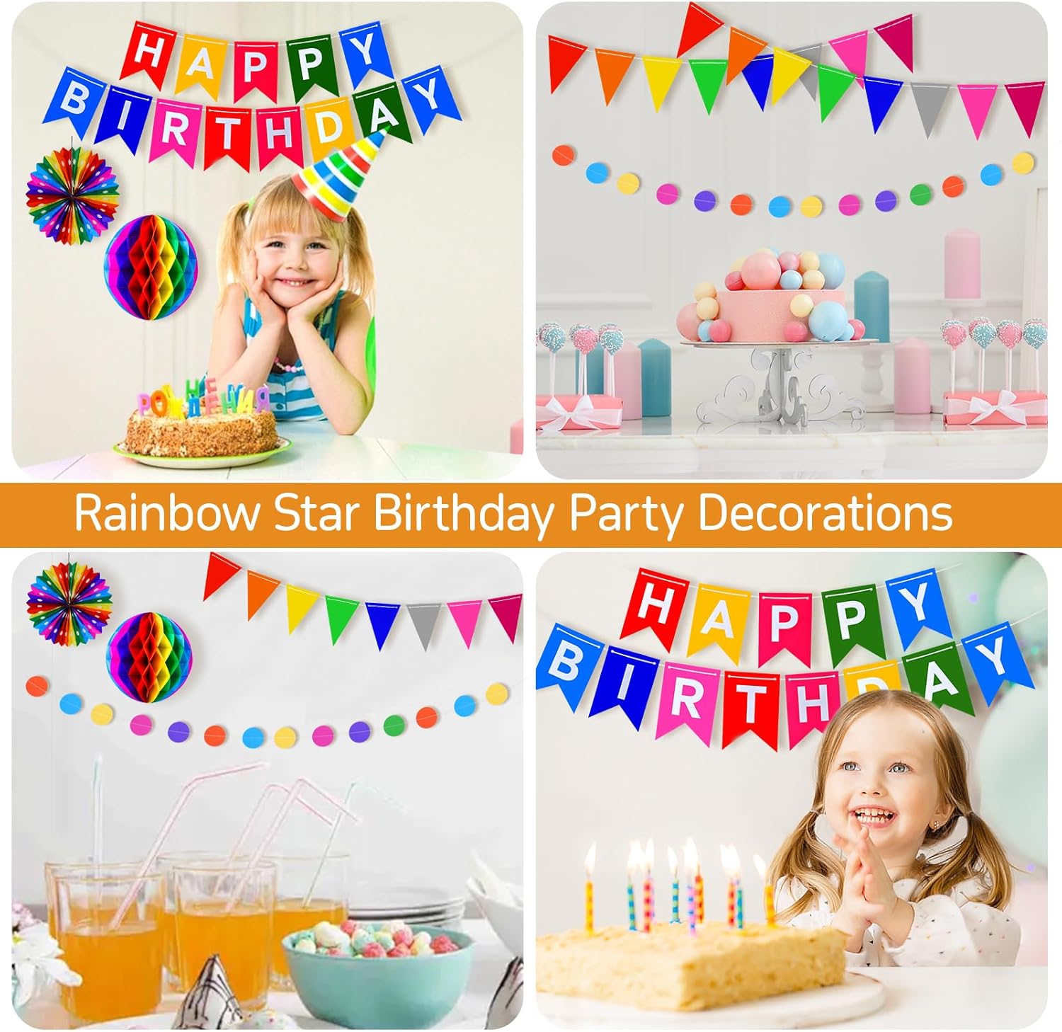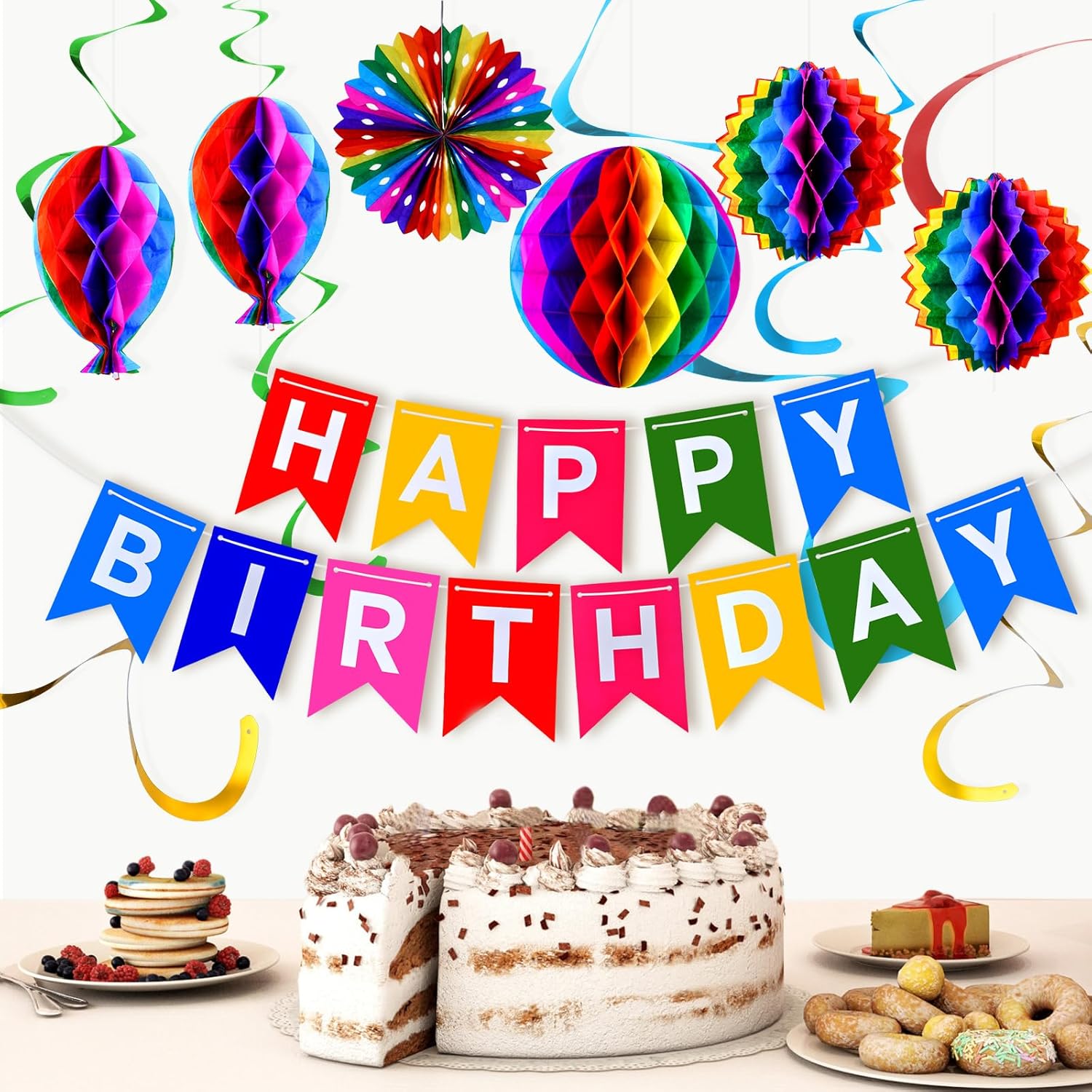 Decorazioni di compleanno arcobaleno: questa confezione per feste presenta una varietà di decorazioni colorate, tra cui: 1 striscione multioccasione, 1 mini bandierina, 1 ghirlanda di carta, 8 stelle filanti e 7 decorazioni 3D in carta a nido d'ape (1 pallina, 2 palloncini, 2 palline sfocate, 2 dischi). Ampia gamma di decorazioni: è possibile utilizzare per appendere striscioni su tende, pareti, tavoli per feste, finestre o archi. Sono perfetti anche per decorazioni per feste in giardino con il bel tempo, aggiungendo un'atmosfera gioiosa al tuo evento. Facile da installare: queste decorazioni di compleanno sono semplici da montare, rendendole perfette per festeggiare compleanni o feste. Puoi facilmente decorare con la tua famiglia, divertendoti a metterli insieme. Rendono le decorazioni per feste un gioco da ragazzi e piene di gioia. Celebrazione sostenibile: queste decorazioni di compleanno, realizzate principalmente con materiali cartacei, possono essere riutilizzate senza preoccuparsi degli sprechi. Puoi goderti queste squisite decorazioni in ogni giorno speciale. Inoltre, oggetti come ventagli di carta e palline a nido d'ape possono anche essere utilizzati come semplici decorazioni per la casa e il giardino dopo il compleanno. Decorazioni perfette per feste di compleanno: ideali per feste di compleanno di donne, bambini e ragazze, baby shower, battesimi e altre celebrazioni. Possono essere utilizzati come decorazioni per ghirlande, oggetti di scena fotografici e altro ancora. Il set di decorazioni arcobaleno è anche un regalo meraviglioso per compleanni, matrimoni e altre occasioni speciali.