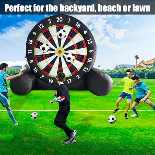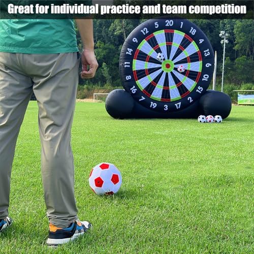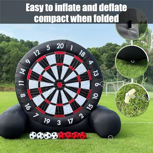 Set completo: la confezione include un soffiatore elettrico, 8 palloni da calcio, 4 picchetti, 4 frangivento, 4 sacchi di sabbia e una comoda borsa per un facile trasporto. Uso multifunzionale: ideale per allenamenti personali o eventi di squadra, questa attività è ideale per competizioni familiari o esercizi di team building, rendendola una fantastica aggiunta a qualsiasi riunione in giardino. Facile da usare: il bersaglio gonfiabile da calcio dispone di 8 palloni da calcio in morbido feltro e vanta un impressionante diametro di 300 cm, offrendo un'esperienza divertente sia per bambini che per adulti. Qualità premium: progettato per durare nel tempo, il bersaglio presenta cuciture doppie per una migliore tenuta d'aria e longevità, insieme a un kit di riparazione, picchetti, frangivento, sacchi di sabbia e una custodia. Installazione semplice: questo bersaglio gonfiabile può essere gonfiato e montato in meno di 5 minuti, e si sgonfia e si piega facilmente in una forma compatta per riporlo e trasportarlo senza problemi.