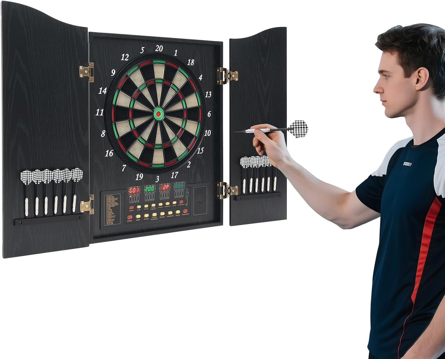 【Automatico】: la tavola elettronica offre oltre venticinque varianti di gioco per un massimo di sedici giocatori, in modo che i giocatori di hobby e occasionali in cantina o hobby possano godere di vari giri senza contare manualmente grazie al luminoso display a LED Display a LED: i quattro segmenti a LED mostrano chiaramente i punti e il corso del gioco, in modo che tutti i giocatori in salotto o in cantina possano riconoscere il supporto in qualsiasi momento e concentrarsi sui lanci senza litigare Montaggio a parete: il design piatto con fori preforati consente un facile montaggio alla parete o alla porta dell'armadio, in modo che la tavola possa essere appesa in ufficio o in sala hobby per risparmiare spazio e occupa poco spazio dopo la piegatura Frecce di sicurezza: le punte in plastica delle frecce in dotazione riducono il rischio di lesioni per bambini e adulti, mentre il robusto campo MDF assorbe le frecce in modo sicuro e protegge mobili e pareti da eventuali danni 【Bambini adulti】 grazie al pulsante intuitivo e alla guida in lingua tedesca e inglese, i giovani e gli anziani possono iniziare subito e divertirsi insieme mentre allenano la coordinazione e la concentrazione degli occhi