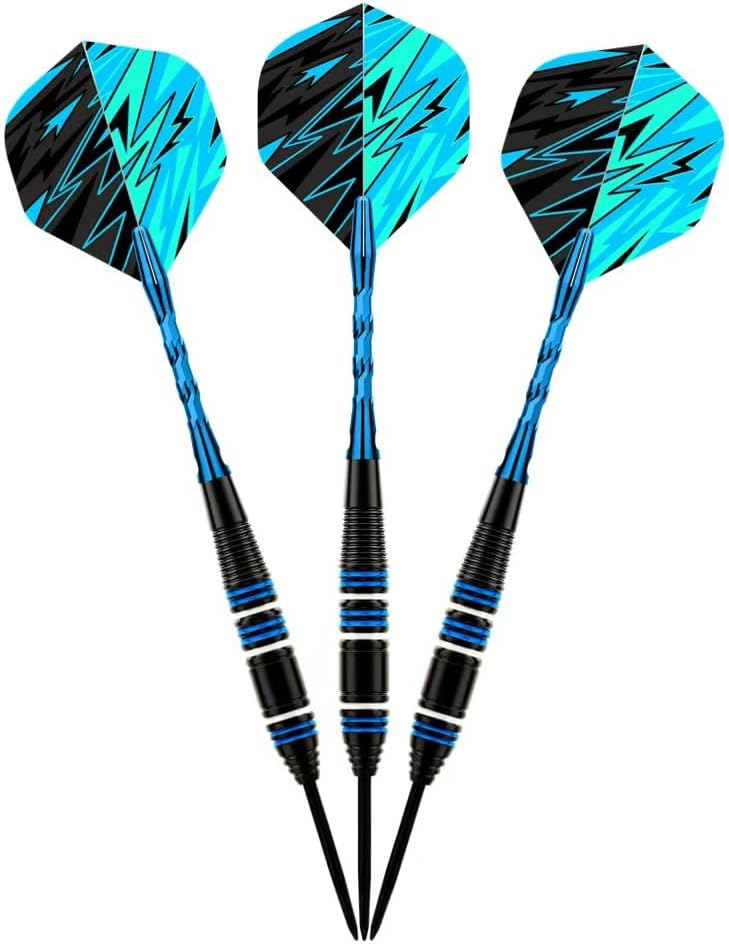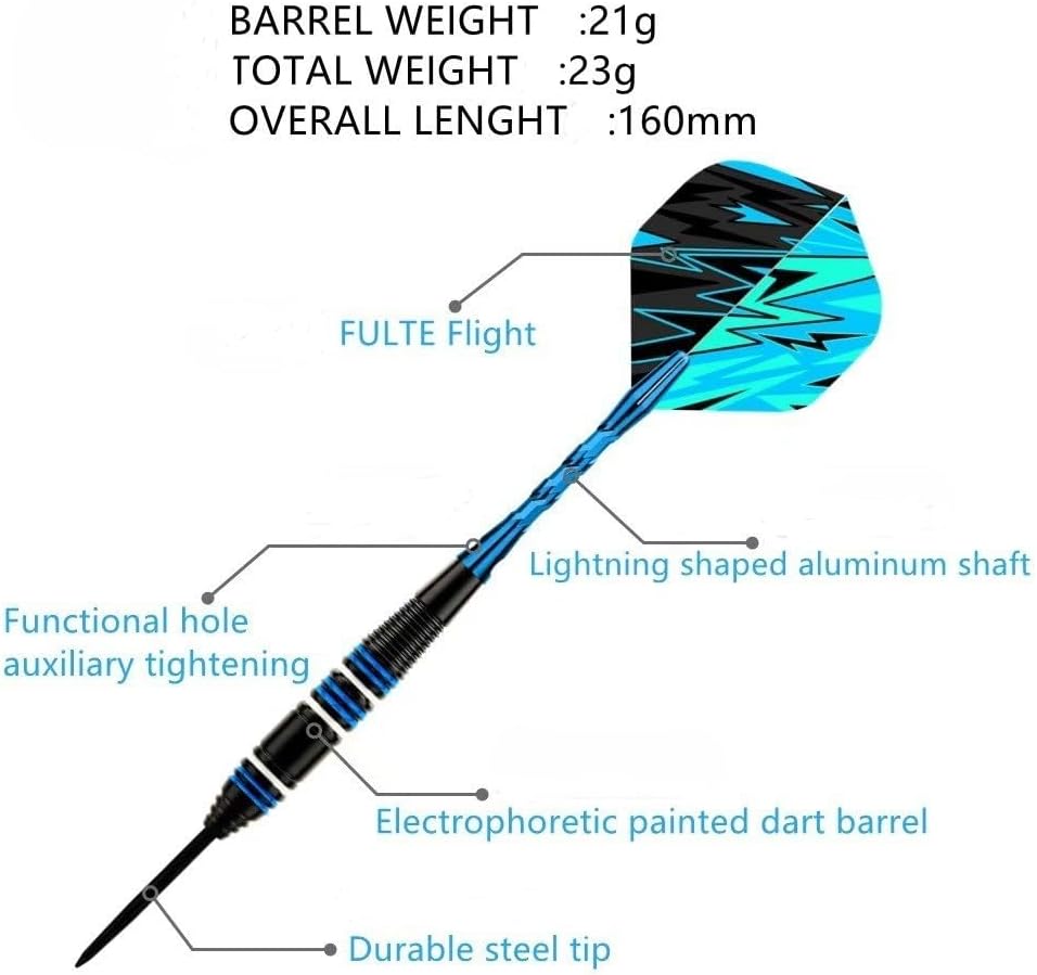 Set di freccette in acciaio: 3 freccette con punta in acciaio da 23 g, 6 alette in PVC, 3 astine in alluminio, 3 alberi di ricambio, 12 O-ring in gomma, 3 anelli a molla, 1 portector per freccette, 1 custodia per freccette. Freccette professionali: le freccette sono state accuratamente progettate pensando ai veri appassionati di freccette. Le freccette con punta in acciaio progettate con barili in ottone, le aste in alluminio sono molto popolari in quanto sono più resistenti e infrangibili. Perfetto per l'uso quotidiano da parte di tutti i giocatori e con 3 alberi di ricambio per ogni giocatore. Alette in PVC: le alette per freccette sono specificamente progettate per aumentare la velocità e mantenere l'equilibrio, offrendo una traiettoria di volo costante e una precisione precisa. L'effetto laser li rende brillanti e attraenti in ogni modo. Perfetto per ogni giocatore: set di freccette professionali per tutti i livelli di abilità. Non importa se giochi professionalmente, vuoi allenarti o semplicemente per divertimento, queste freccette sono ideali per un grande gioco. Sono perfette come Natale o compleanno per chi è fuori a freccette. Acquisto del set di freccette: non dovrai più preoccuparti di perdere freccette e accessori. Mettili tutti in modo intelligente in una custodia per freccette, protezione da danni o incidenti. Puoi acquistare con fiducia. Siamo molto sicuri che rimarrai colpito dalla qualità delle freccette. Ordina oggi per perfezionare il tuo equilibrio strategico e le tue abilità di lancio.