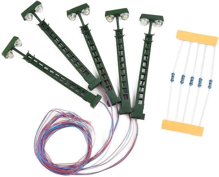 Illuminazione realistica in scala N: migliora le tue scene di illuminazione ferroviaria in miniatura con luci ferroviarie in scala n finemente lavorate, portando bagliore autentico e atmosfera a qualsiasi configurazione di illuminazione del layout del calibro n per una maggiore collisione. Componenti del set completo: la confezione include 5 unità lampada a traliccio e 5 resistenze per un collegamento sicuro a 12-16 V, rendendo questi accessori per modellini ferroviari pronti da integrare nella tua collezione di parti ferroviarie esistenti. Illuminazione a LED precisa: ogni luce dell'albero a led da 2,7 pollici funziona a 3V DC/AC con assorbimento di corrente di 20 mA, luce costante per evidenziare tracce, stazioni o edifici senza sopraffare dettagli delicati dello scenario. Struttura e dettagli in metallo: costruiti con robusti alberi in metallo e design realistico a reticolo, questi elementi luminosi ferroviari modello 3v aggiungono una struttura precisa alla scala al tuo layout pur rimanendo di lunga durata sotto un uso regolare. Integrazione sicura e facile: adatta per hobbisti dai 14 anni in su, queste lampade evitano i danni utilizzando resistori chiusi con trasformatore di tensione superiore, assicurando un'installazione fluida all'interno del progetto di parti ferroviarie modello.
