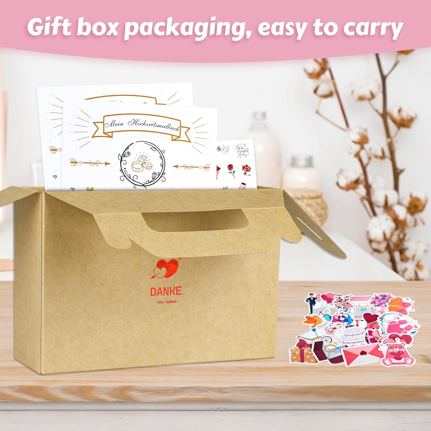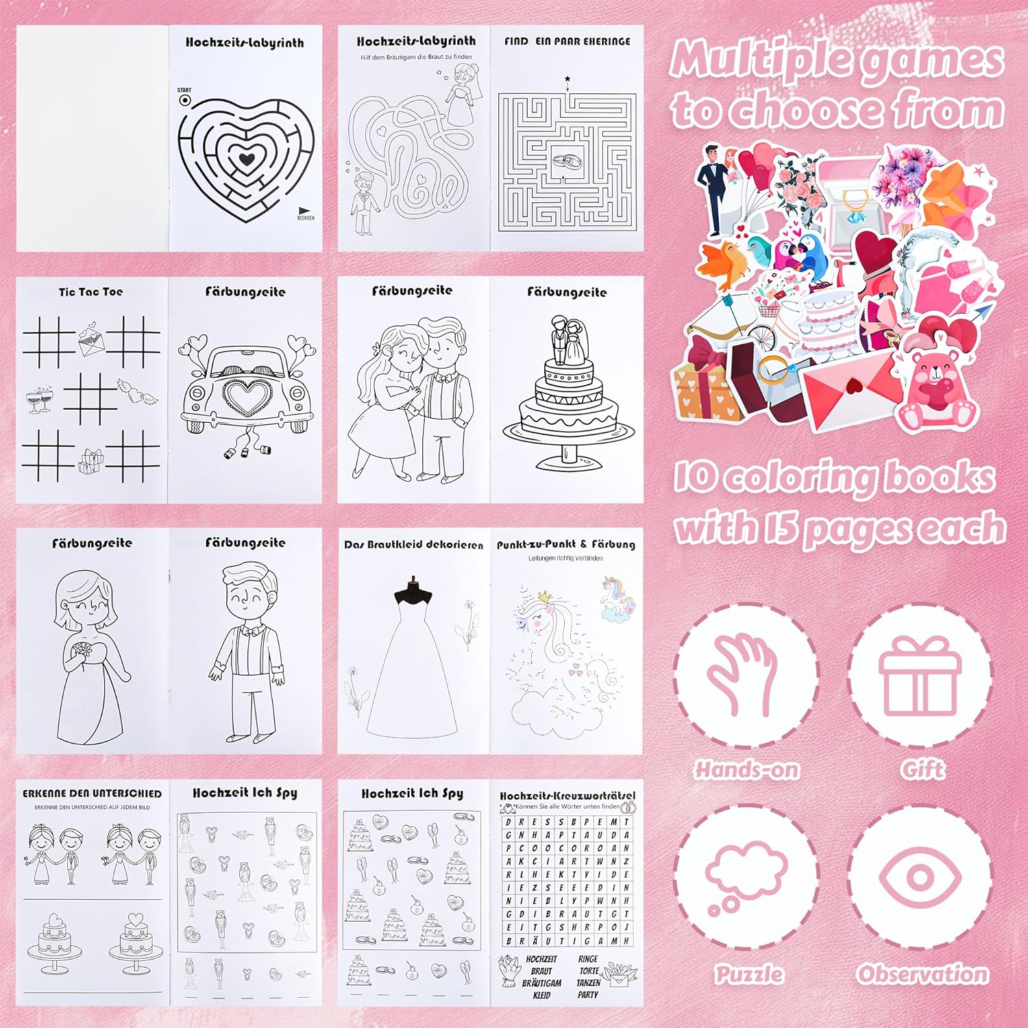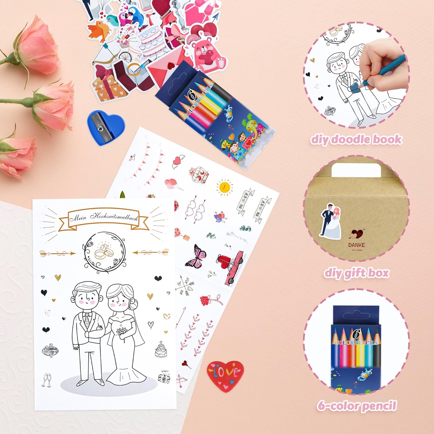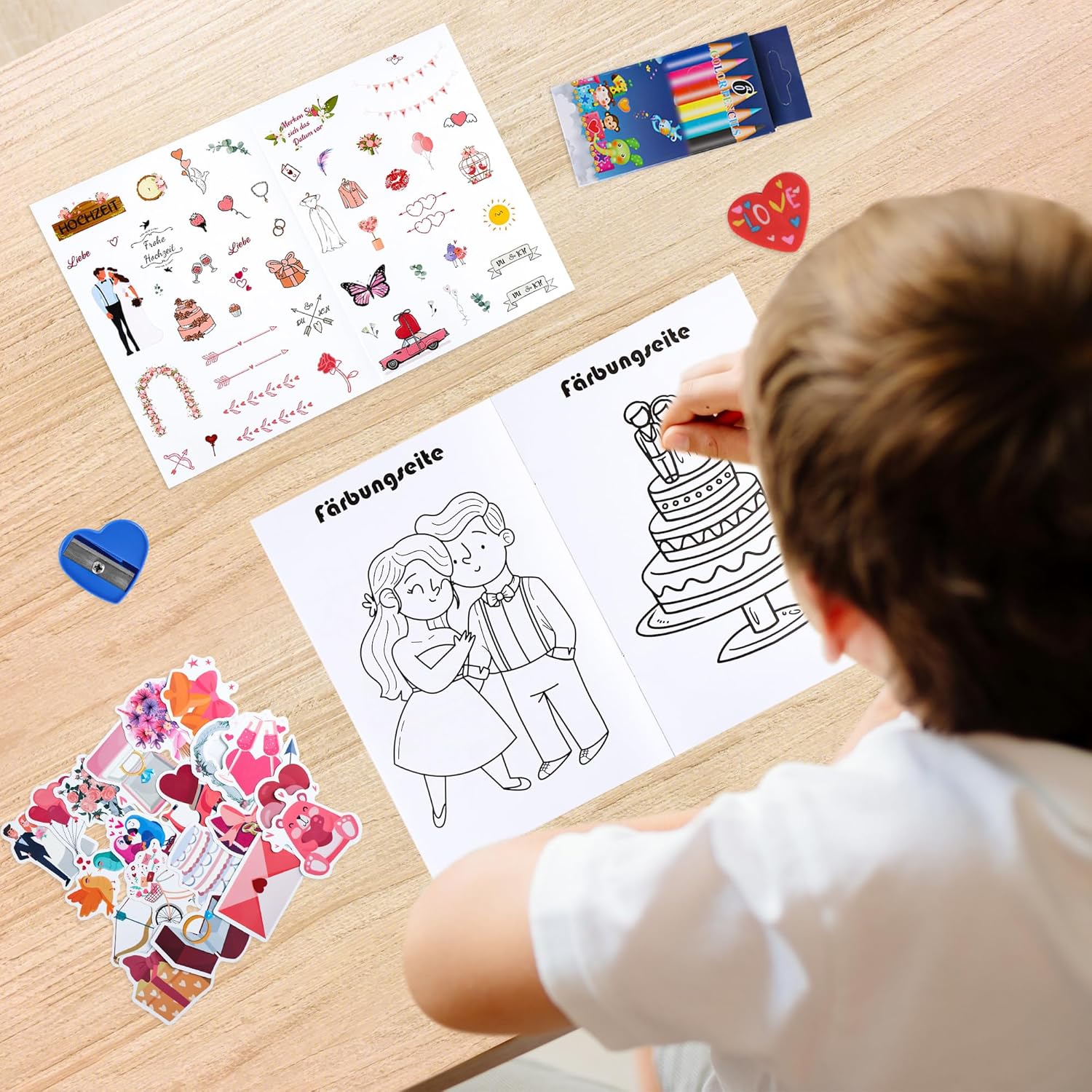 GIOCHI DI MATRIMONIO PER GLI OSPITI: arricchite la festa di nozze per i piccoli ospiti con il nostro set di 10 libri da colorare per matrimoni, date ai bambini un momento di relax e rendete il matrimonio un'esperienza indimenticabile per tutti i presenti! Set completo per divertimento creativo: il libro da colorare con le matite è disponibile in un set completo, composto da 10 album per matrimoni, 60 matite colorate, 2 temperamatite a forma di cuore, 10 gomme da cancellare a forma di cuore, 2 grandi fogli con adesivi a tema matrimonio, 20 adesivi impermeabili per matrimoni, 1 confezione regalo in carta kraft ecologica, un fantastico matrimonio per bambini, per godersi il matrimonio. Il quaderno da colorare ideale per ragazze e ragazzi Enigmi emozionanti e immagini da colorare: il nostro libro da colorare per matrimoni non ha solo immagini incredibilmente carine da colorare, ma anche alcuni fantastici puzzle come un labirinto, trova l'errore o un gioco in cui i più piccoli devono trovare certe persone al matrimonio. Con esso, sono garantiti per un po 'di tempo e i genitori possono godersi la celebrazione rilassata. Con un paio di adesivi aggiuntivi sarà una bella occupazione per i bambini. REGALI PER GLI OSPITI PERFETTI: c'è molto da scoprire nel nostro libro da colorare: fantastiche immagini da colorare e puzzle emozionanti che solo i veri detective possono risolvere. Questo è confortante per i genitori e divertente per i bambini. Il libro da colorare per bambini è il regalo perfetto per i piccoli ospiti del vostro matrimonio.