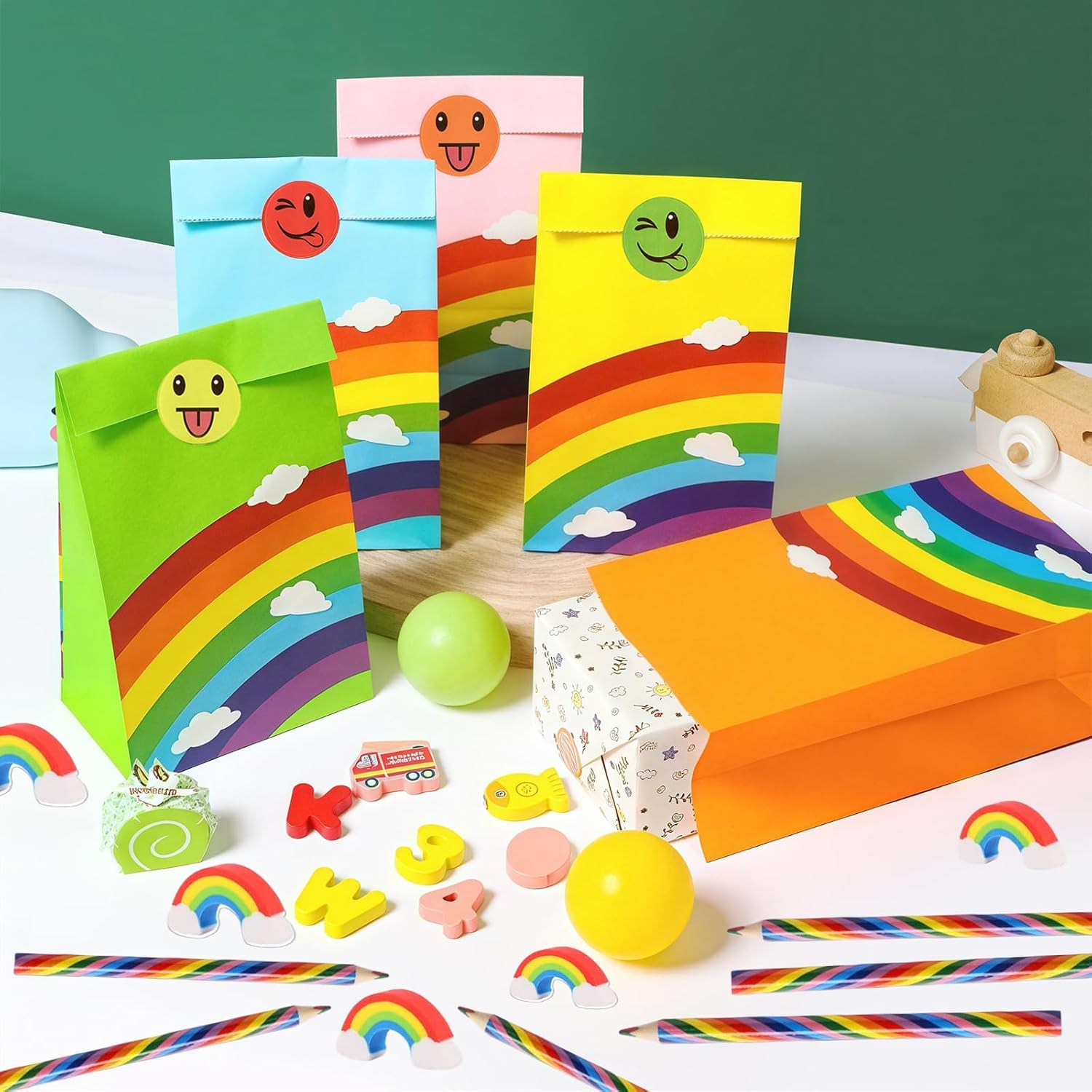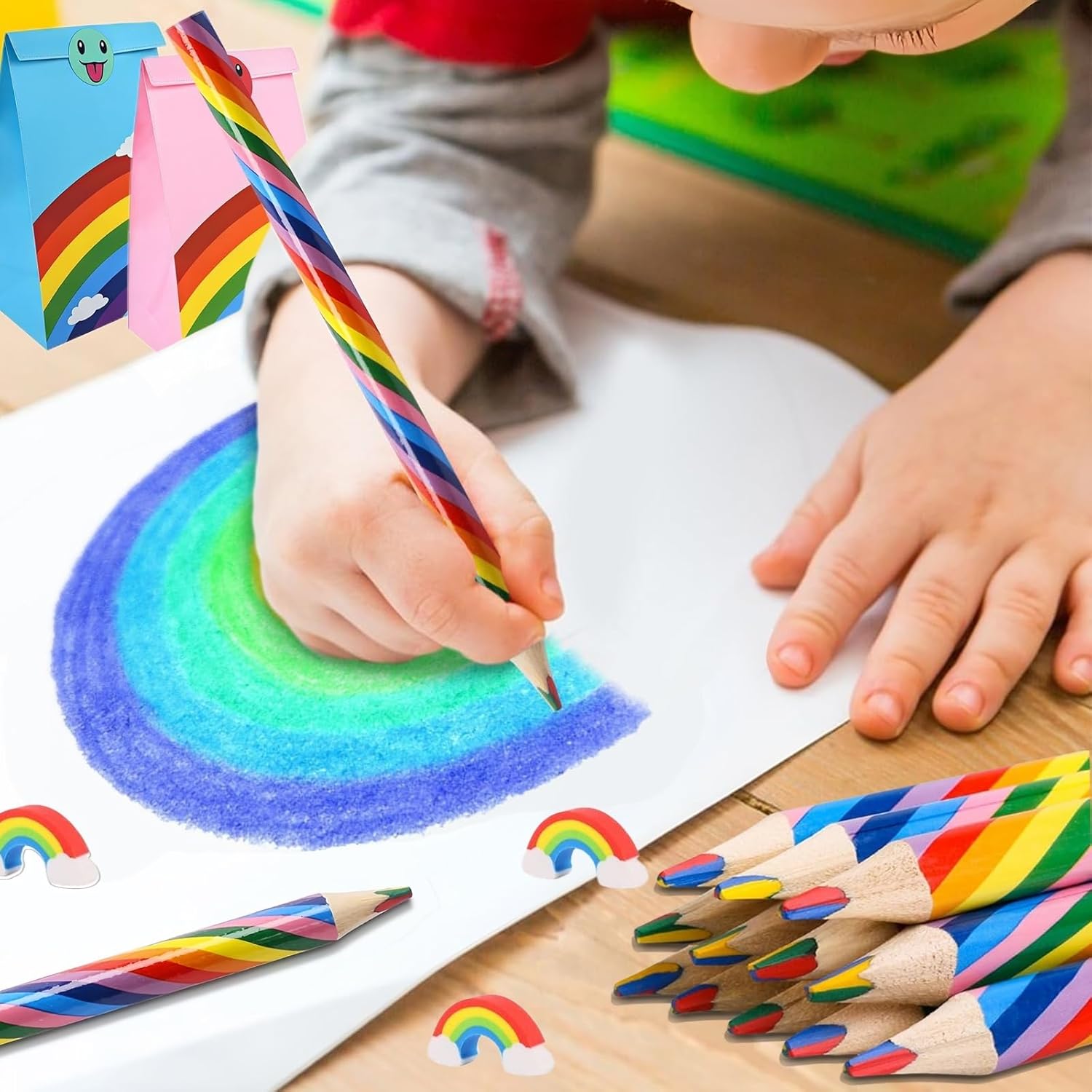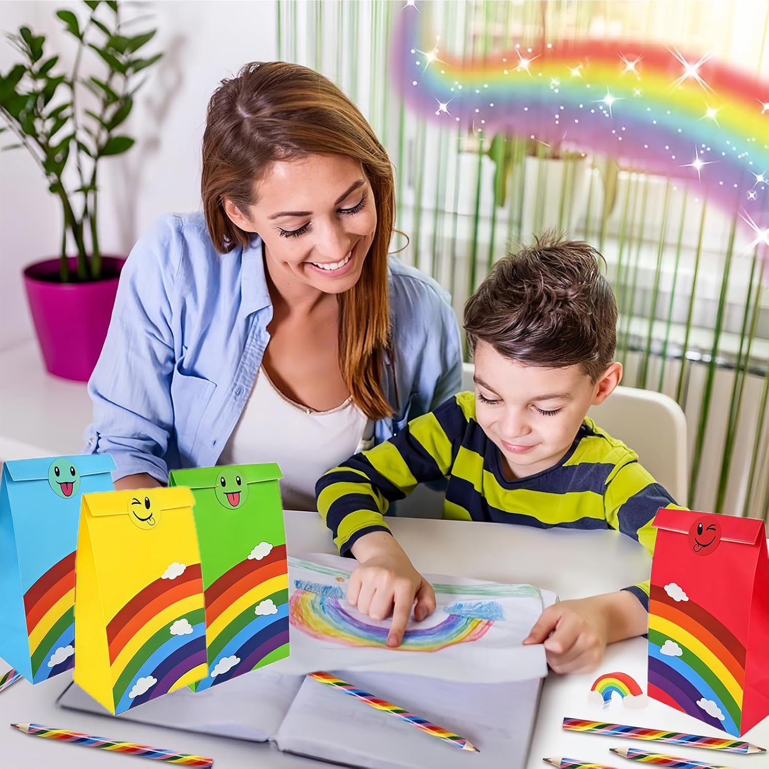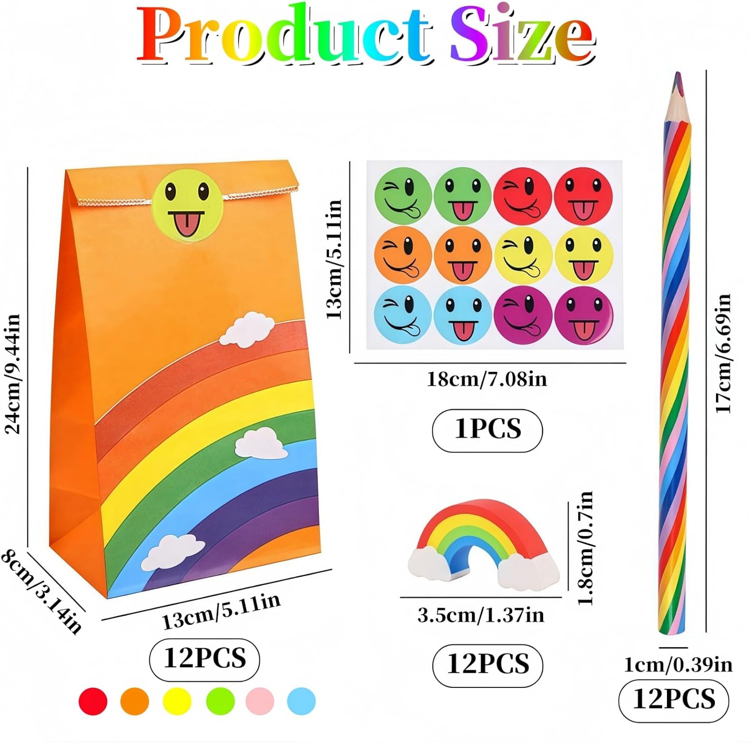 【Contenuto ricco e diversificato】Contiene 12 matite arcobaleno, 12 sacchetti regalo arcobaleno, 12 gomme arcobaleno e 12 adesivi sorridenti, offrendo una pittura completa e un'esperienza di confezionamento regalo. 【Selezione regalo multiuso】Adatto per regali di compleanno, regali per feste, regali di Natale, regali per il retro-scuola, regali di laurea e ricompense agli studenti in classe, soddisfacendo le esigenze regalo di varie occasioni. 【Materiali e design di alta qualità】Il sacchetto regalo arcobaleno è realizzato in carta kraft di alta qualità, luce e durevole, con un fondo piatto e può trasportare almeno 5,5 libbre di peso, garantendo la sicurezza e la bellezza del regalo. 【Creative Four in One Rainbow Penne】Contiene quattro colori: Rosso, Giallo, Verde e Blu possono essere ottenuti scrivendo da diversi angoli. 【Gomma arcobaleno sicura e non tossica】 realizzato in materiale TPR di alta qualità, è morbido e non tossico, non si deteriora, ha una buona capacità di cancellazione e crea un bellissimo effetto visivo.