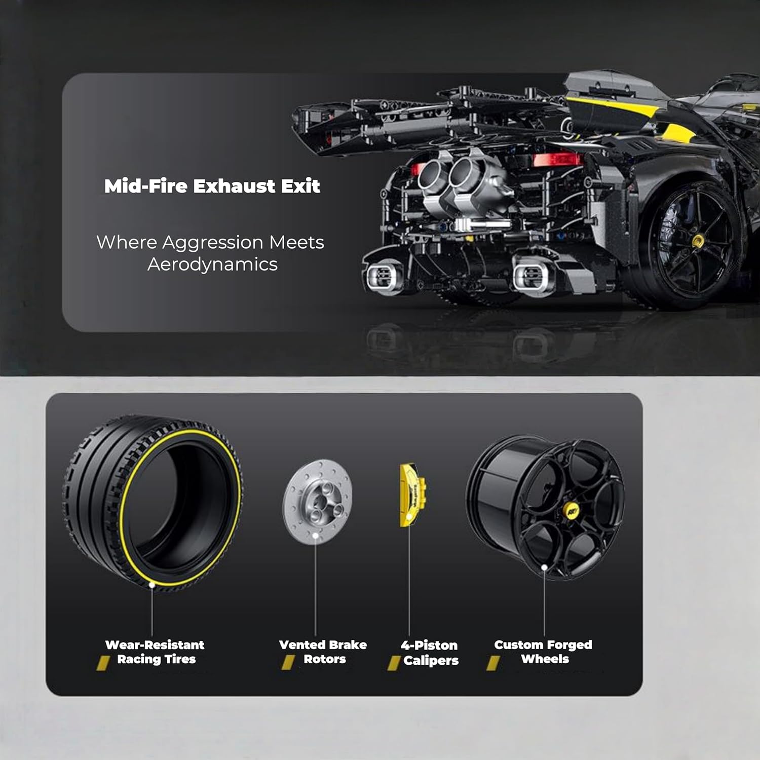 Set di costruzione avanzato per gli appassionati di auto - Questo modello di supercar in scala 1:8 è composto da 3.729 blocchi e misura 63 × 31 × 15 cm (24,8 × 12,2 × 5,9 pollici). Impegnativa e gratificante, la costruzione è il regalo perfetto per gli appassionati di auto e i collezionisti che amano progetti pratici e dettagliati. Velocità e controllo in ogni dettaglio - Dotato di caratteristiche realistiche come uno spruzzatore controllato elettricamente, un telaio mobile, uno spoiler e quattro tubi di scarico centrali. Il corpo aerodinamico e la precisione meccanica garantiscono un'esperienza di costruzione ed esposizione impressionante. Design e finiture premium ---- Esplora dettagli intricati come un motore funzionante, ruote cromate, portiere e cofano manuali, volante e un'esclusiva carrozzeria nera come una meteora. Questo modello mette in mostra l'artigianalità e l'attenzione ai dettagli che lo contraddistinguono. Design e lavorazione di alta qualità - Scopri dettagli elaborati come un motore funzionante, cerchi cromati, portiere e cofano ad apertura manuale, volante e una carrozzeria unica in Meteor Black. Questo modello si distingue per la lavorazione artigianale e la cura dei dettagli. Un regalo indimenticabile per tutte le età: questo kit per auto da corsa è un regalo indimenticabile per gli amanti delle auto, gli hobbisti o chiunque sia appassionato di design automobilistico. Sia come regalo che per costruirsi da soli, garantisce creatività, ammirazione e gioia duratura.