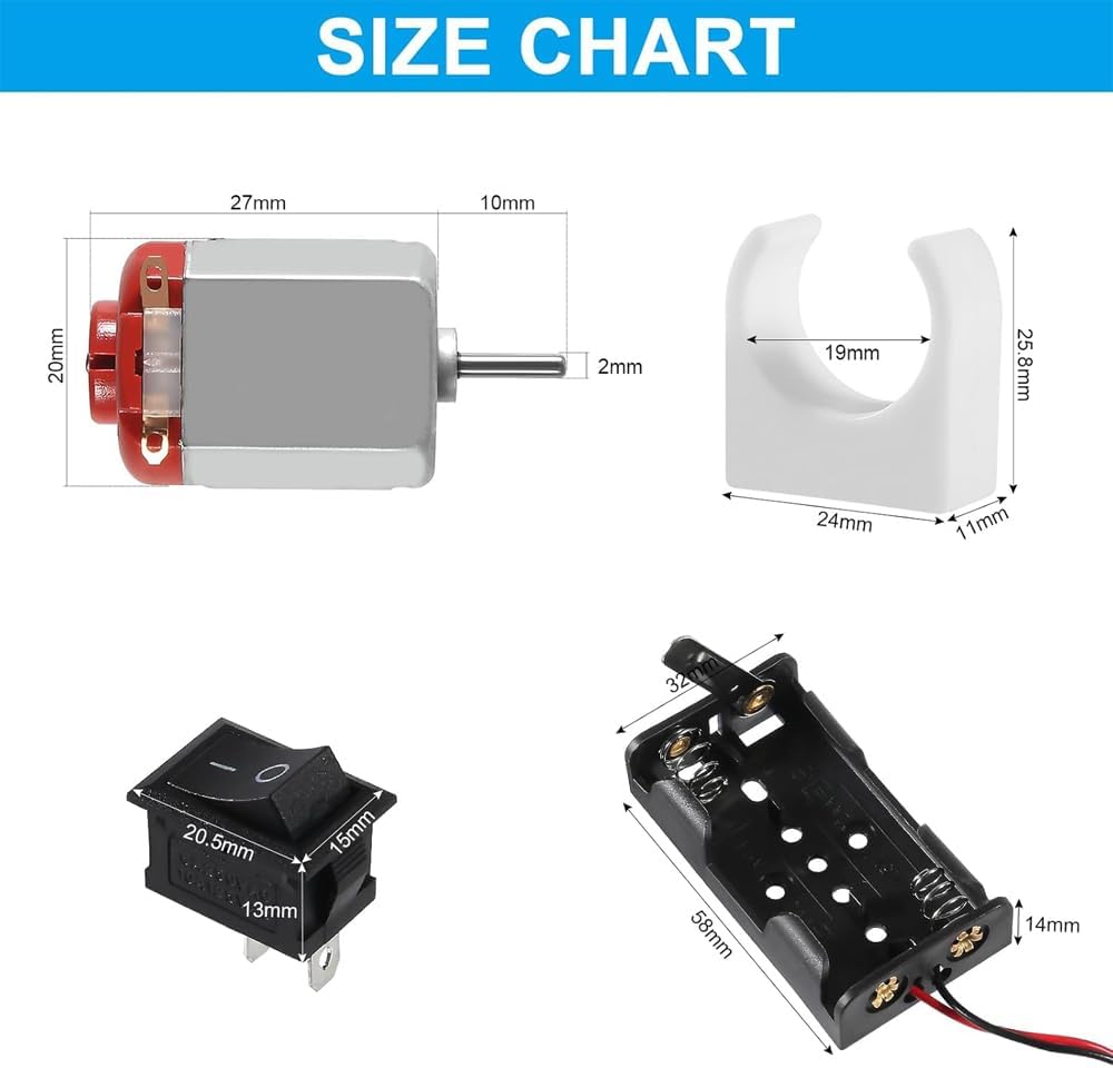 Contenuto della confezione: 6 micromotori DC, 6 portabatterie AA da 1,5 V, 5 eliche a quattro pale, 2 eliche a tre pale e 2 rotoli di cavi di prolunga, ecc. Specifiche: potenza motore DC 1,8 W, tensione 1,5 V, corrente 600 A, velocità 16000 giri/min. Portabatterie AA, lunghezza cavo esterno 15 cm, prolunga cavo 5 m. Specifiche degli accessori: elica a tre pale da 80 mm con foro da 2 mm; Elica a quattro pale da 56 mm con foro da 2 mm (in plastica), interruttore a forma di barca, due perni. Nota: durante l'utilizzo, assicurarsi di verificare se il circuito funziona normalmente per evitare scosse elettriche o cortocircuiti causati dall'alta temperatura. Applicazioni: questo set motore è perfetto per progetti scientifici fai-da-te. Puoi costruire robot, ventilatori elettrici, auto elettriche e altro ancora. Un progetto fai-da-te che favorisce l'apprendimento accademico e stimola la creatività.