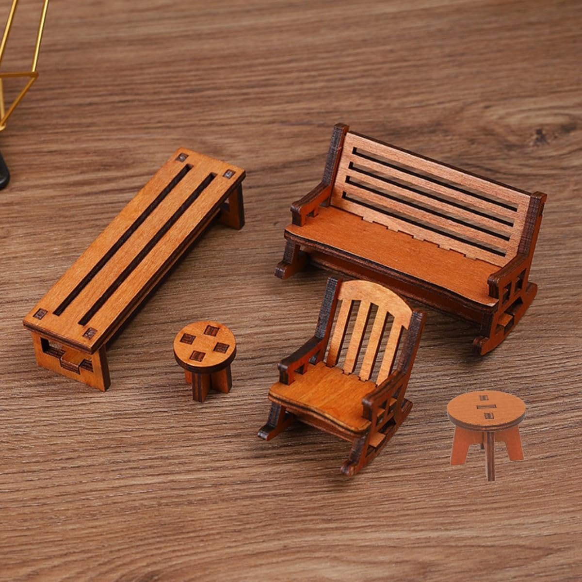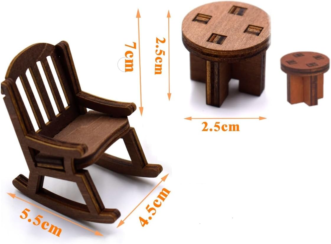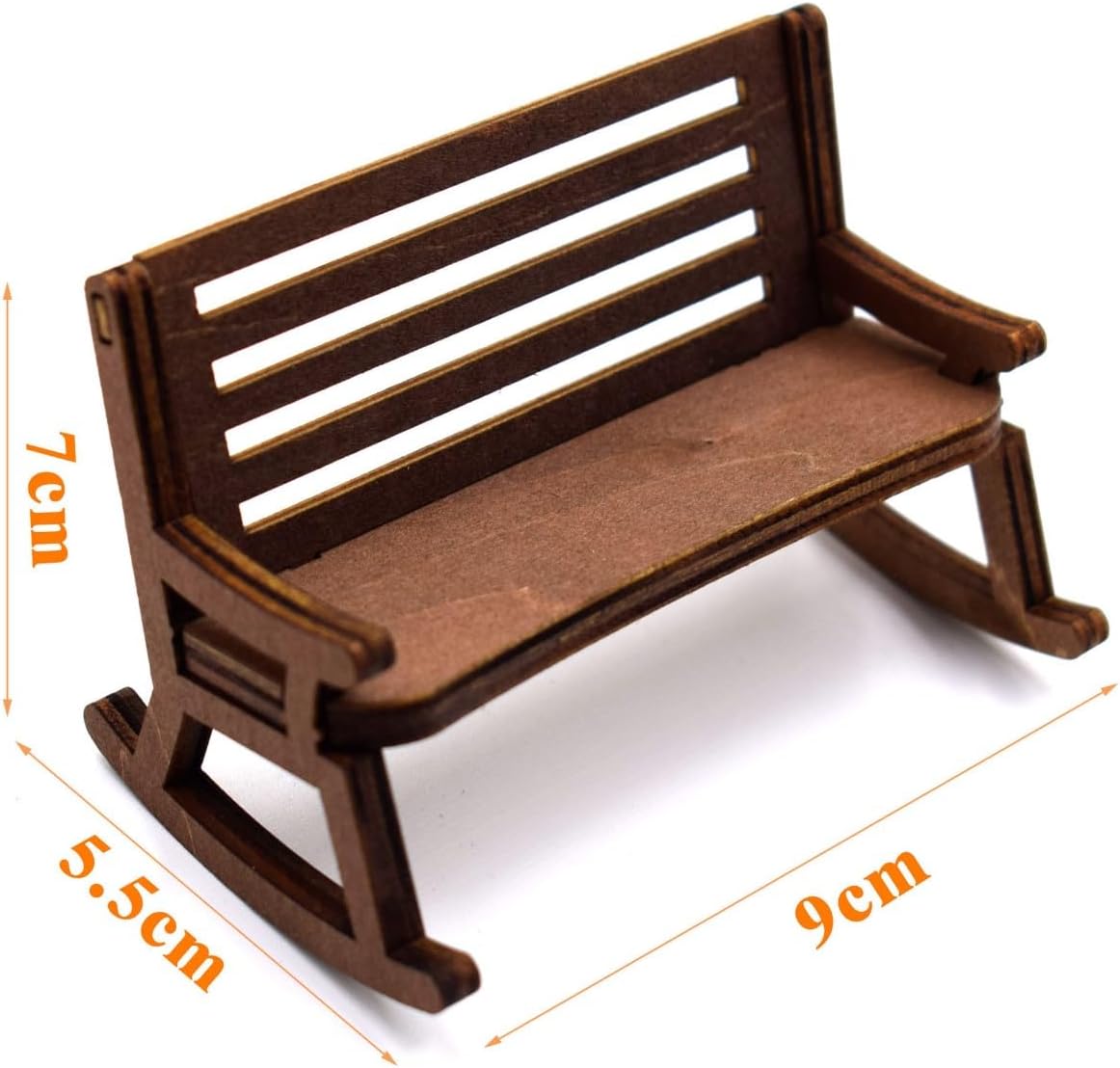 Set di mobili in legno: set di 5 mobili in miniatura di alta qualità composto da sedie a dondolo, panca e tavoli rotondi e sedia per decorazioni casa delle bambole, mini scena, giardino delle fate, ecc. Dimensioni precise: sedia a dondolo singola misura 7 cm di altezza, 4,5 cm di profondità e 5,5 cm di larghezza, realizzata in materiale spesso 5 mm; sedia a dondolo lunga per più persone misura 7 cm di altezza, 9 cm di profondità e 5,5 cm di larghezza; panca: 4,5 x 11,5 x 3 cm; sgabello rotondo: 2,5 x 2,5 cm. Tavolo: 5 x 4 cm Lavorazione dettagliata: il mini tavolo e sedia ha una struttura in legno accuratamente progettata con eleganti lamelle e struttura stabile per un uso duraturo MATERIALE LEGNO: il set di mini sedie a dondolo è realizzato in legno di alta qualità in un elegante tono marrone scuro, robusto e durevole. Dimensioni stabili: il set di mini panchine e tavolo in legno è realizzato in scala 1:12, ideale per case delle bambole classiche, scene in miniatura, giardino delle fate, decorazione di gnomi, ecc.