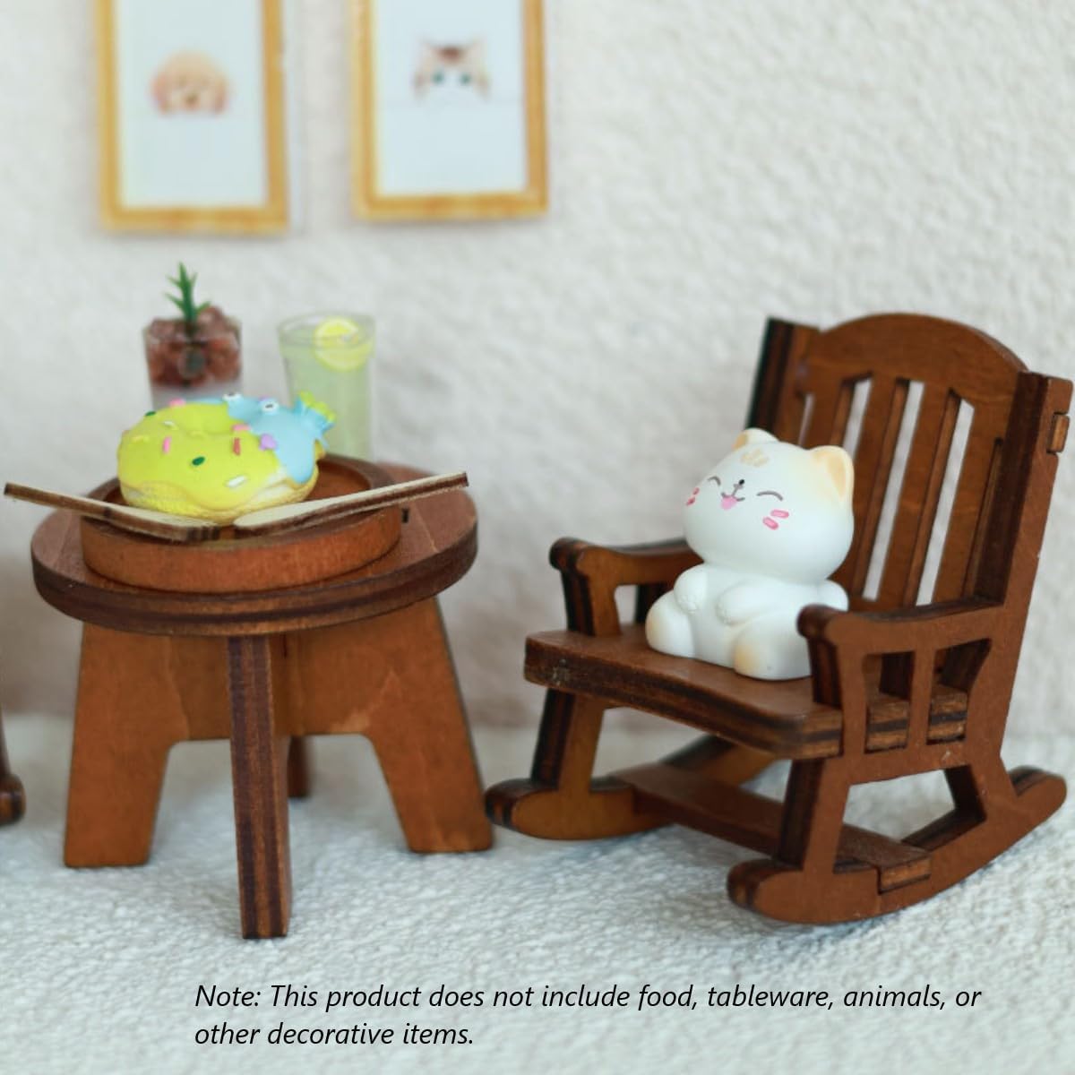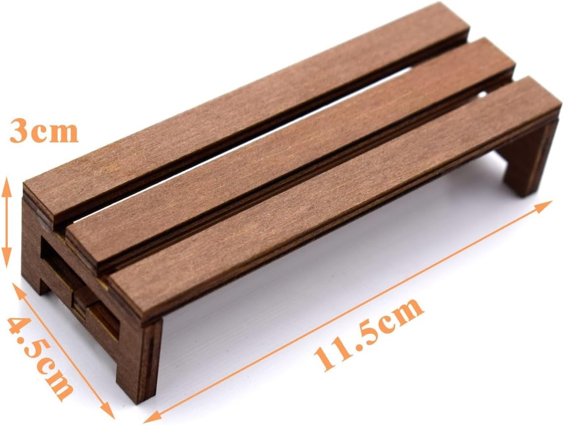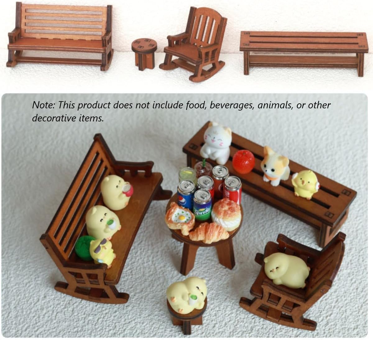 Set di mobili in legno: set di 5 mobili in miniatura di alta qualità composto da sedie a dondolo, panca e tavoli rotondi e sedia per decorazioni casa delle bambole, mini scena, giardino delle fate, ecc. Dimensioni precise: sedia a dondolo singola misura 7 cm di altezza, 4,5 cm di profondità e 5,5 cm di larghezza, realizzata in materiale spesso 5 mm; sedia a dondolo lunga per più persone misura 7 cm di altezza, 9 cm di profondità e 5,5 cm di larghezza; panca: 4,5 x 11,5 x 3 cm; sgabello rotondo: 2,5 x 2,5 cm. Tavolo: 5 x 4 cm Lavorazione dettagliata: il mini tavolo e sedia ha una struttura in legno accuratamente progettata con eleganti lamelle e struttura stabile per un uso duraturo MATERIALE LEGNO: il set di mini sedie a dondolo è realizzato in legno di alta qualità in un elegante tono marrone scuro, robusto e durevole. Dimensioni stabili: il set di mini panchine e tavolo in legno è realizzato in scala 1:12, ideale per case delle bambole classiche, scene in miniatura, giardino delle fate, decorazione di gnomi, ecc.