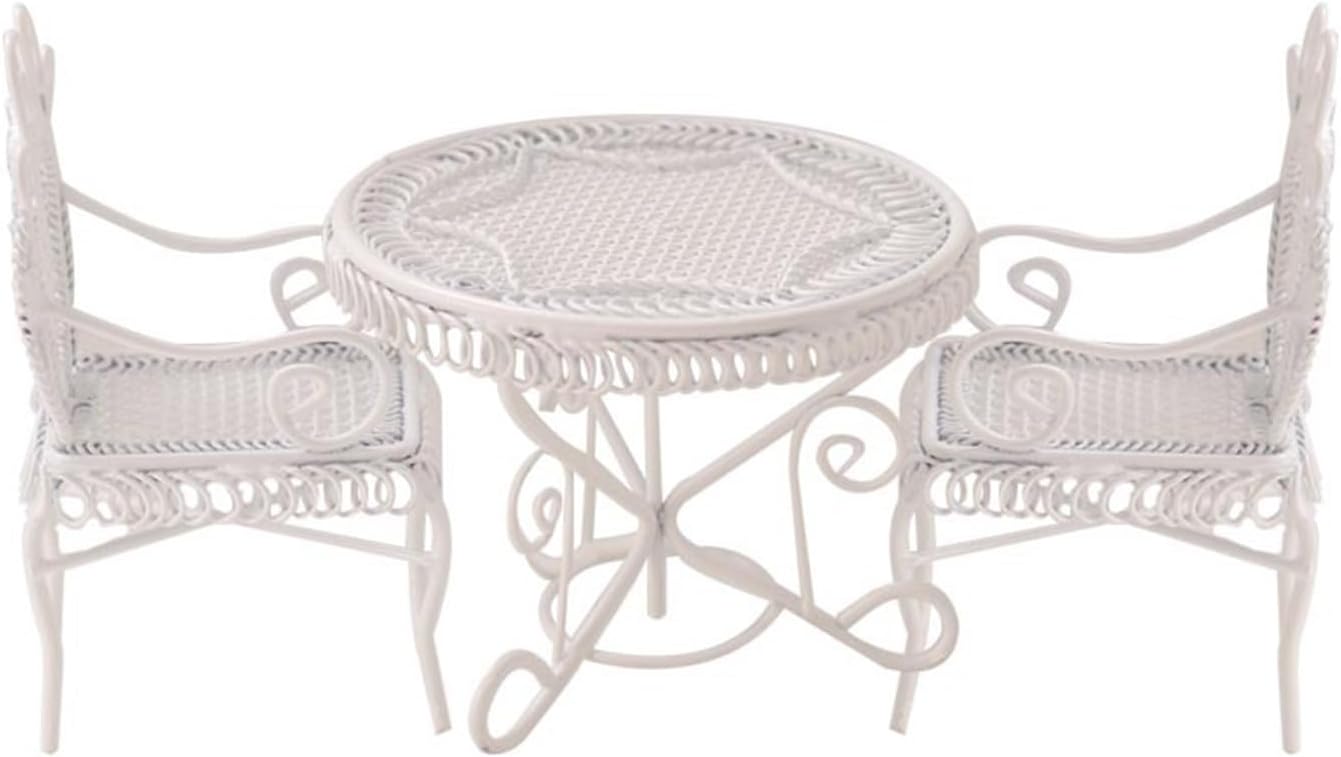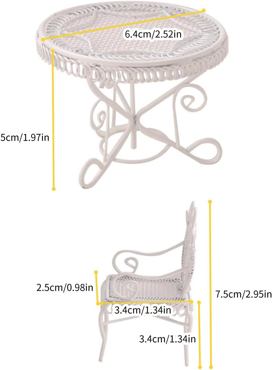 Tavolino e Sedia modello, realistico e adatto per decorazioni di case delle bambole Con una buona stimolazione e formazione educativa per i bambini, stabilire la loro capacità cognitiva dei mobili delle case delle bambole e promuovere la coordinazione occhio-mano del bambino Struttura in ferro, resistenza all'usura, sicura per i bambini Adatto per giochi di finzione e anche per decorazioni per case delle bambole Un set da gioco decorativo, non un vero tavolino da caffè