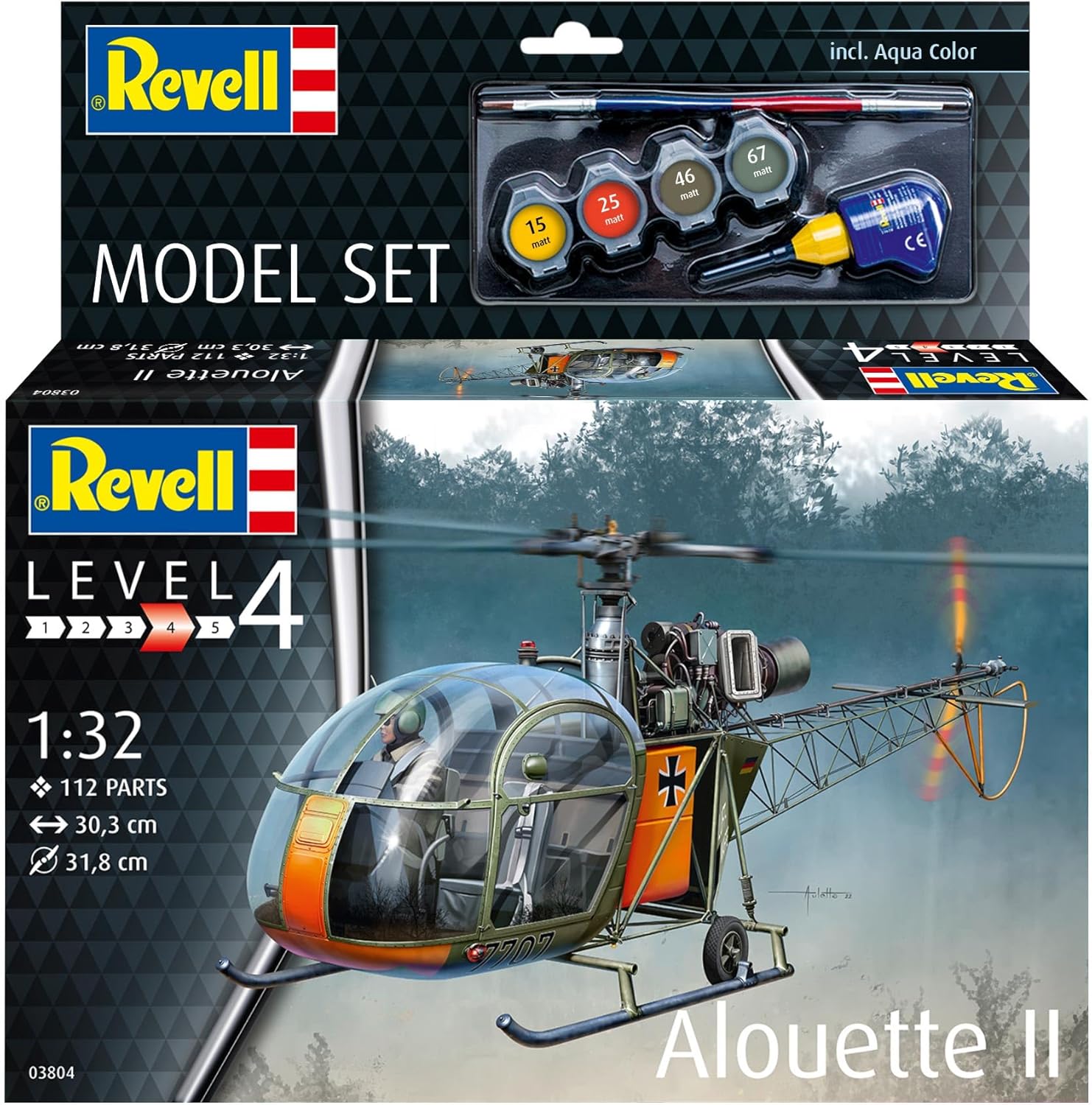 ELICOTTERO DI FABBRICAZIONE FRANCESE: L'Alouette II è un elicottero prodotto in Francia; È considerato uno dei primi tipi di elicotteri ad essere prodotto in serie ed è stato rivoluzionario per lo sviluppo di elicotteri idonei al volo e riparabili con motori a turbina a gas STRUTTURE SUPERFICIALI DETTAGLIATE: Il kit modello contiene strutture superficiali dettagliate che sono modellate autenticamente sull'elicottero originale, Questi dettagli conferiscono al modello un aspetto realistico e rendono il suo assemblaggio un progetto emozionante ROTORE GIREVOLE: Il rotore del modello è girevole, il che aggiunge autenticità e realismo, Ciò consente ai modellisti di presentare l'elicottero in diversi stati di volo e di ricreare scene dinamiche DECALCOMANIA AUTENTICA: Il set include una decalcomania autentica che consente ai modellisti di personalizzare il proprio modello, Ciò consente di riprodurre in dettaglio vari segni e iscrizioni dell'Alouette II COLLA E PENNELLO INCLUSI: Oltre alle vernici di base, nel set sono inclusi anche colla e pennelli, che facilitano l'inizio del modellismo, I modellisti hanno quindi tutto il necessario per assemblare e dipingere il modello in un unico set