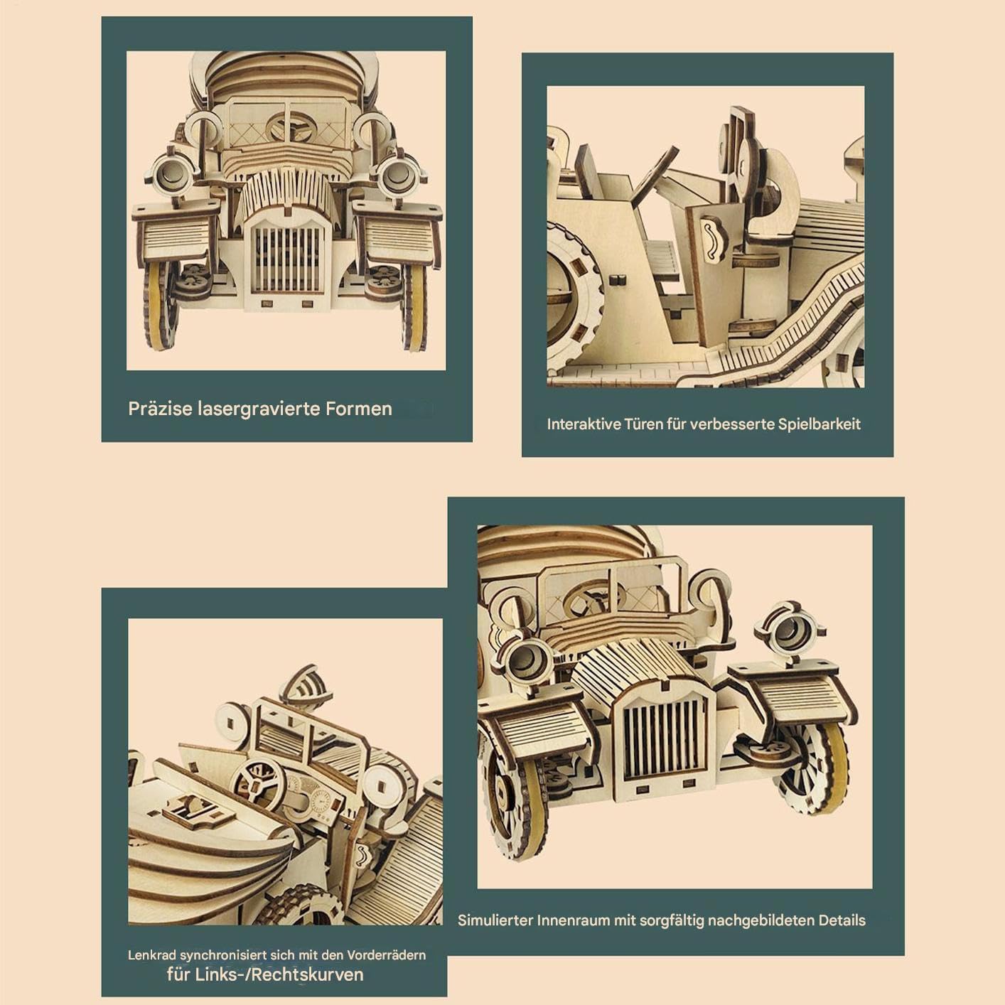 Superfici in legno di alta qualità: accentua la texture naturale delle venature e la soddisfazione tattile, con superfici accuratamente lavorate senza schegge e una finitura affidabile a prova di bambino per tutte le età L'arte vintage incontra la funzionalità: la capottina rimovibile e la scorrevolezza rendono questa auto puzzle in legno 3D la scelta ideale per collezionisti e appassionati d'epoca che apprezzano l'artigianato senza tempo Esperienza di montaggio consapevole:: progettato per alleviare lo stress, il puzzle in legno da 220 pezzi auto offre una costruzione a strati che nutre la pazienza e premia con un senso di realizzazione attraverso una progressione pianificata Esperienza di costruzione consapevole: questo puzzle in legno 3D mostra precisione vintage tagliata al laser e combina una stimolazione immersiva della concentrazione con un'accattivante esperienza artistica rilassante grazie all'artigianato curato nei dettagli. Divertimento coinvolgente: promuove il pensiero spaziale attraverso un'esperienza di montaggio 3D interattiva con opere d'arte in legno decorative per creare ambienti di lavoro accattivanti
