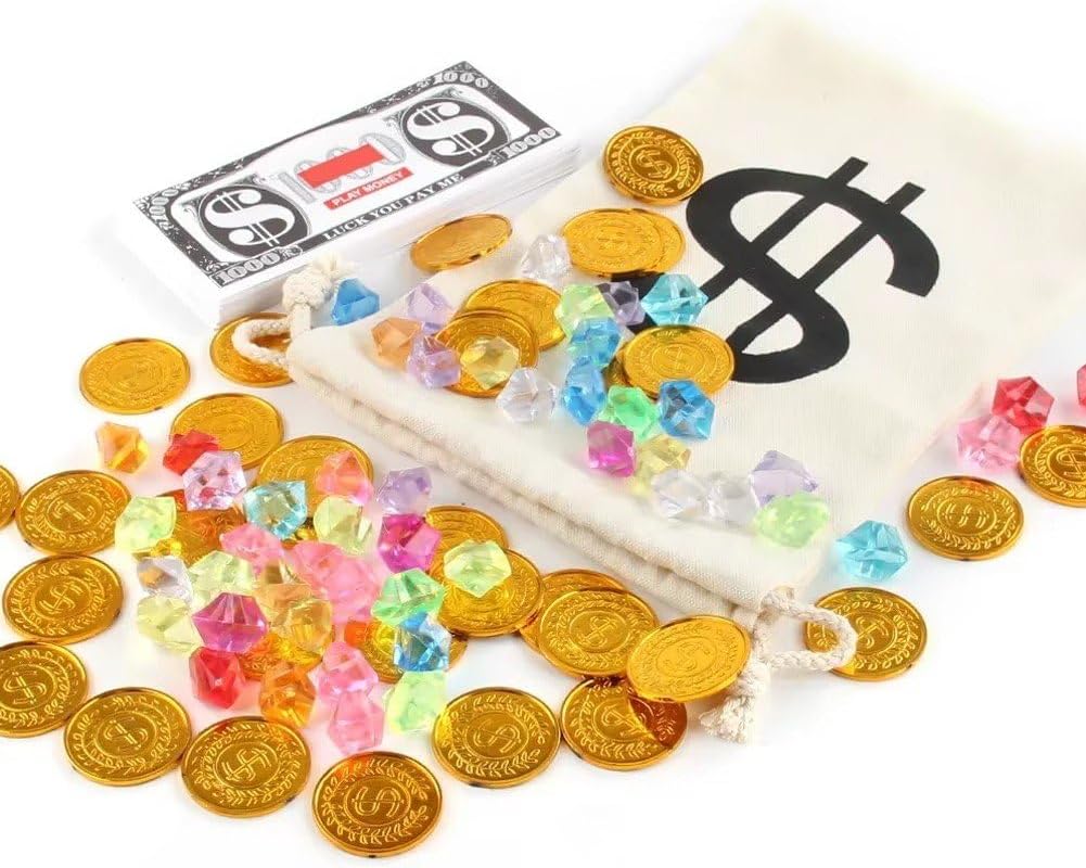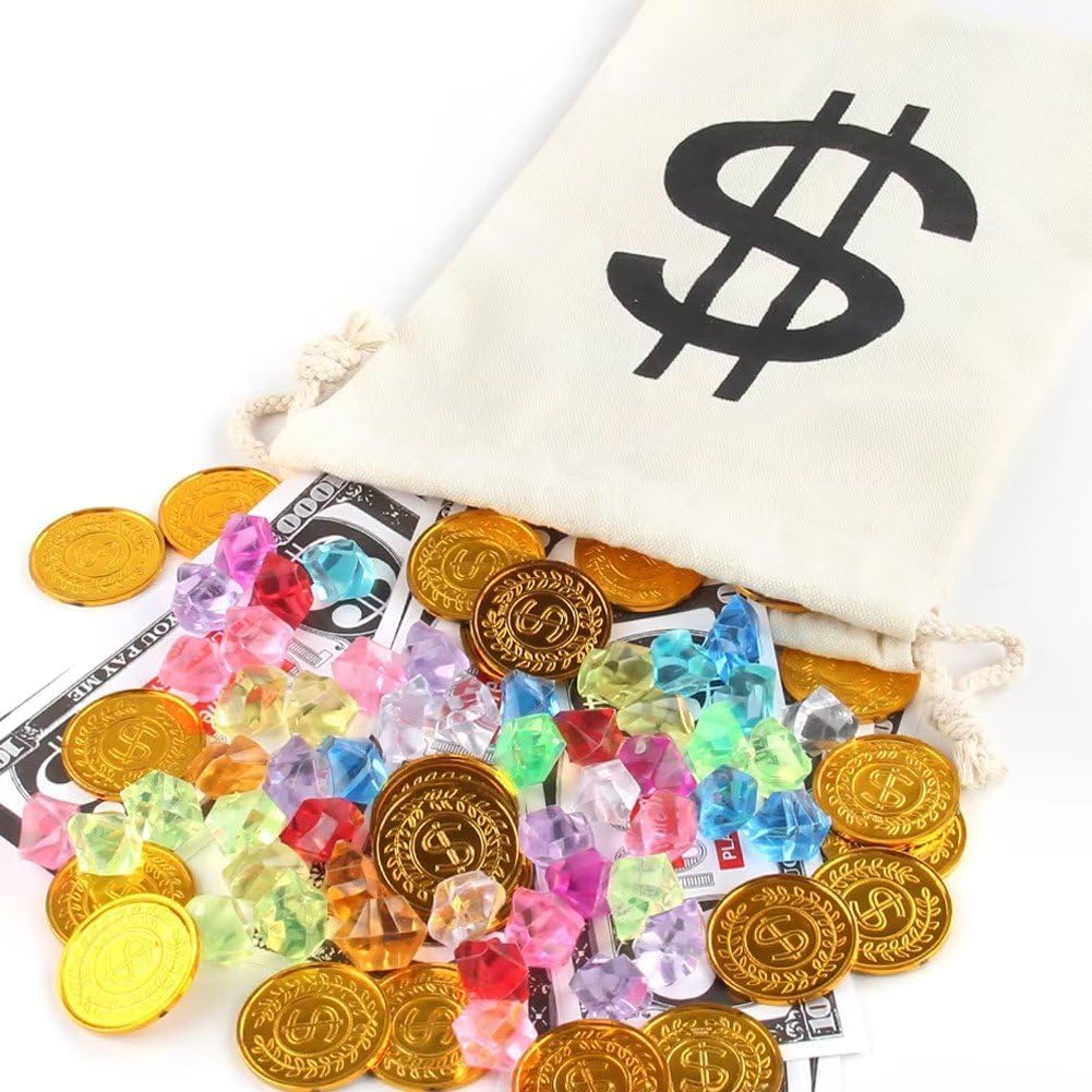 Ampia gamma di: questi set di gioielli pirata possono essere utilizzati per abbellire acquari, giocattoli, nonché idee per costumi pirata, sfondi di film, ripieni di sacchetti di caramelle, che sono bei regali per feste, decorazioni e premi. Motivi interessanti: ogni moneta d'oro dei pirati ha un'immagine in rilievo, molte persone adoreranno giocare con queste monete dei pirati nei giochi dei pirati. Squisita fattura: le monete d'oro e le gemme brillano, i colori vivaci brilleranno alla luce del sole, aggiungendo lustro alla tua vita. Materiale di qualità: il pirata colorato e le monete d'oro sono realizzati in plastica affidabile e sicura, robusta e affidabile, adatta per decorazioni per feste. Bello: queste monete e gemme di plastica sono molto adatte per feste a tema pirati, feste di Halloween, feste di compleanno, carnevali, oggetti di scena, decorazioni per feste e molto altro ancora.