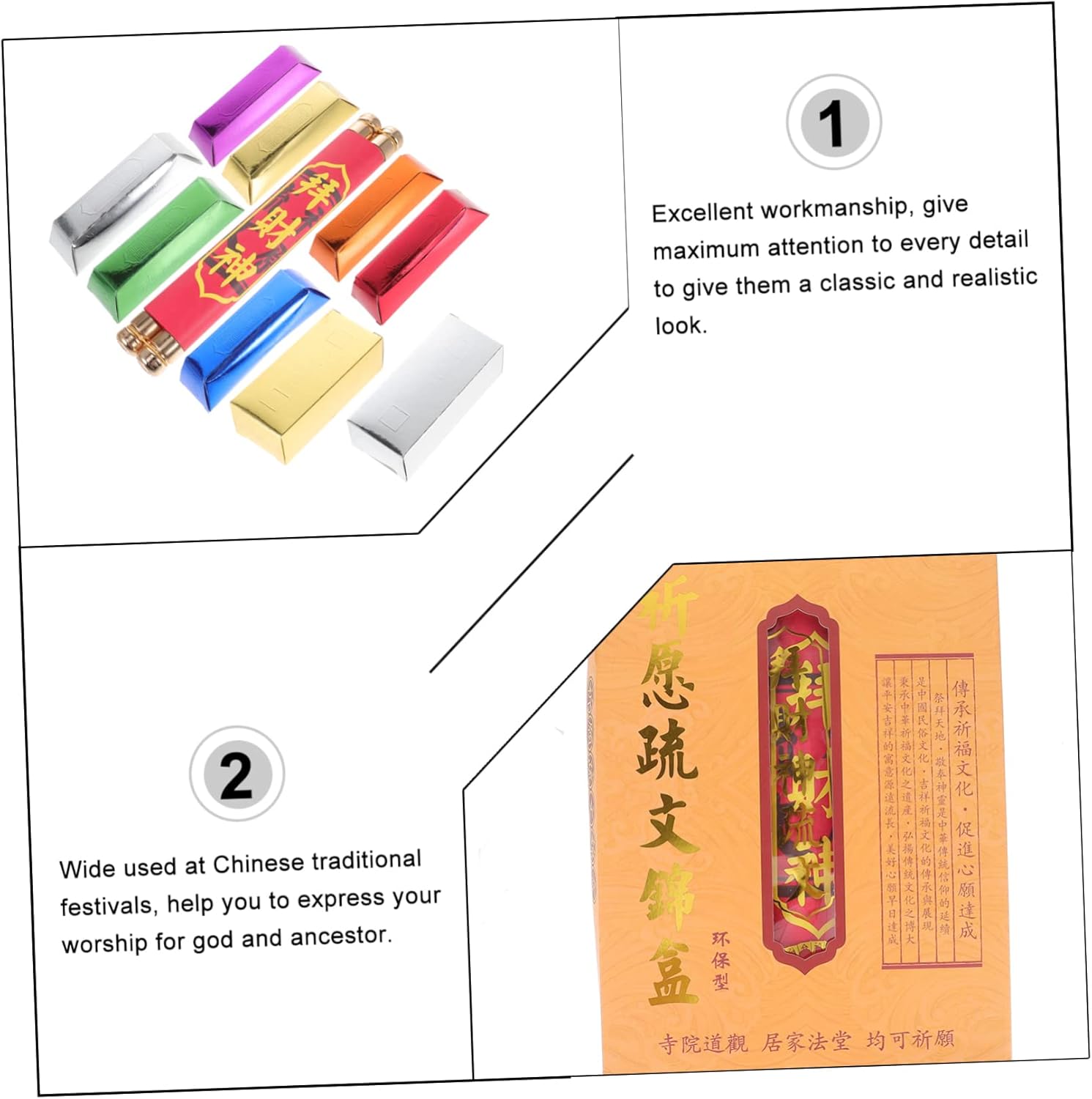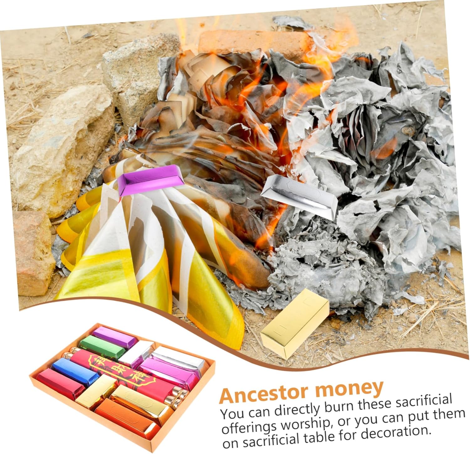 Sacrificare il denaro: la cultura tradizionale per augurare saggezza, navigazione tranquilla, salute, ricchezza e prosperità, contanti. Decorazione estetica della stanza vintage: sebbene sia semplice nel design, è così pratica quando la usi. Offerte: lavorazione artigianale e materiale rendono queste offerte realistiche e sante, offrendo carta moneta. Brucia denaro ancestrale: porta fortuna con queste carte ancestrali o . Cinese: puoi bruciare queste offerte direttamente o posizionarle sul tavolo delle offerte per la decorazione.