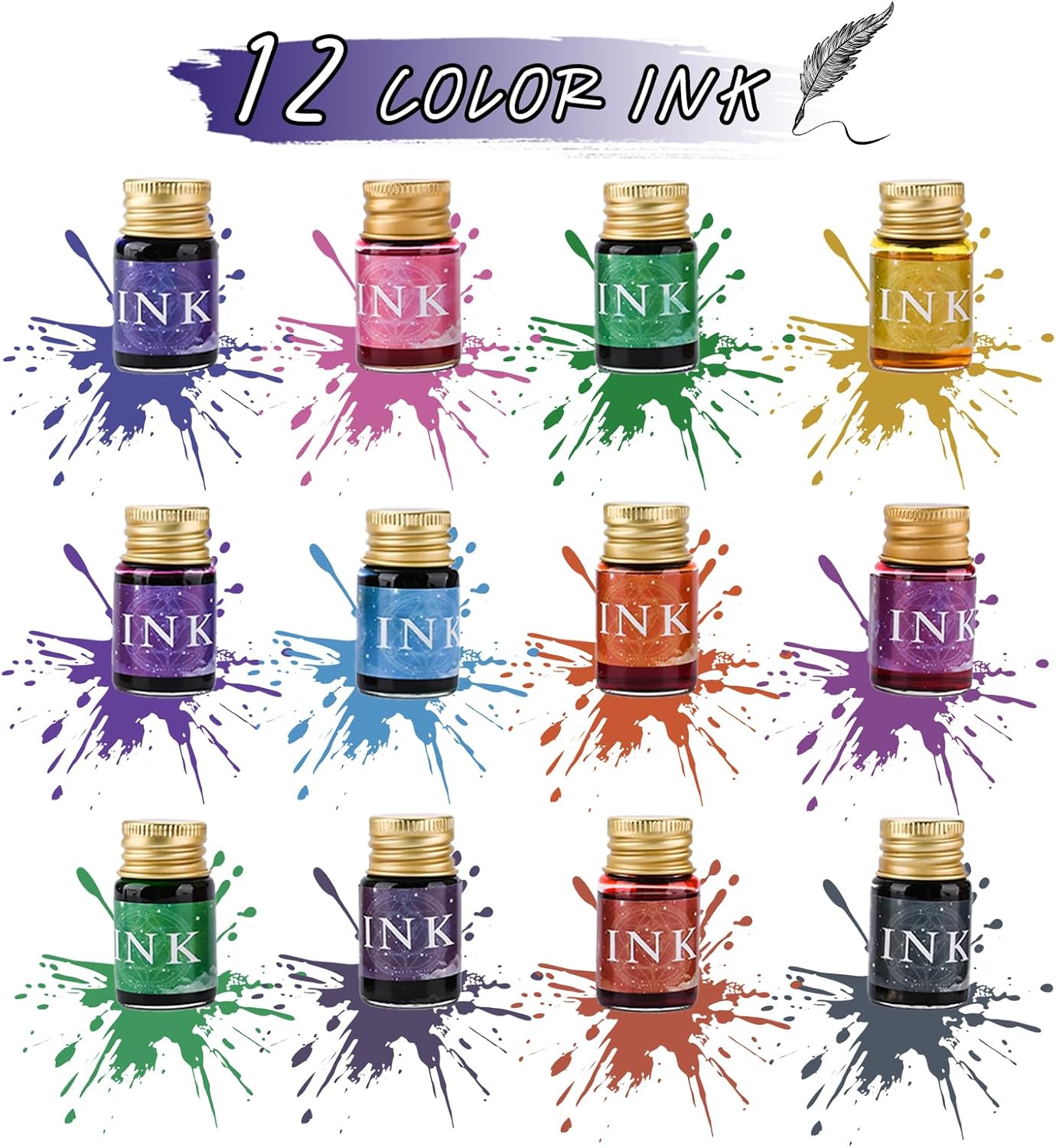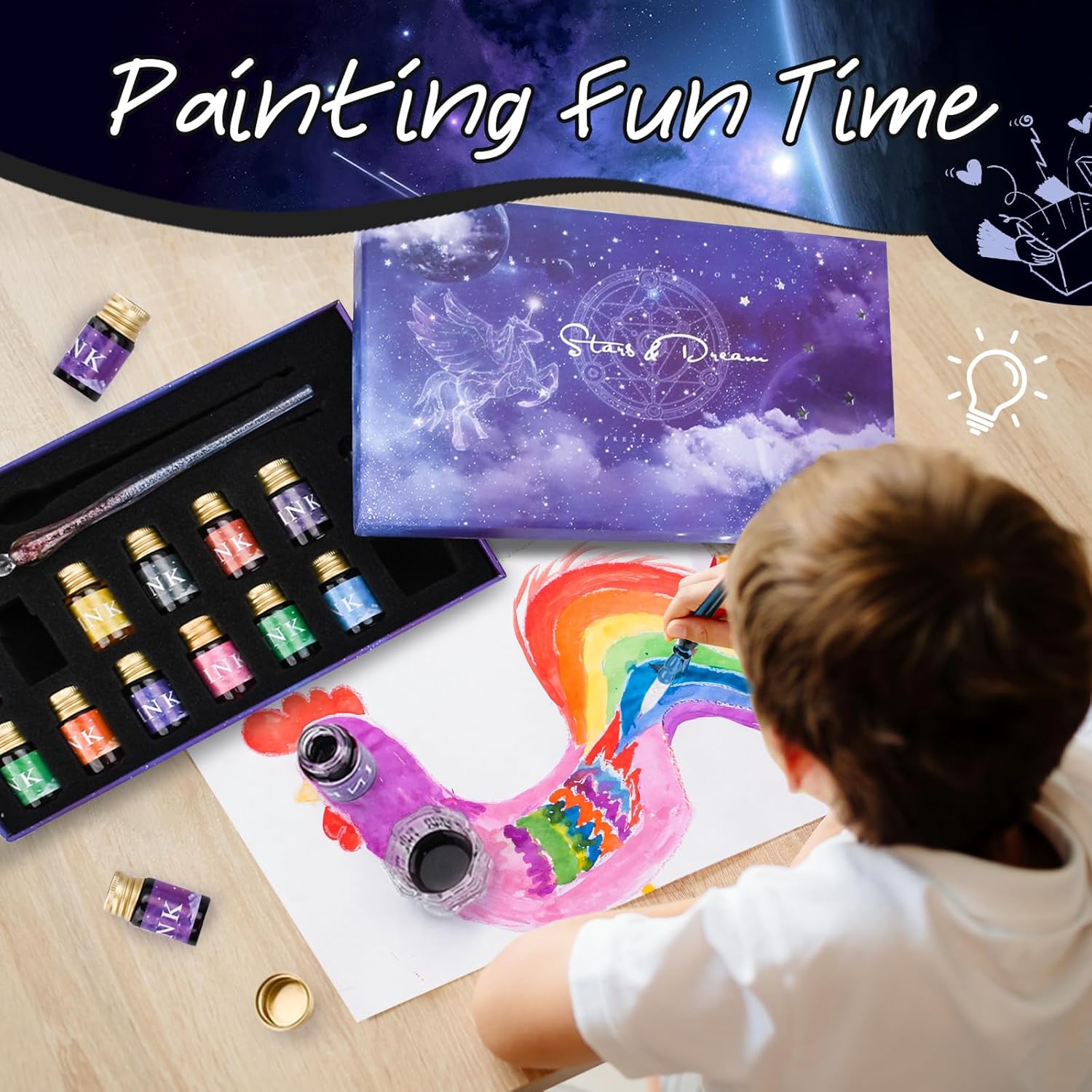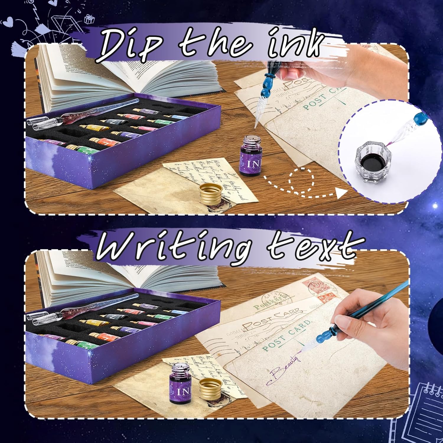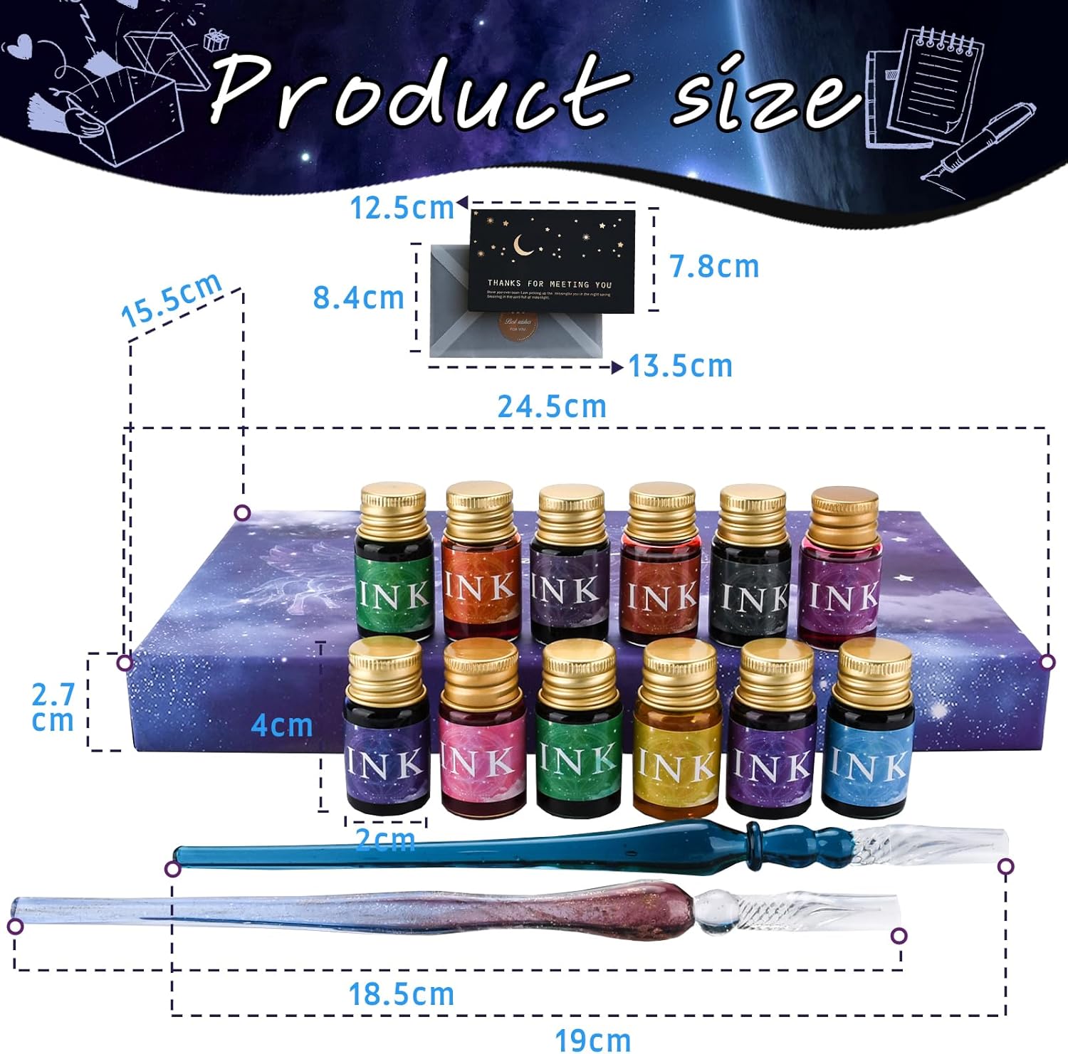 🖋️Set di penne in vetro di alta qualità: questo set di penne in vetro di alta qualità include due penne di diversi colori, 12 flaconi di inchiostro di vari colori, un portapenne in vetro, un contenitore per la pulizia e una splendida confezione regalo con motivo a cielo stellato. Una ricca selezione di colori di inchiostro ti aiuta a creare opere migliori 🌌Esperienza di scrittura fluida: realizzato in vetro di alta qualità, il motivo a spirale sul pennino migliora l'assorbimento dell'inchiostro, consentendogli di scorrere lungo le scanalature durante l'uso, offrendo un'esperienza di scrittura più duratura e fluida 🌠Facile da usare e da pulire: scrive 40-50 caratteri per tratto. Grazie alla sua eccellente idrosolubilità, è sufficiente risciacquare con acqua e asciugare con un fazzoletto o un asciugamano per cambiare colore, rendendolo estremamente comodo da usare 🌈Regalo raffinato ed elegante: splendidamente confezionato e progettato, questa penna regalo elegante e lussuosa è perfetta per scrivere diari, lettere, schizzi o dipingere. È un regalo perfetto per scrittori, calligrafi, artisti, amici e familiari 🌟Nota: agitare delicatamente l'inchiostro prima di ogni utilizzo. Ogni flacone è dotato di un sigillo anti-perdita per evitare perdite di inchiostro e garantire che possa essere conservato in un luogo fresco e buio dopo l'uso