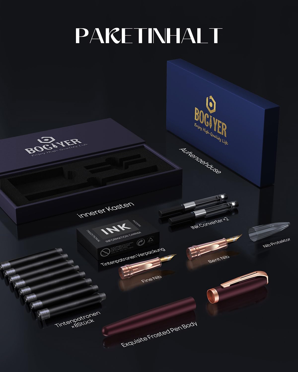 QUALITÀ ECCELLENTE - Penna stilografica ricaricabile realizzata in metallo di alta qualità, punta in titanio, con impugnatura antiscivolo, che è comoda e non scivola via facilmente, parti fatte a mano e di alta precisione, che rendono la connessione di ciascuna parte più precisa e perfetta, forniscono alta precisione e eccellente comfort di scrittura per varie occasioni. PENNA STILOGRAFICA BOCIYER PREMIUM WARRIOR SERIES - I designer BOCIYER hanno lavorato al design per anni, conferendo a ogni penna stilografica una finitura multistrato attraverso opacizzazione, lucidatura e incassatura. Il design splendidamente aerodinamico di questa splendida penna la fa sembrare una spada da samurai che ti accompagnerà attraverso la Foresta Nera per vedere l'alba e catturare i piccoli momenti della vita. UNA SCELTA REGALO SQUISITA - Ogni penna stilografica per scrivere ha una confezione abbinata di alta qualità e la sua confezione è di qualità gioielleria, rendendola un perfetto set regalo con penna. Un lussuoso astuccio regalo per penne, è un regalo straordinario per te, la famiglia, la persona amata, gli amici, i compagni di classe, gli insegnanti o i colleghi amministrativi, i partner commerciali o assolutamente chiunque altro. ESPERIENZA DI SCRITTURA PERFETTA - Questa bellissima penna stilografica può essere utilizzata come una pratica penna per calligrafia, poiché questa penna utilizza un pennino in titanio di altissima qualità e un pennino per calligrafia professionale, il sistema di alimentazione dell'inchiostro più avanzato e le cartucce d'inchiostro anti-intasamento più avanzate, in modo che l'inchiostro sia liscio e liscio e le linee siano precise e impeccabili, offrendoti un'esperienza di scrittura perfetta. ACQUISTA CON FIDUCIA - Riceverai un set di penne stilografiche Bociyer Deluxe, abbinato alla bellissima confezione e include punta media lucidata a mano in titanio, pennino artistico (largo), 8 cartucce d'inchiostro e convertitore di inchiostro*2. Goditi anche il nostro servizio clienti 24 ore su 24 e, se c'è un difetto nel prodotto, lo sostituiremo finché non sarai soddisfatto o rimborseremo immediatamente il 100%.