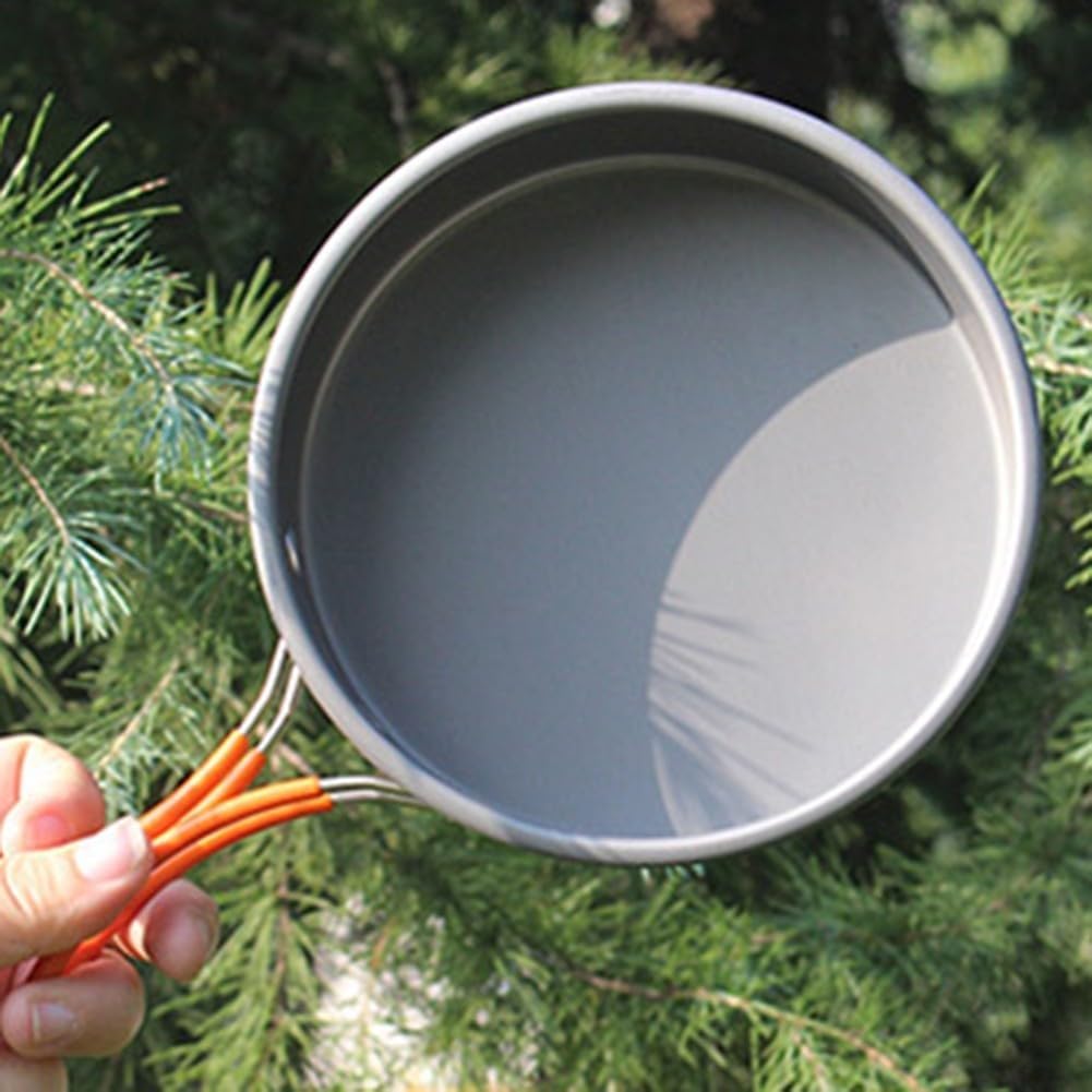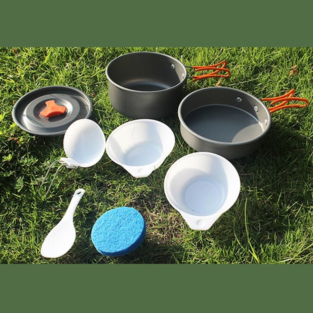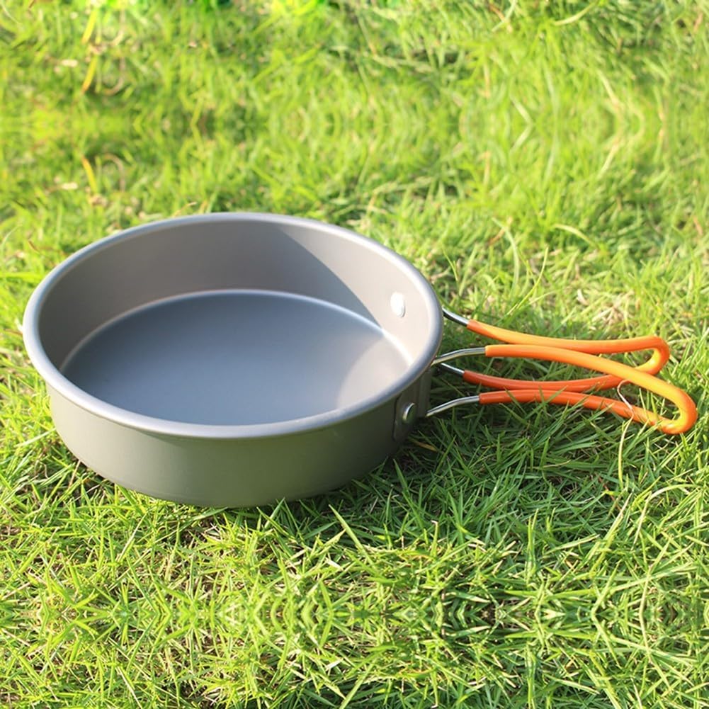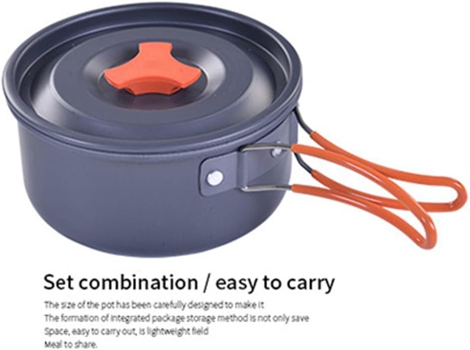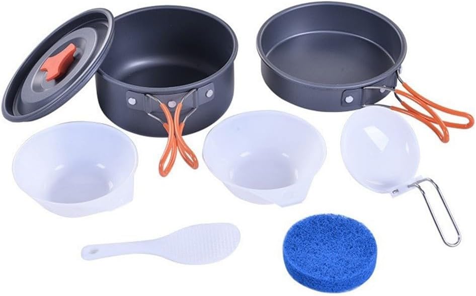 :100:10 100% Set di pentole da campeggio portatile: questo set compatto è di lunga durata e facile da trasportare, progettato per 1-2 persone con un design a nido che consente di risparmiare spazio nello zaino durante i viaggi, rendendolo adatto per escursioni e avventure in campeggio", " Kit di cottura: include una pentola da 0,95 litri, una padella da 0,53 l, due ciotole, un cucchiaio, una spatola per riso e una spugna per la pulizia: tutto ciò di cui hai bisogno per i pasti all'aperto, realizzato in alluminio anodizzato duro per un'eccellente resistenza al calore e un trasporto leggero ", "Design di nidificazione: tutti i pezzi si adattano perfettamente insieme per ottimizzare lo spazio di imballaggio, fornendo comodità per i campeggiatori minimalisti con dimensioni come pentola da zuppa 150 x 70 mm e padella 155 x 35 mm, per una facile conservazione e una configurazione rapida",